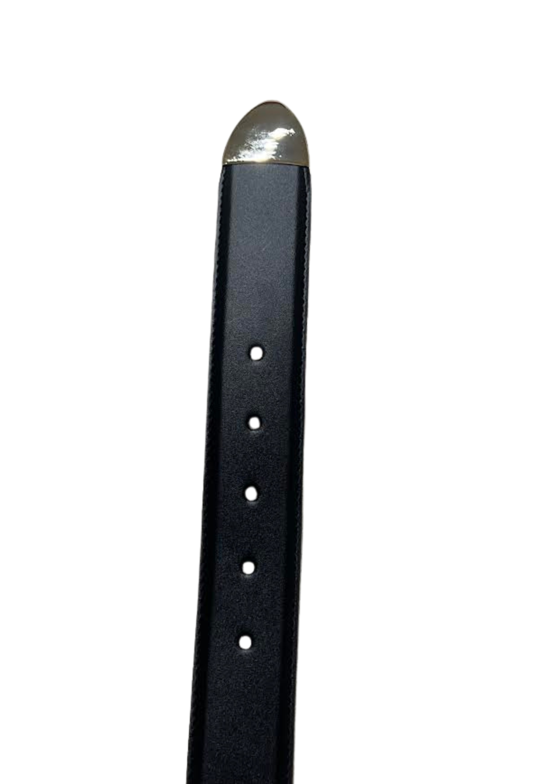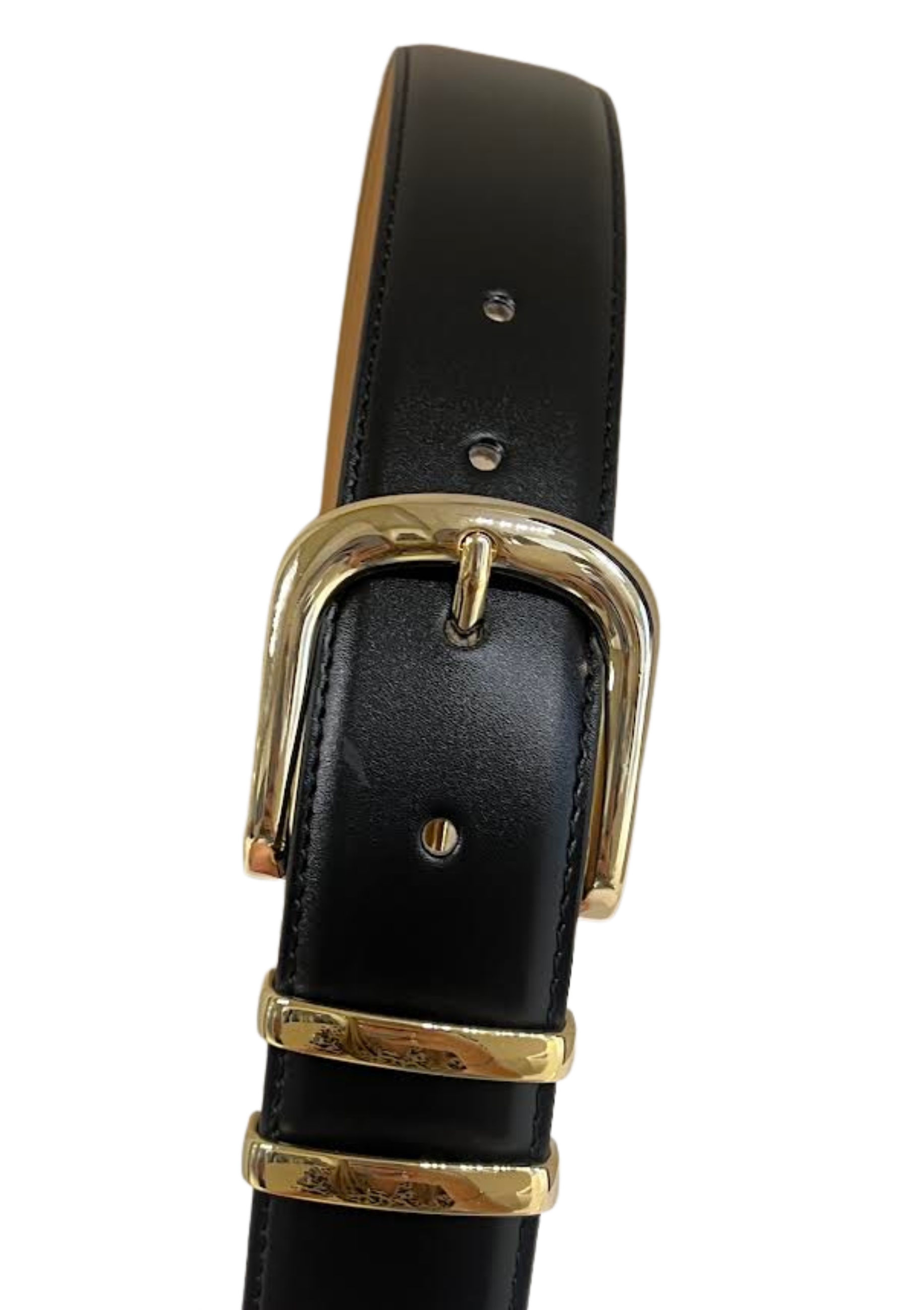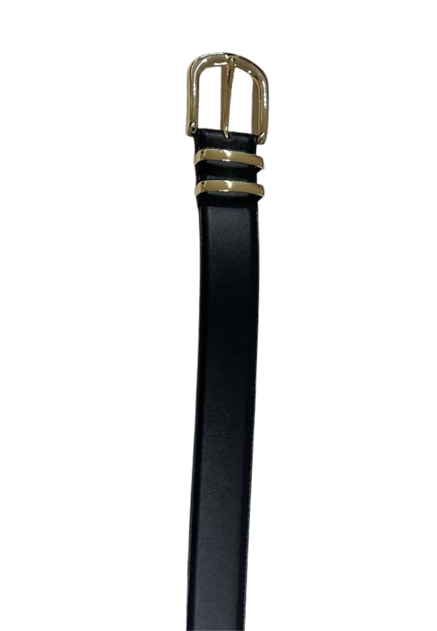Ceinture en cuir noir brillant avec finitions intérieures en cuir léger. Il a une boucle arrondie en métal doré, combiné avec des passants et aussi une pointe dorée, pour une touche élégante et raffinée. Un accessoire classique et polyvalent, parfait pour compléter le look formel ou chic.