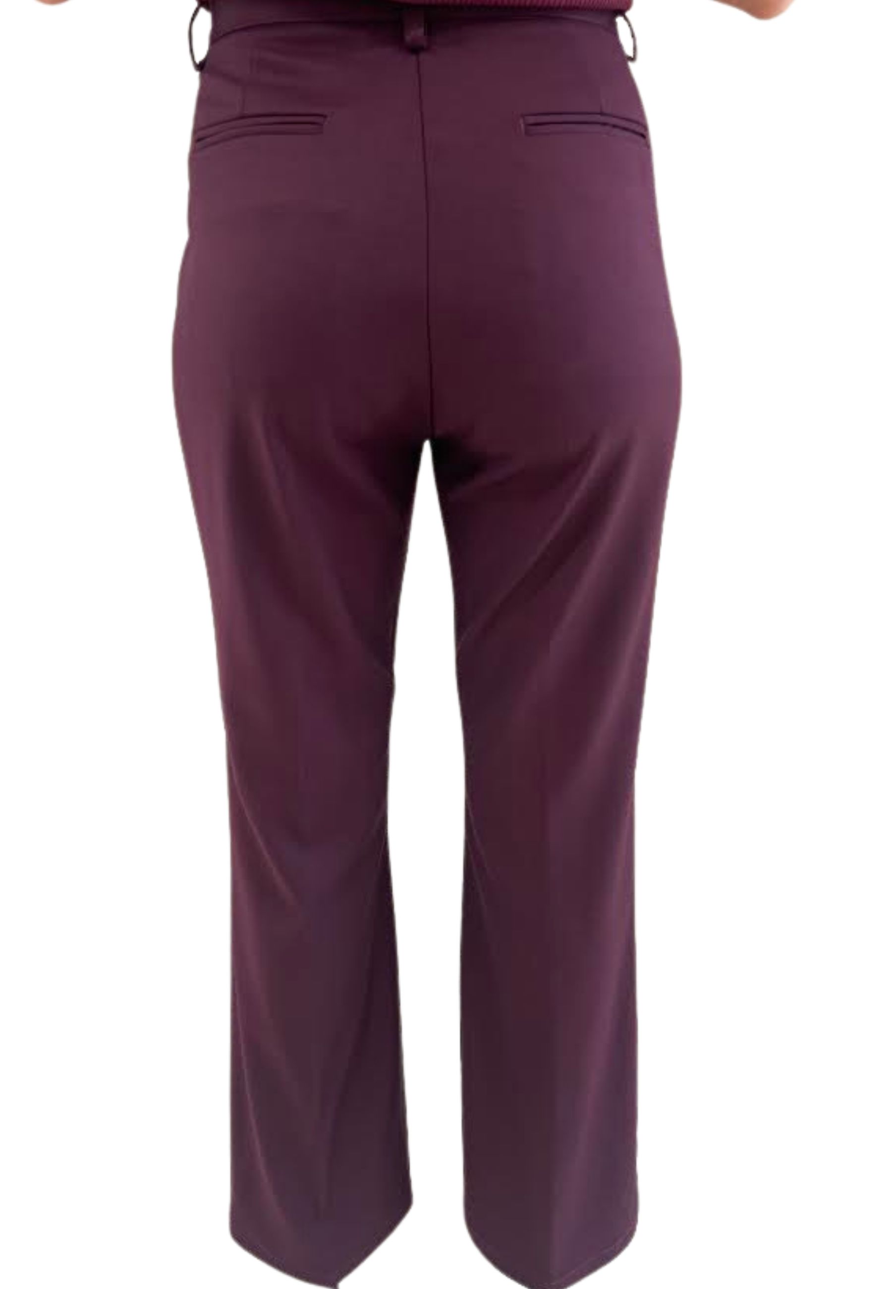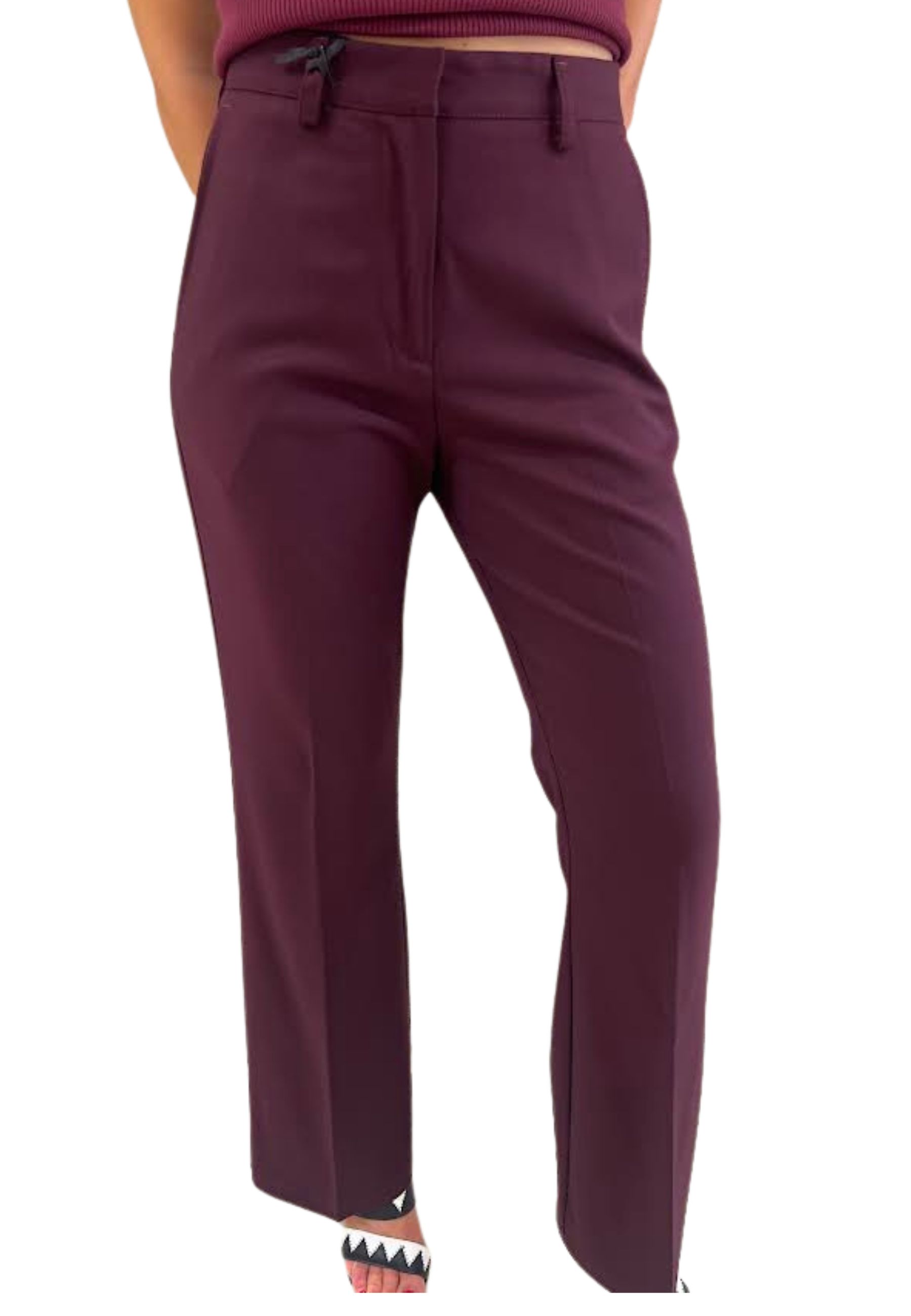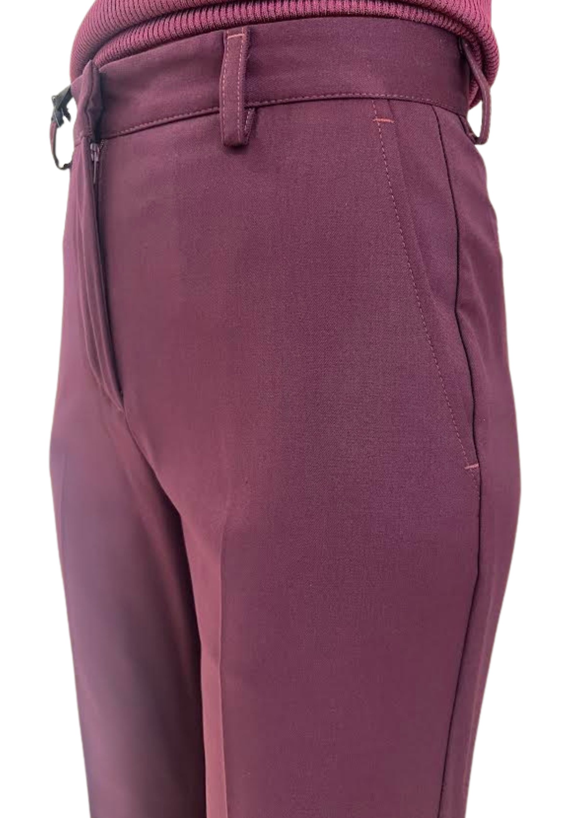 Pantalon taille haute en tissu liquide bordeaux, avec ligne droite et coupe classique. Il dispose de boucles de taille, fermeture avant cachée et pli central pour un effet élégant et mince.