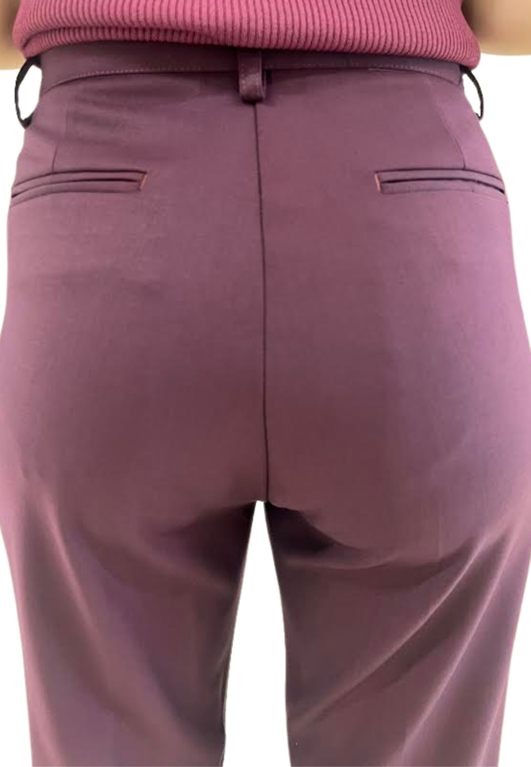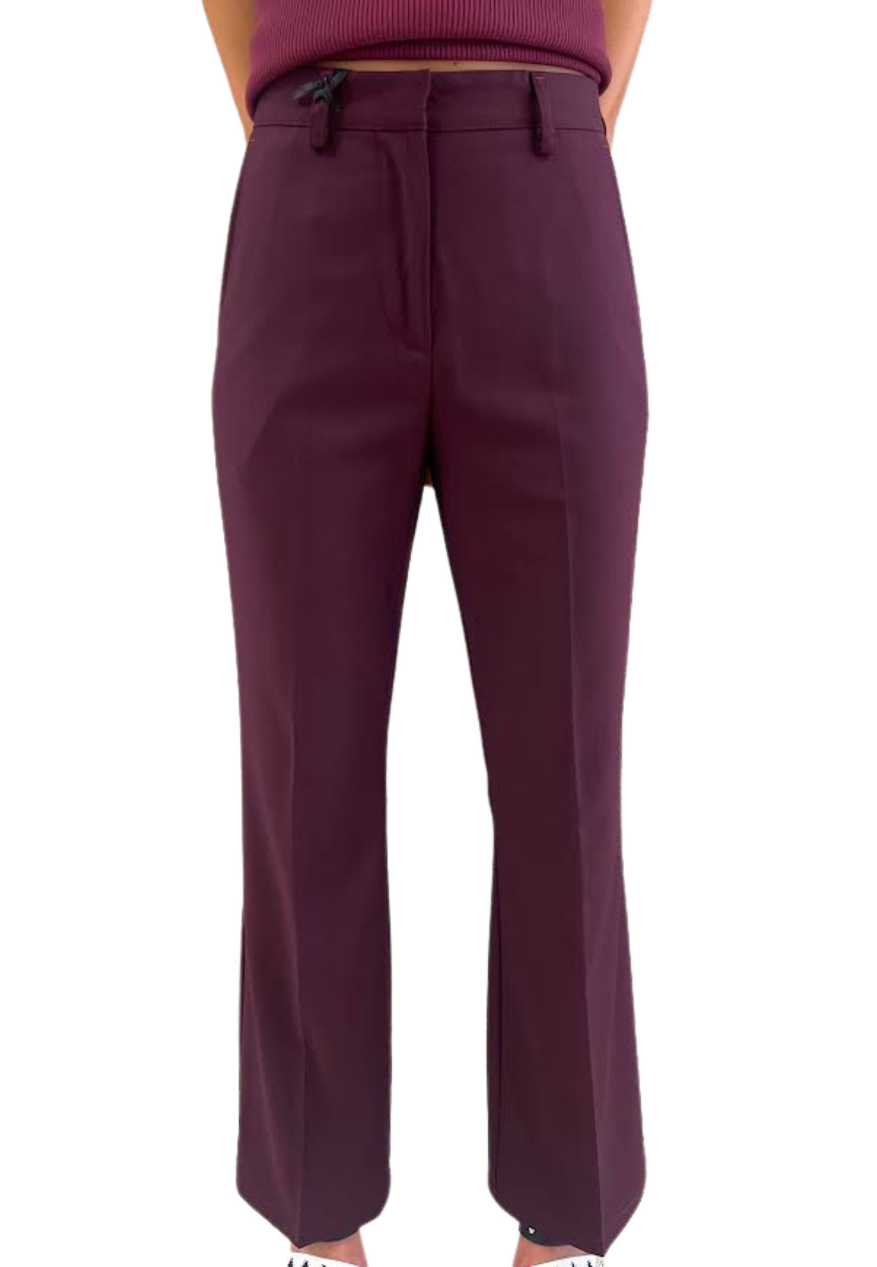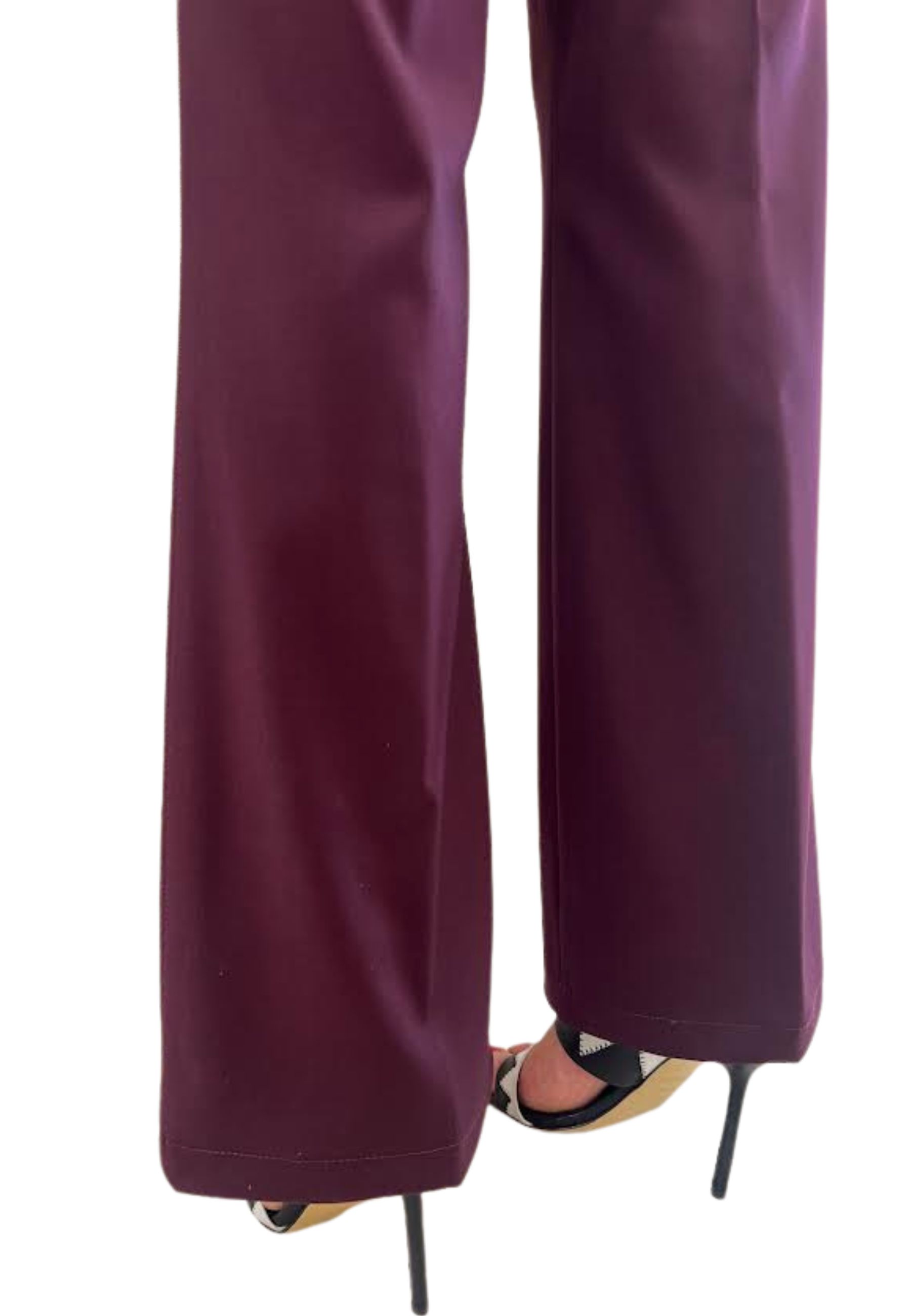 Pantalon taille haute en tissu liquide bordeaux, avec ligne droite et coupe classique. Il dispose de boucles de taille, fermeture avant cachée et pli central pour un effet élégant et mince.