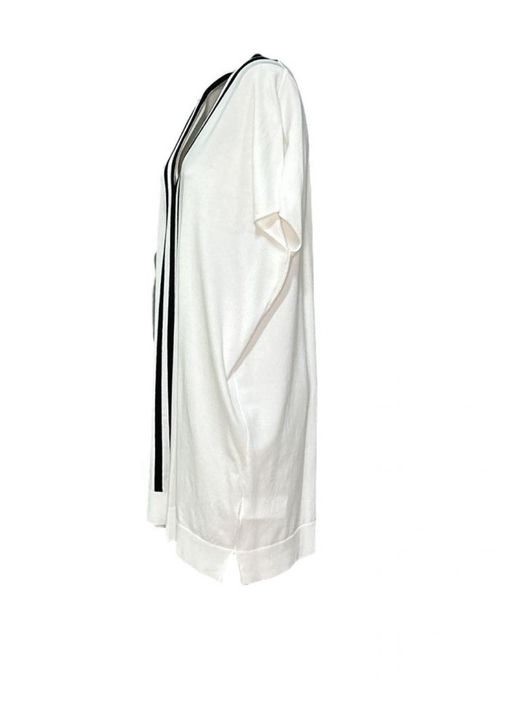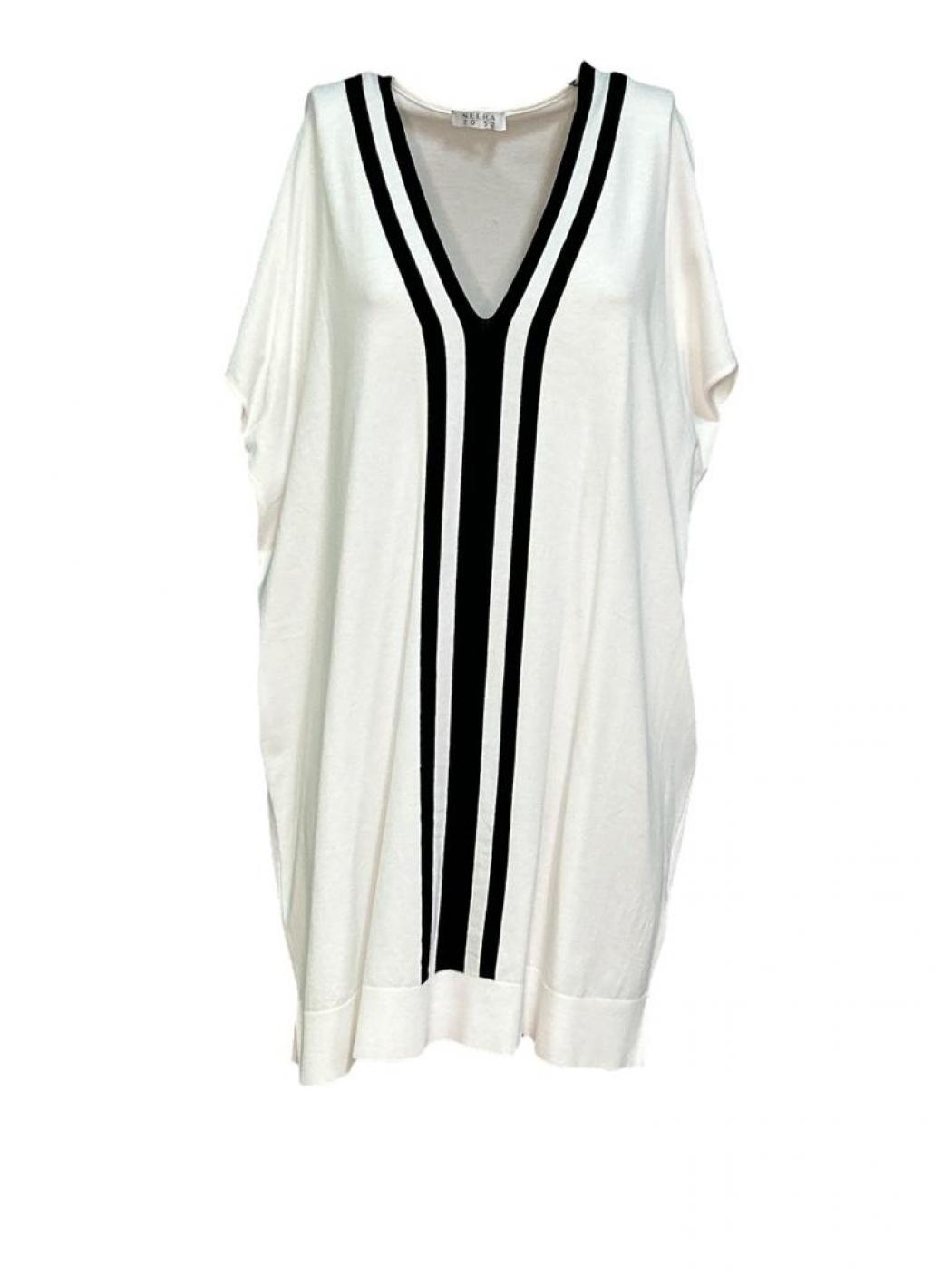Robe avec col V et manches aletta, en blanc avec bandes en noir