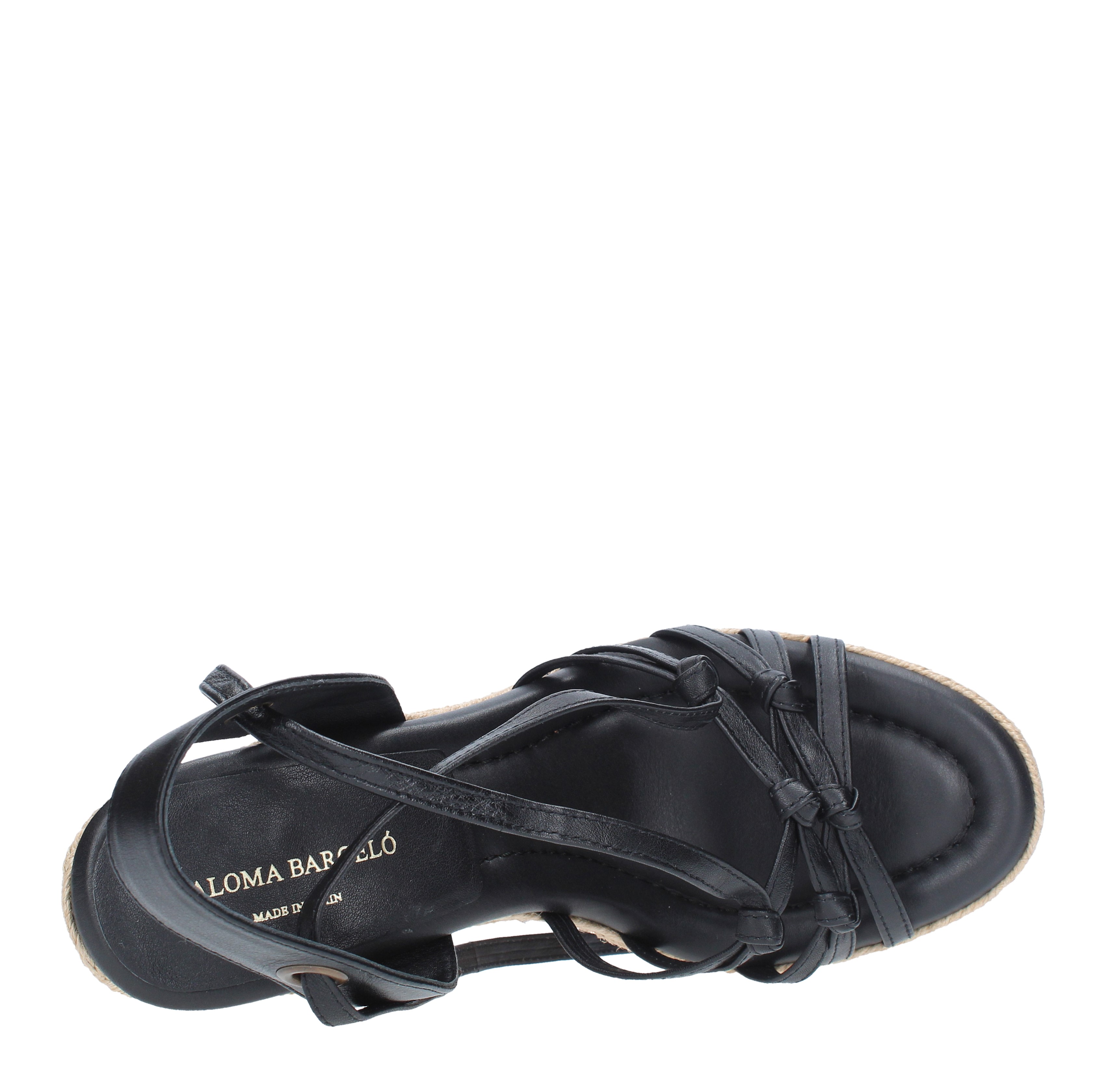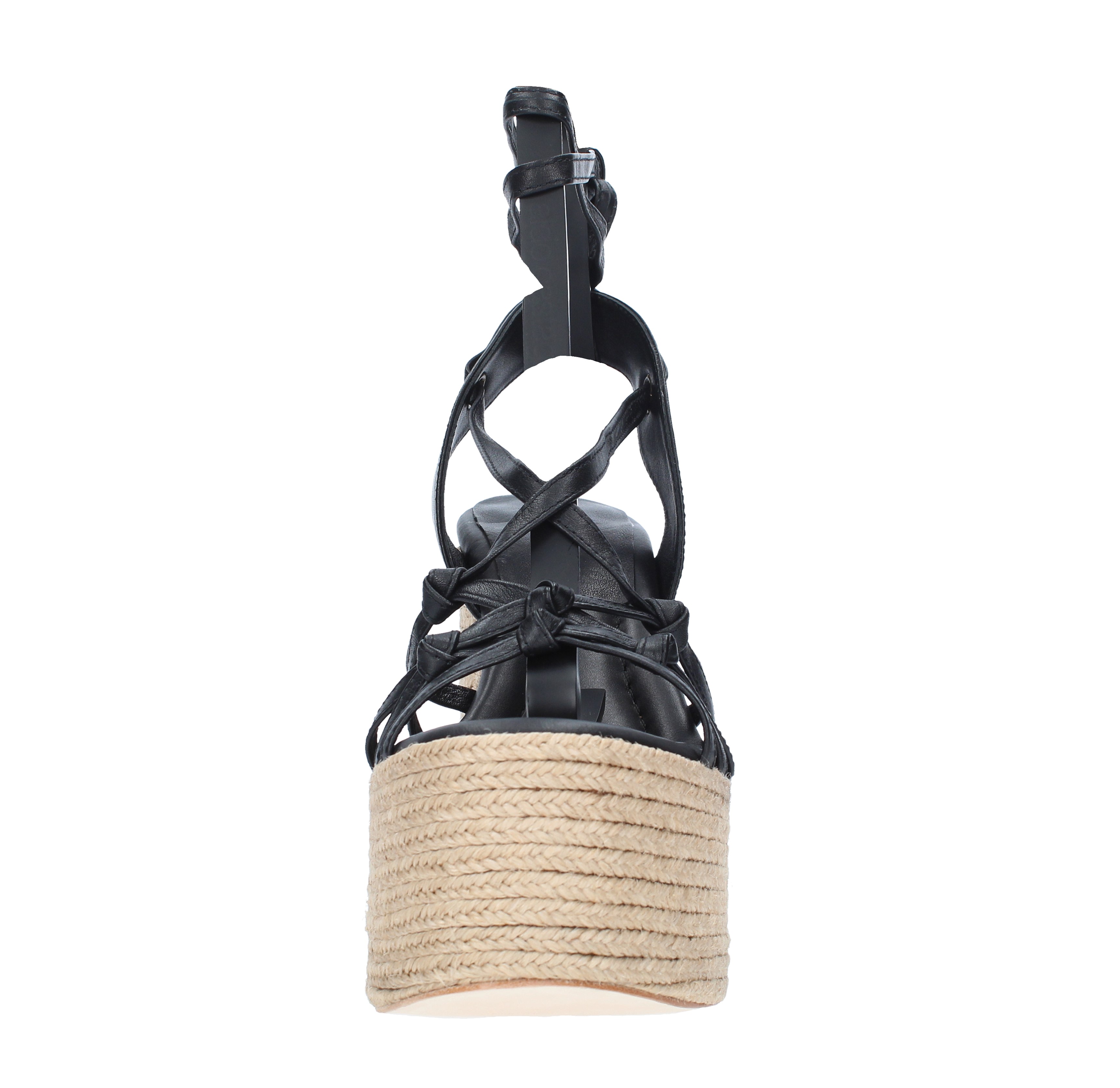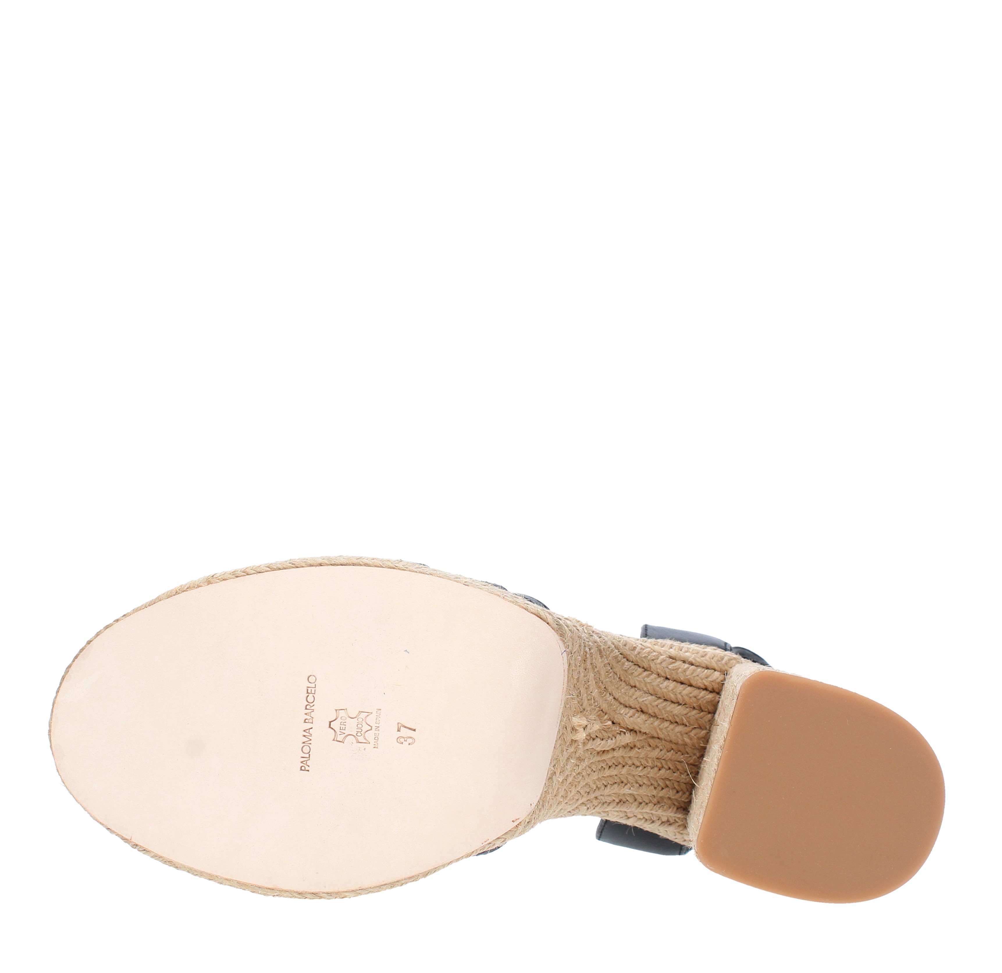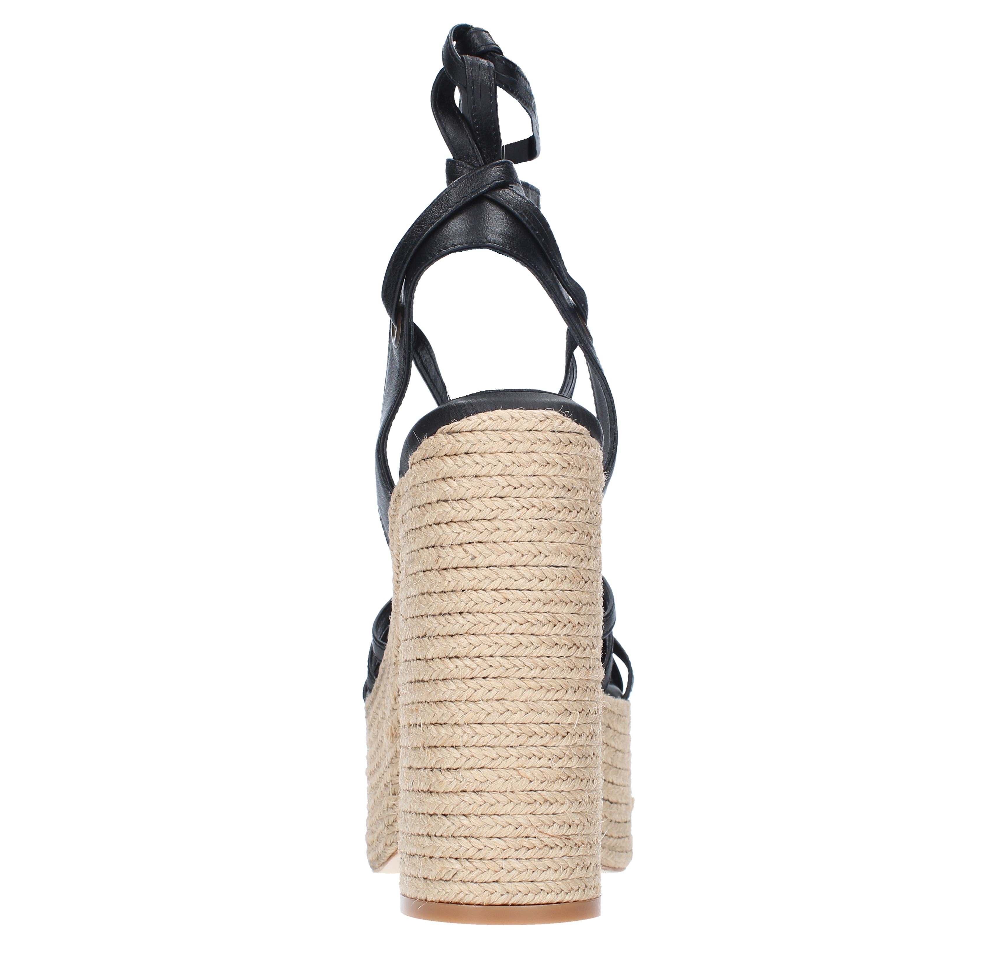 Sandales en cuir et raphia. Plate-forme : 6 cm. Semelle en cuir et caoutchouc. Semelle intérieure en cuir.
