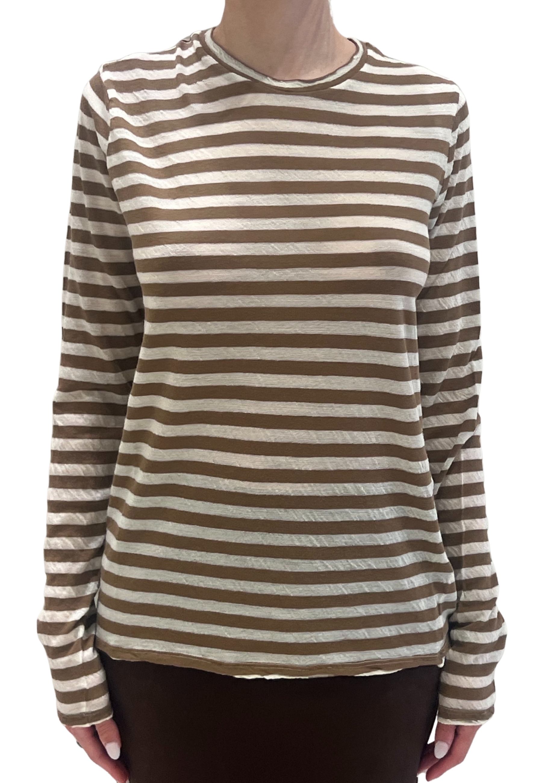 Pull rayé en 100% laine légère, avec manche longue et décolleté propre. Le motif horizontal rayé en crème et chameau donne une touche décontractée et raffinée en même temps. Le tissu est fin, respirant et légèrement transparent, parfait pour être porté seul ou sous vêtements extérieurs. fit doux et confortable, idéal pour un look quotidien avec un goût français essentiel mais bien entretenu. Le fond et les poignets finis avec des bords vivants pour un effet décontracté et moderne.