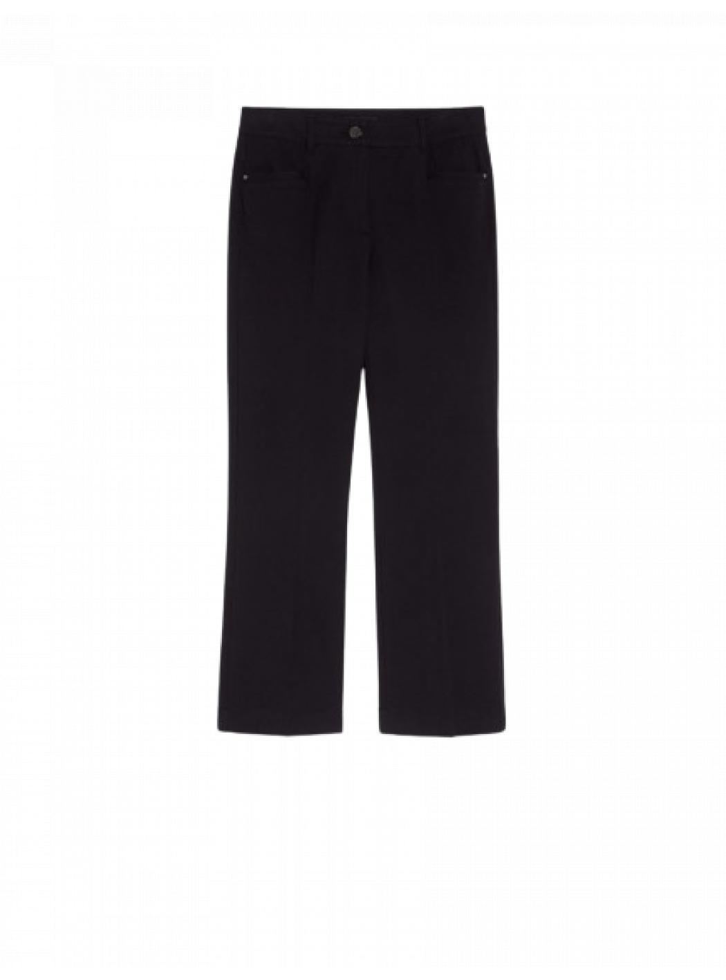 Pantalon taille mini-flare en sergé de coton et viscose à deux étriers. Ils ont une coupe mince au genou et légèrement évasé au fond, avec la longueur de la cheville. Taille régulière et pli étiré, zip caché.