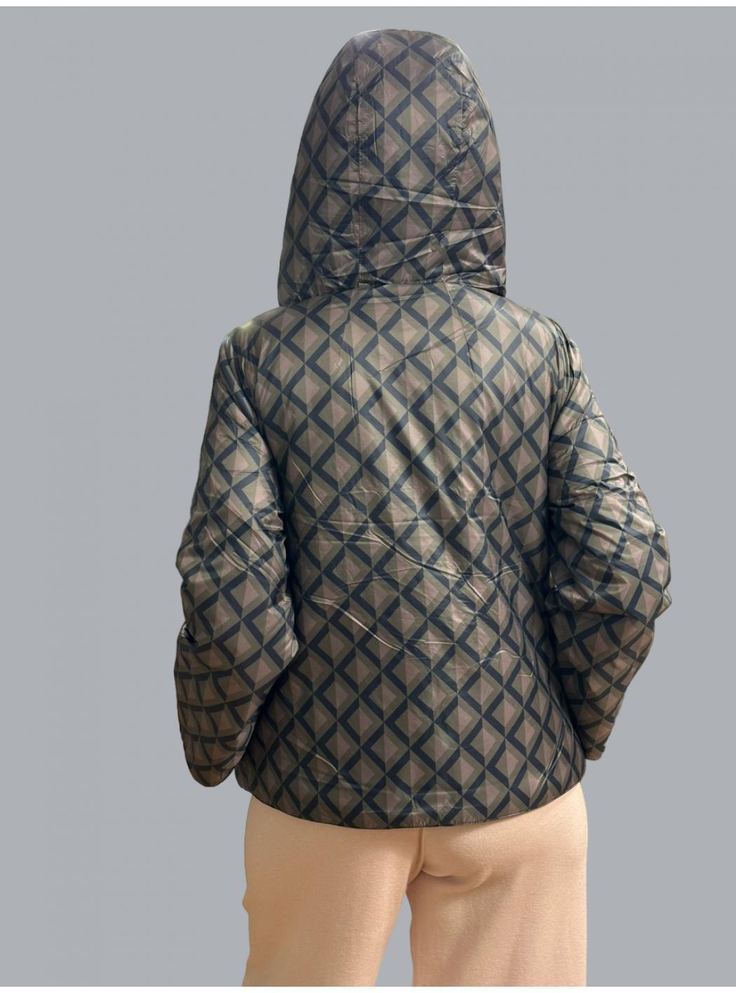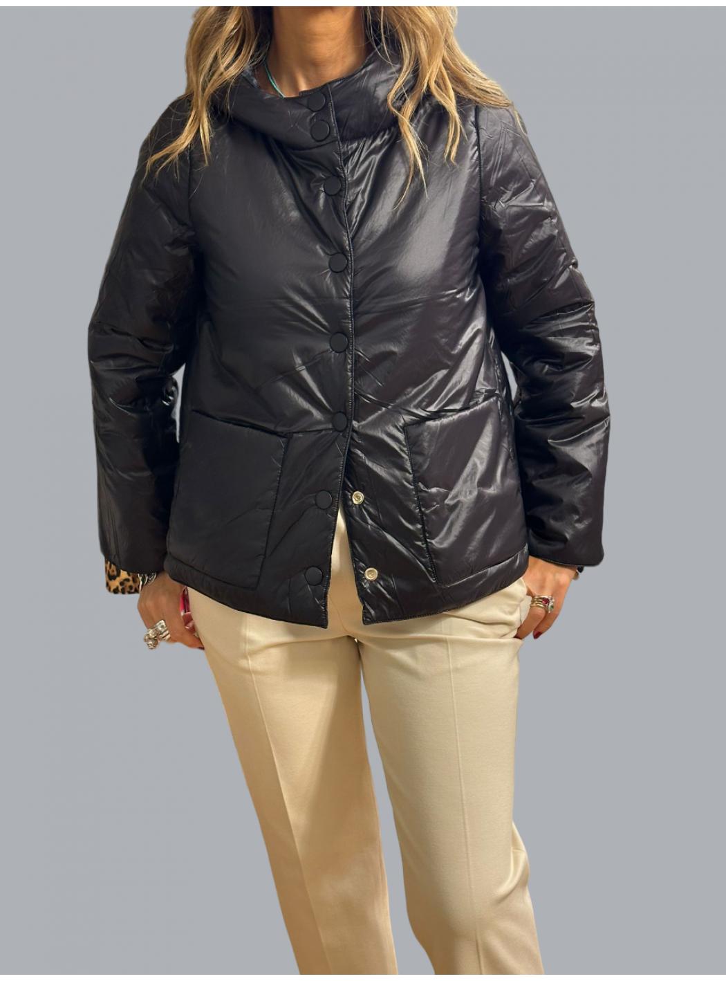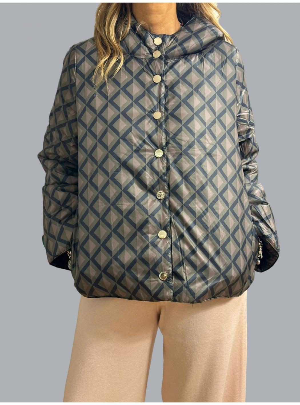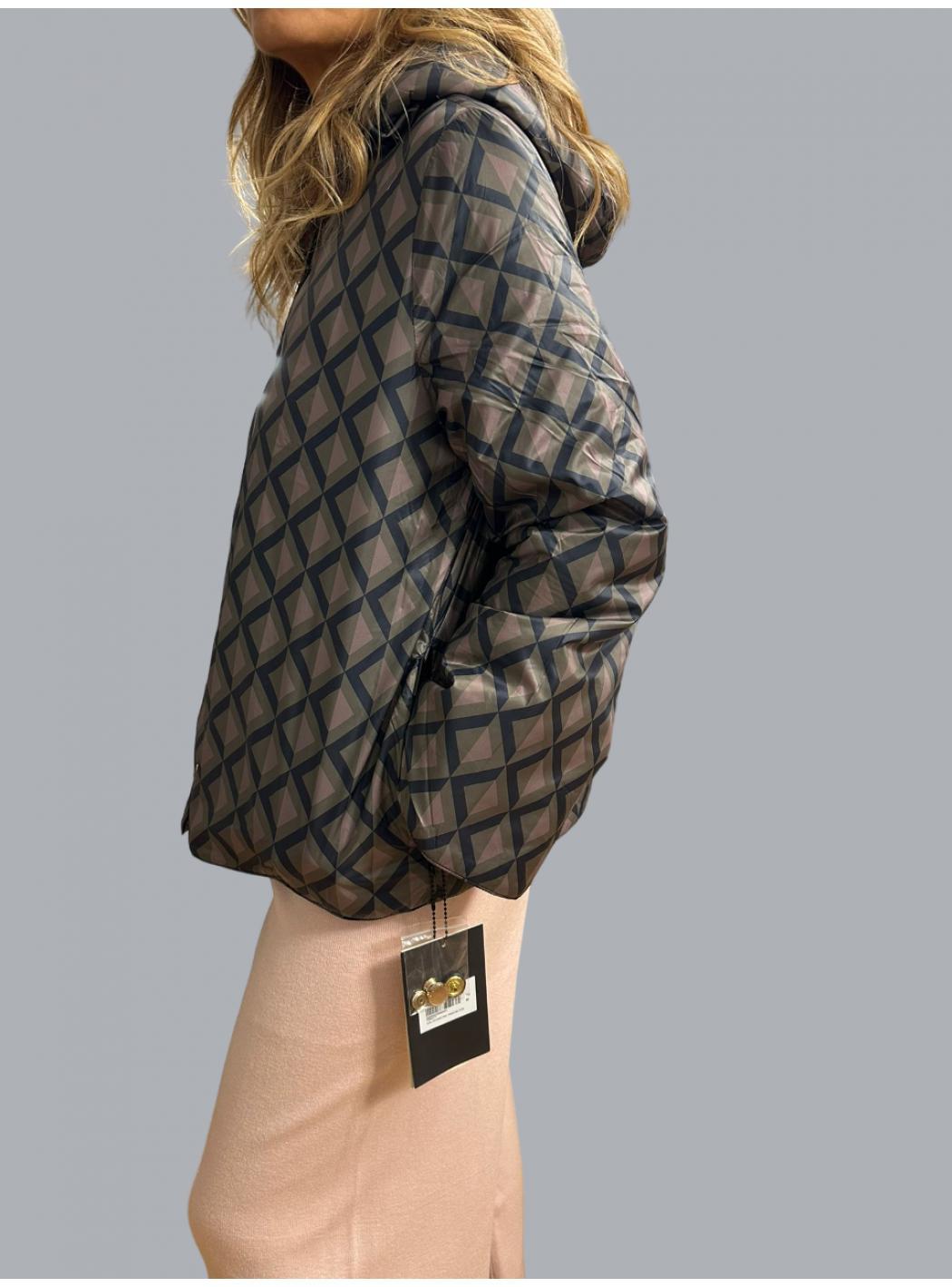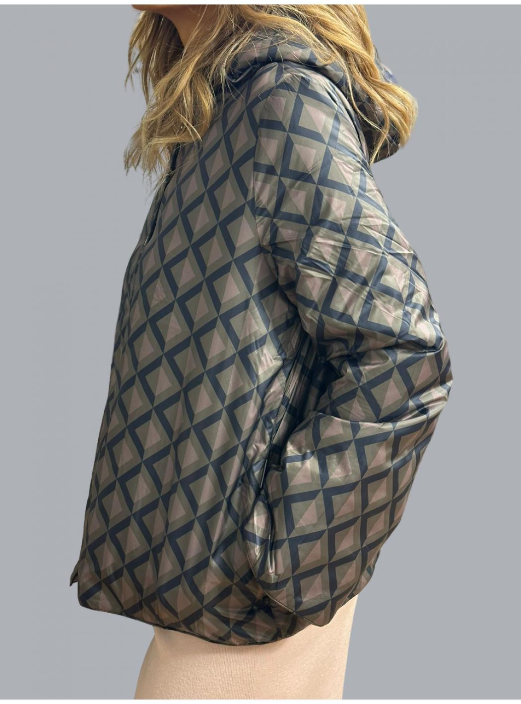 100 gr. motif géométrique réversible noir avec capot. Vextinction régulière. Fermeture avec boutons clip dorés. Poches avec zip invisible. Hauteur modèle 1,70 mt. Dans la photo porte la taille S. Composition: 100% polyester. Marque: Puzzle Goose.