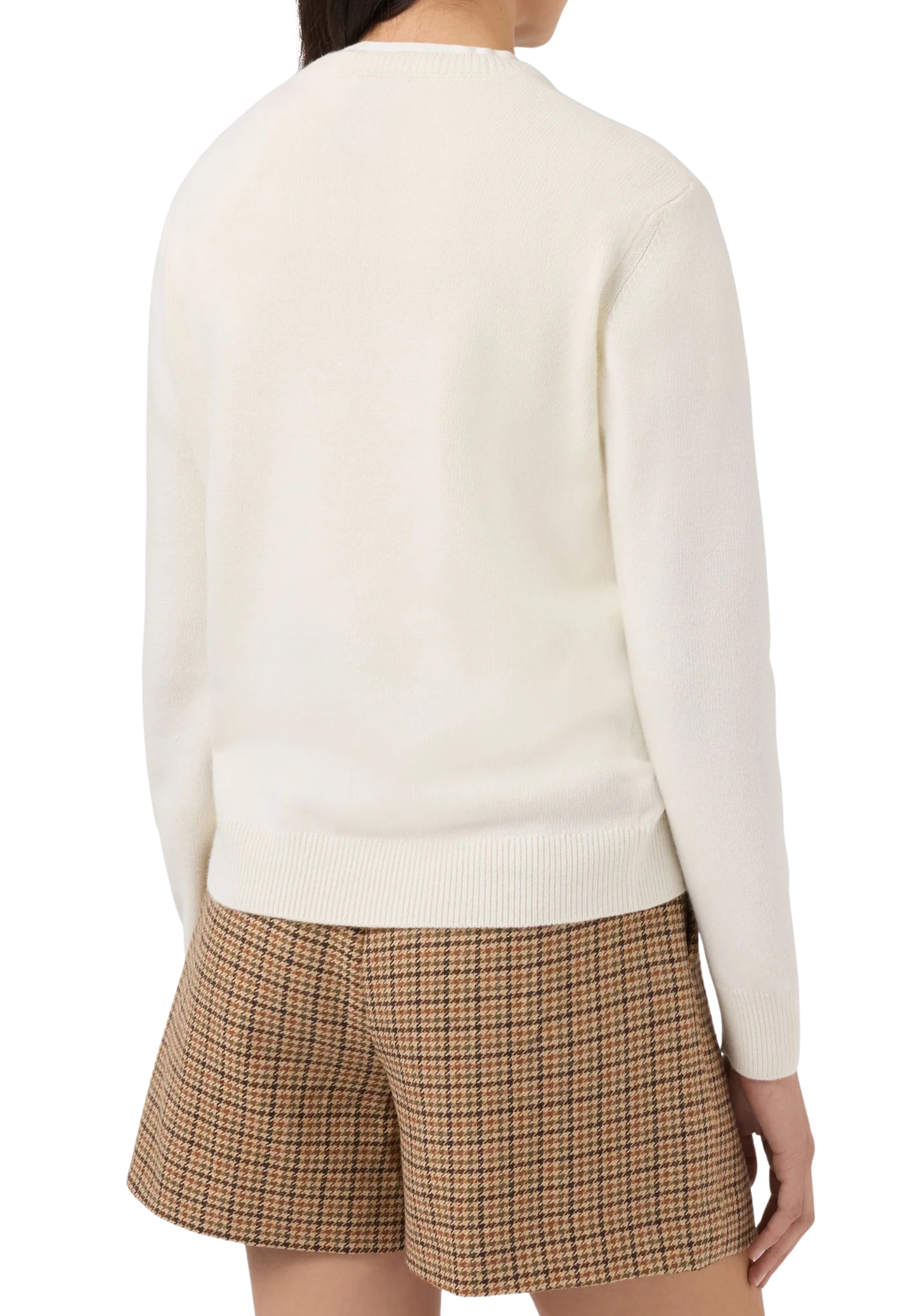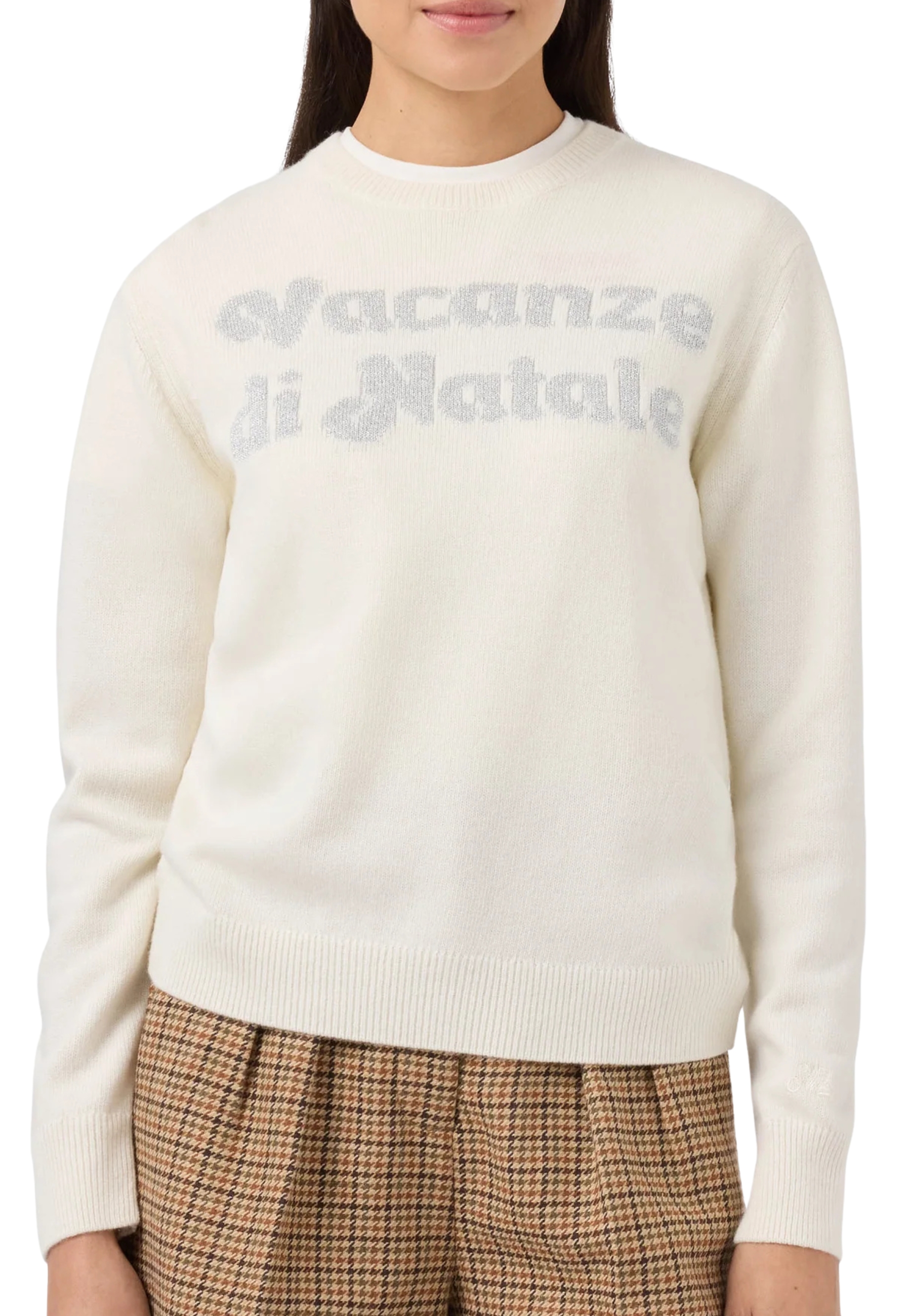 Maglia paricollo crème avec écriture "Noël vacances" en argent brodé.