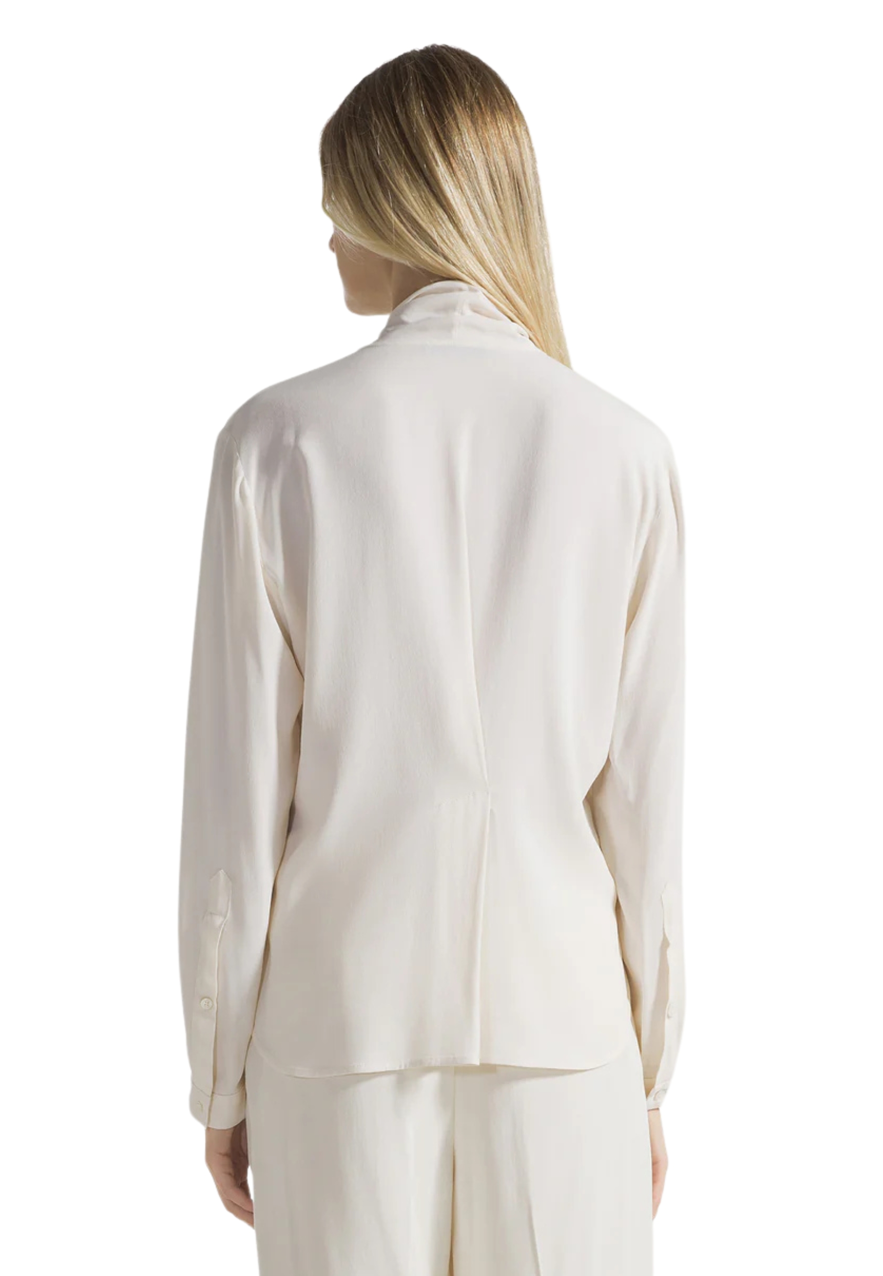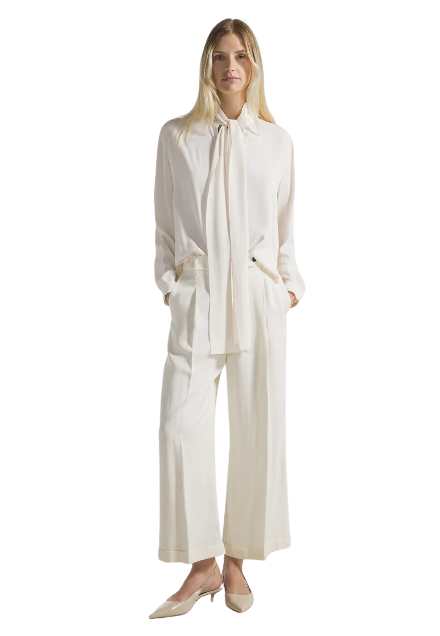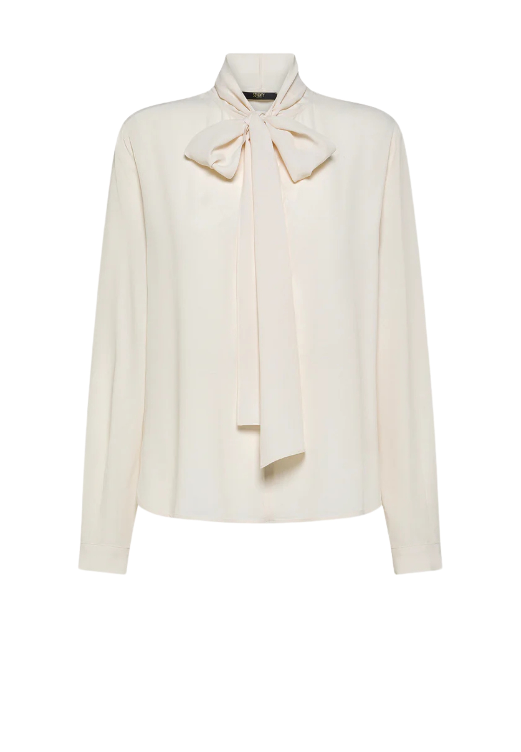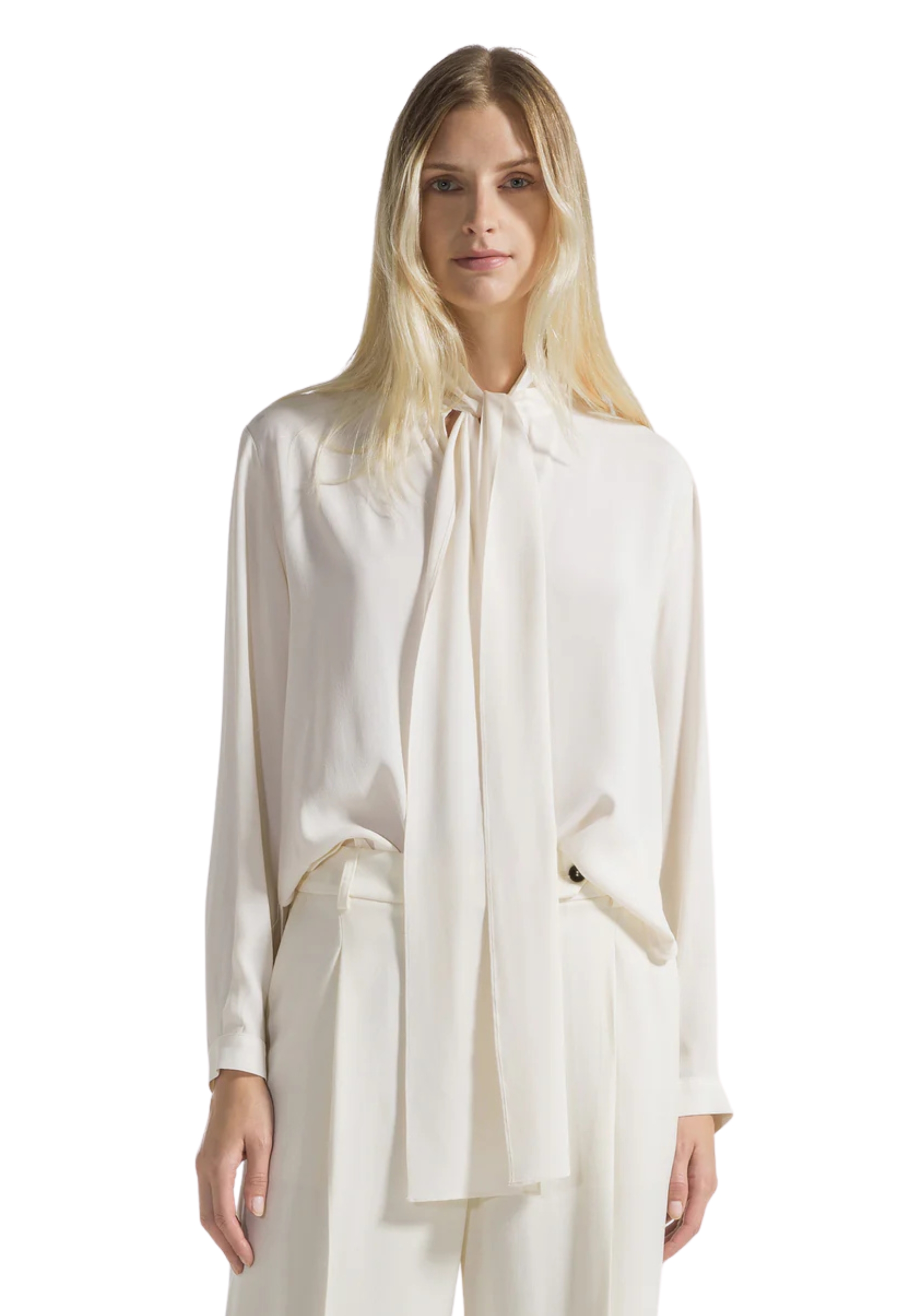 Blouse en crêpe mélangé bleu soie avec arc sur le cou.