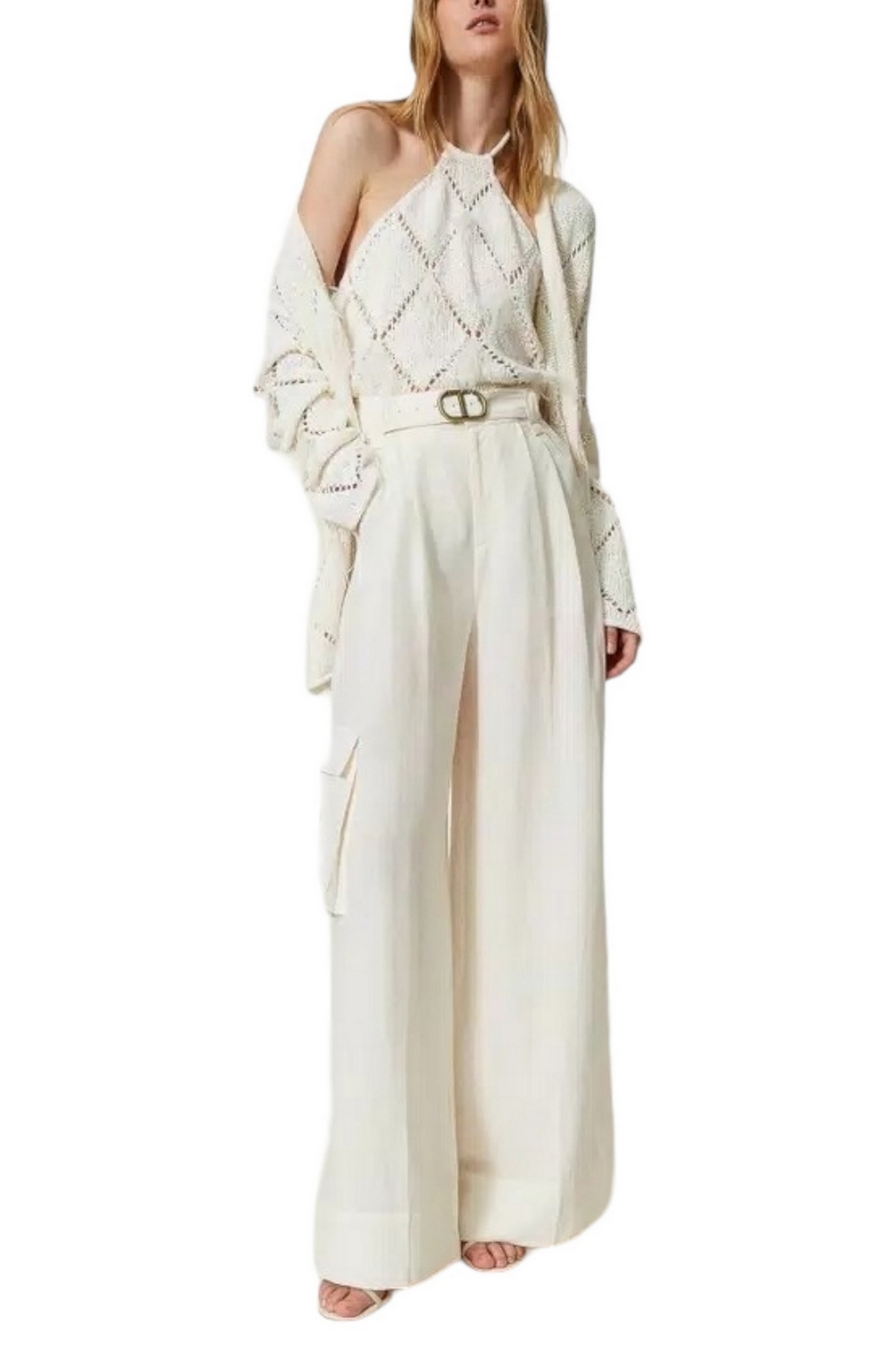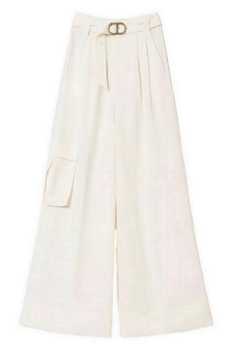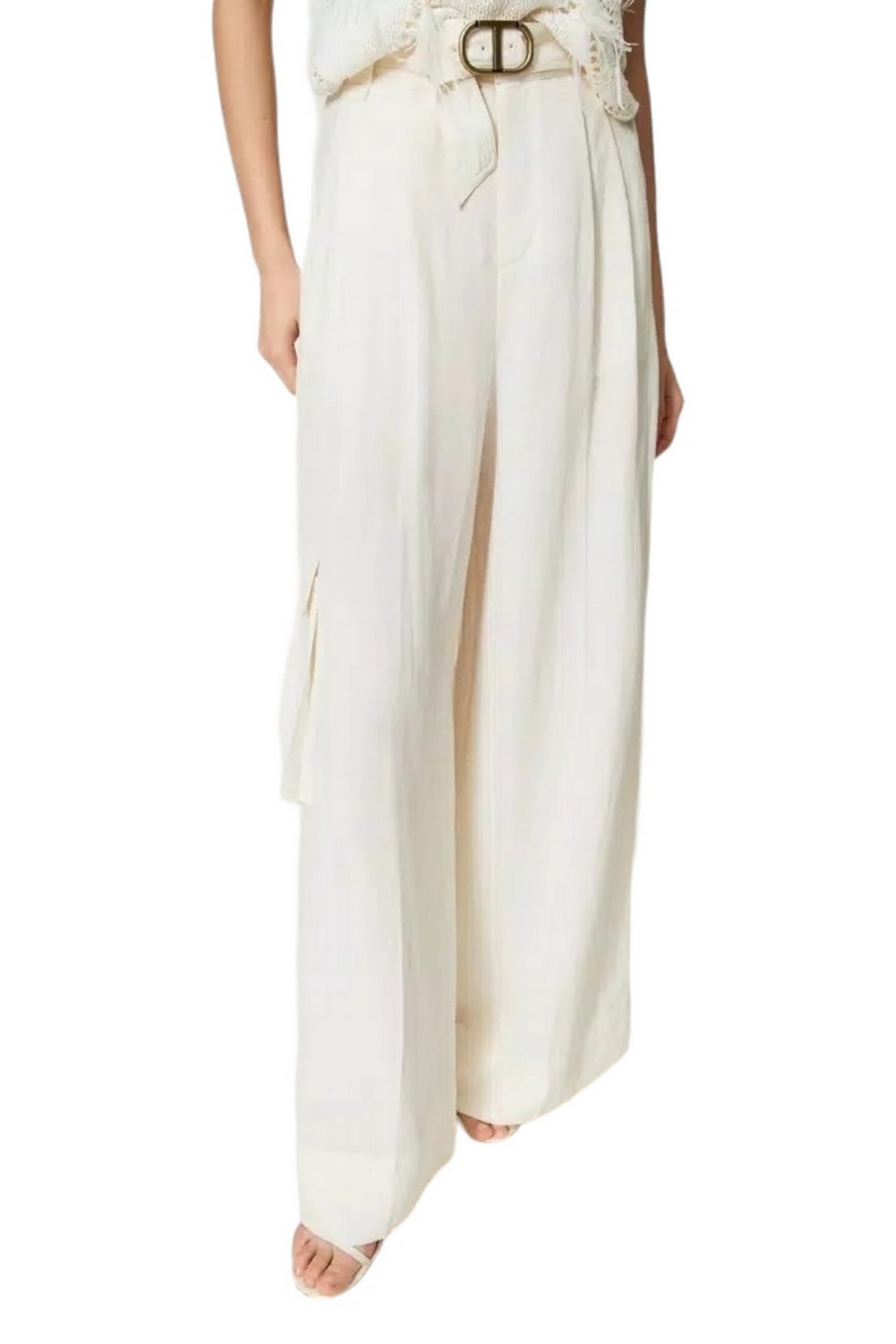 Pantalon large à jambes Twin-set en toile de lin mélangée avec plis avant, poches françaises et patch sur le côté, ceinture assortie. Linge mélangé et lyocell avec une main douce. Taille haute, plis avant, poches françaises sur les côtés et patch sur le côté, fermeture zippée, ceinture assortie en tissu avec oeillets brodés et boucle en métal avec logo Oval T. Composition : 75 % lyocellus 25 % lin. Doublure : 100% coton. Ceinture : 75 % lyocellus 25 % lin
