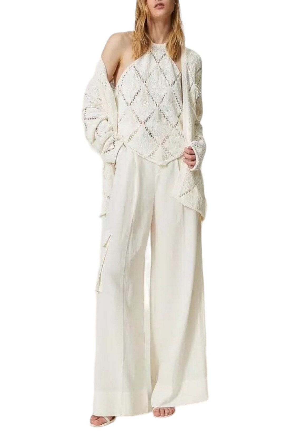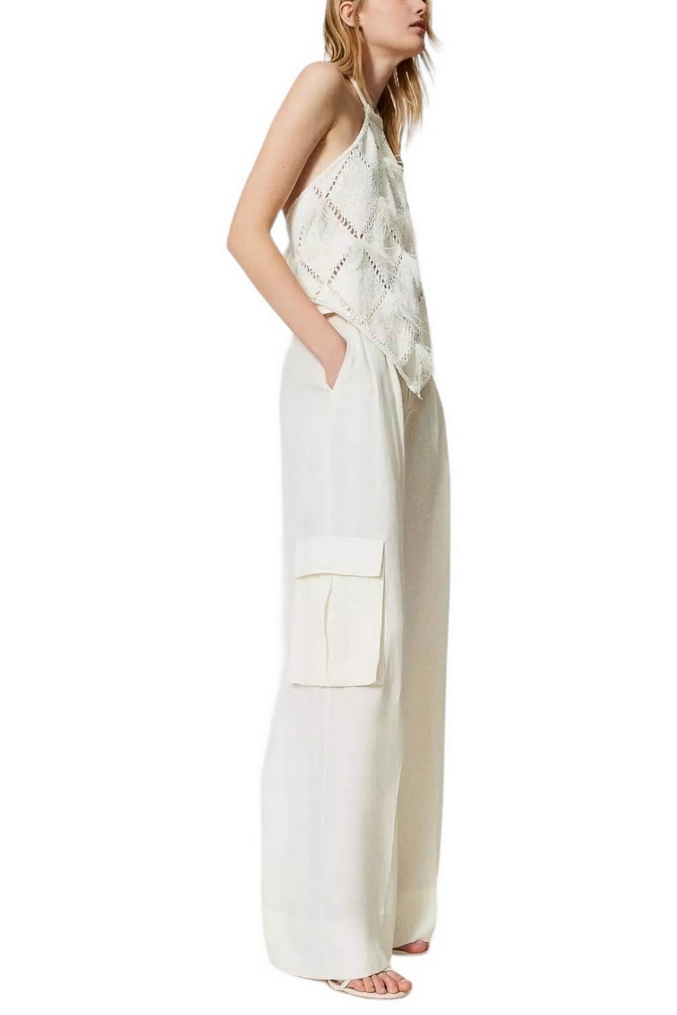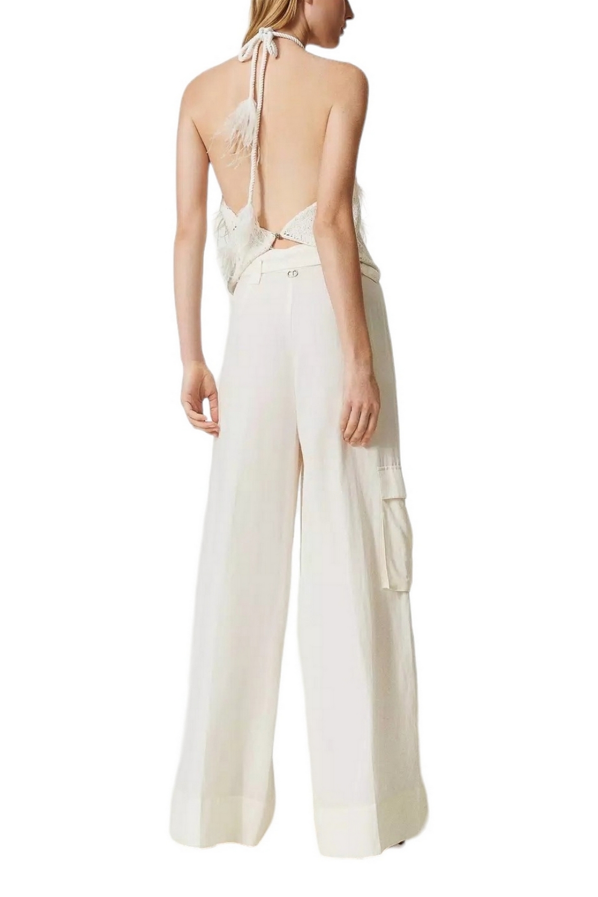 Pantalon large à jambes Twin-set en toile de lin mélangée avec plis avant, poches françaises et patch sur le côté, ceinture assortie. Linge mélangé et lyocell avec une main douce. Taille haute, plis avant, poches françaises sur les côtés et patch sur le côté, fermeture zippée, ceinture assortie en tissu avec oeillets brodés et boucle en métal avec logo Oval T. Composition : 75 % lyocellus 25 % lin. Doublure : 100% coton. Ceinture : 75 % lyocellus 25 % lin