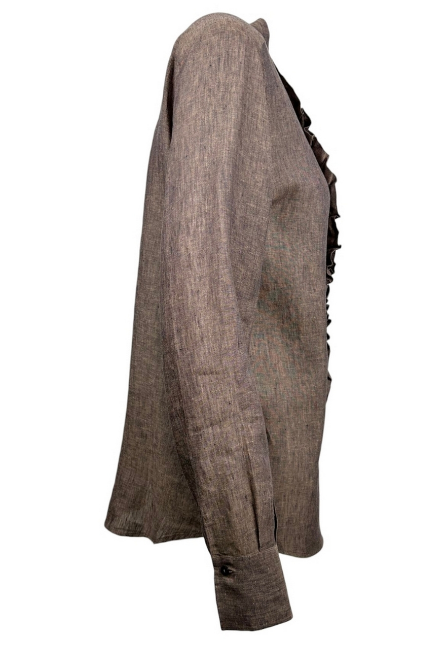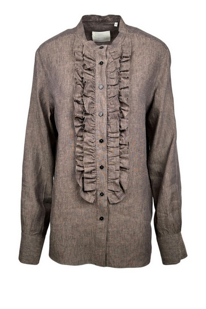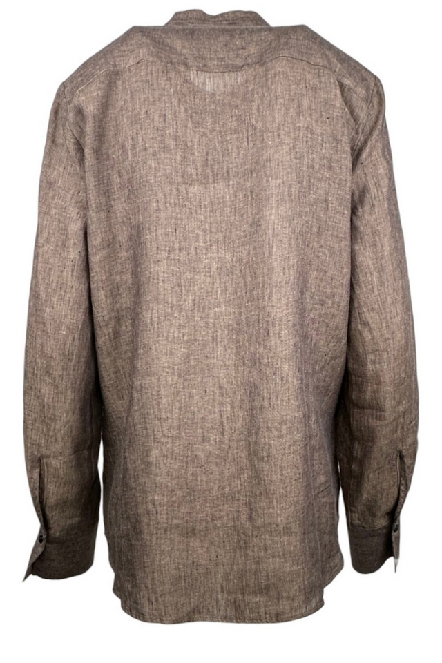 T-shirt de Tracy Xacus. Chemise régulière avec col coréen, boutonnage exposé et plastron avec rouge. Composition du tissu: 100% lin