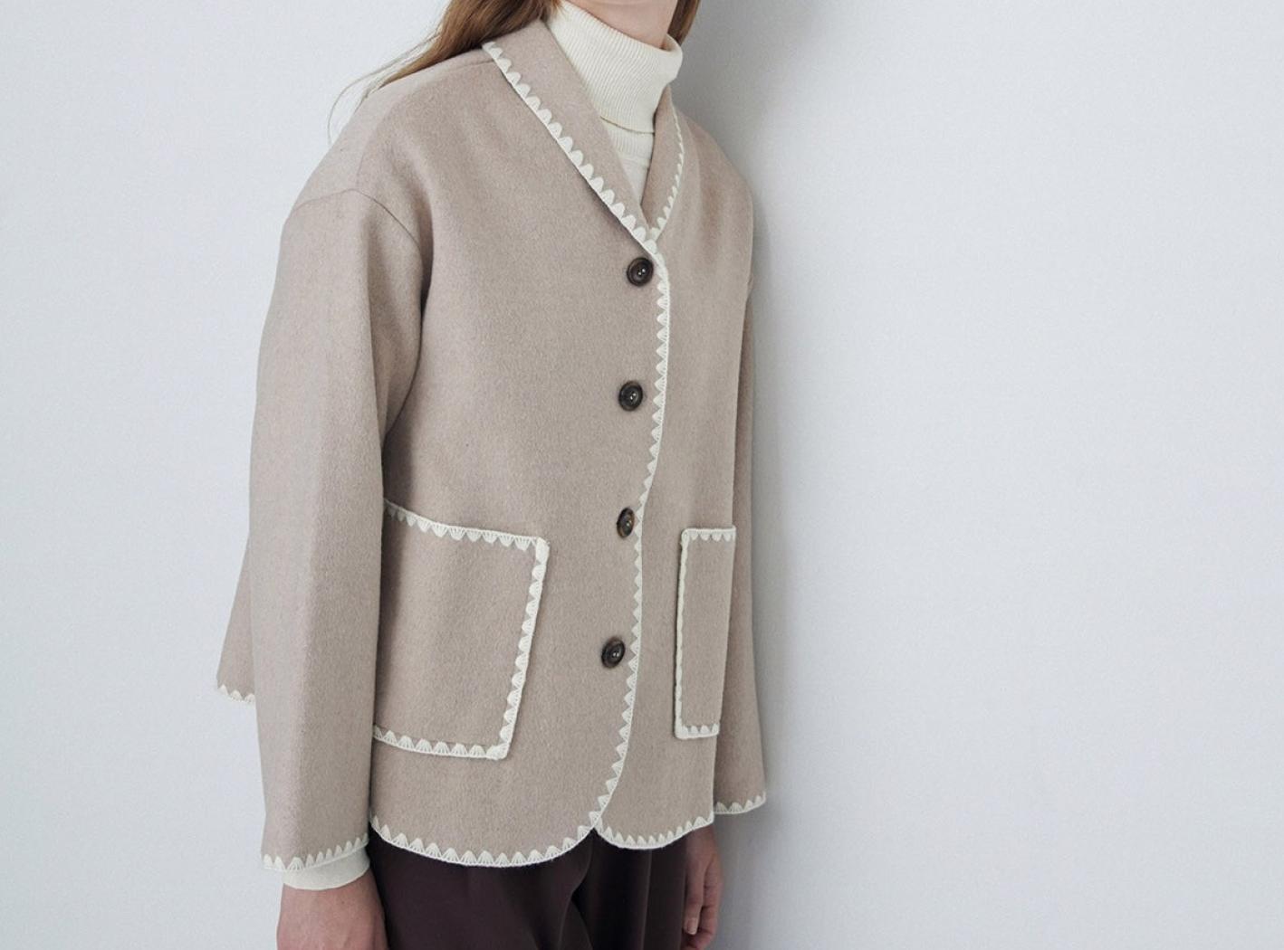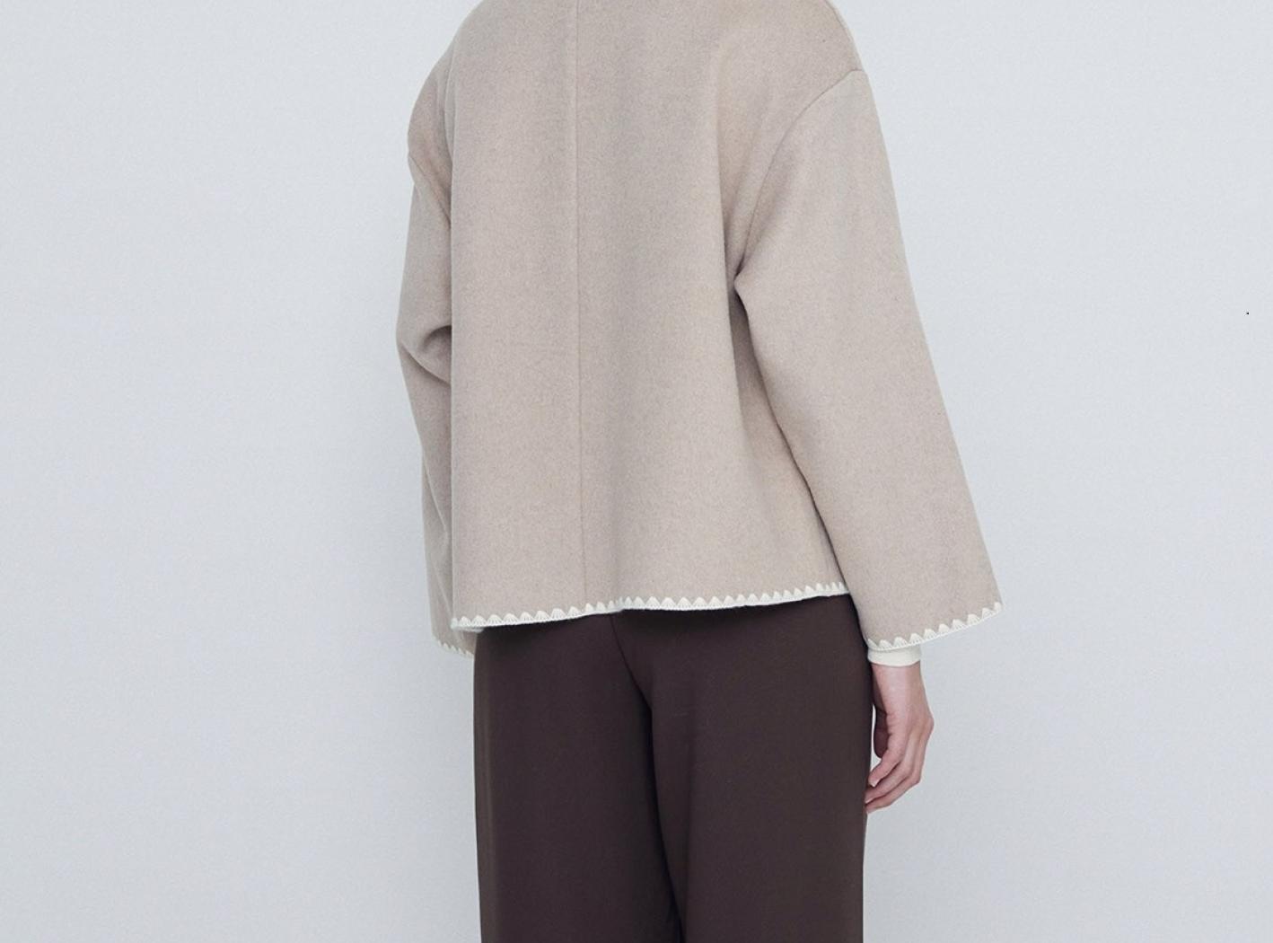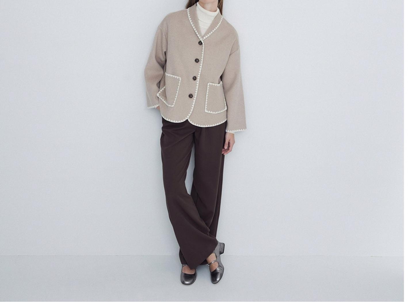 Blazer tressé en laine mélangé. En haut du cou. Longue manche. Détails finition couverte. Composition : 50% laine, 50% polyester. Hauteur modèle 175 cm, taille S.