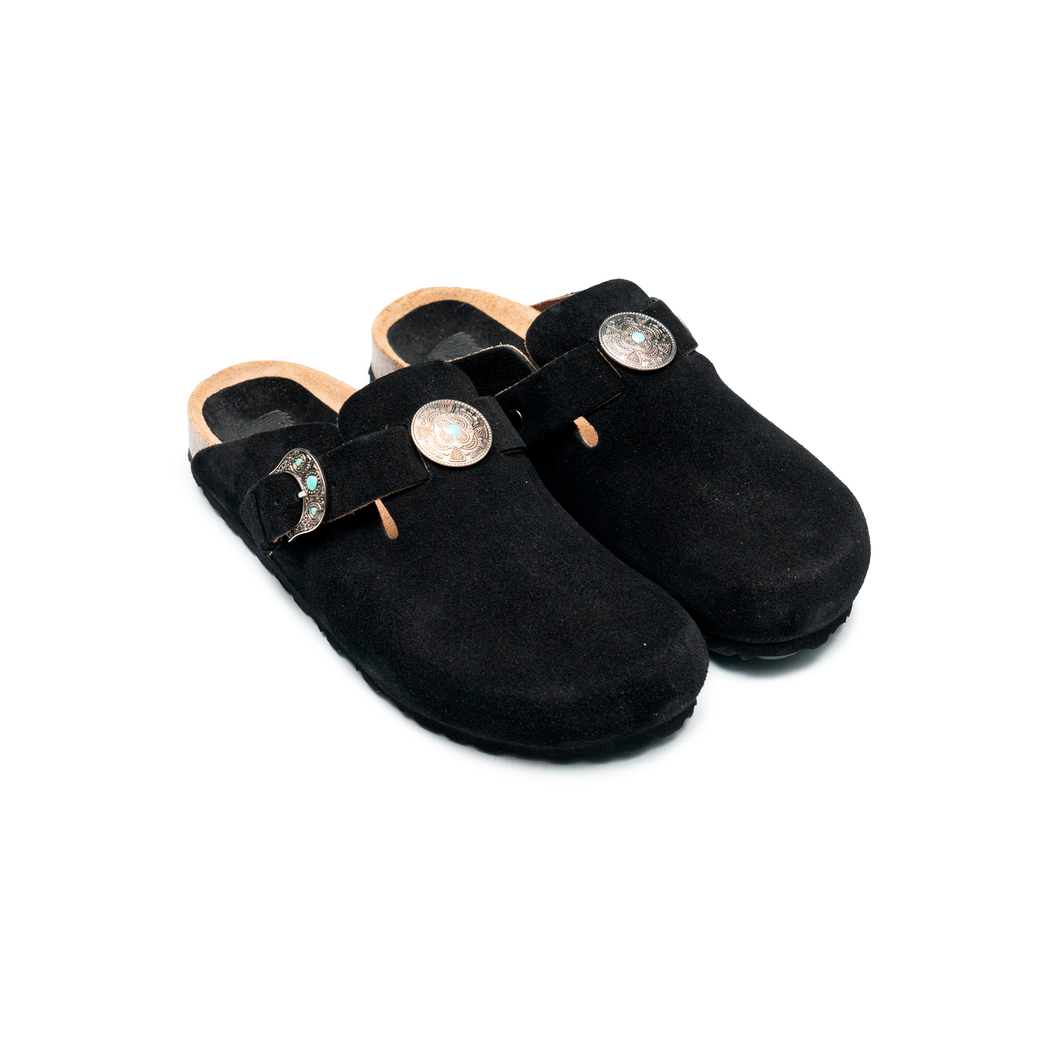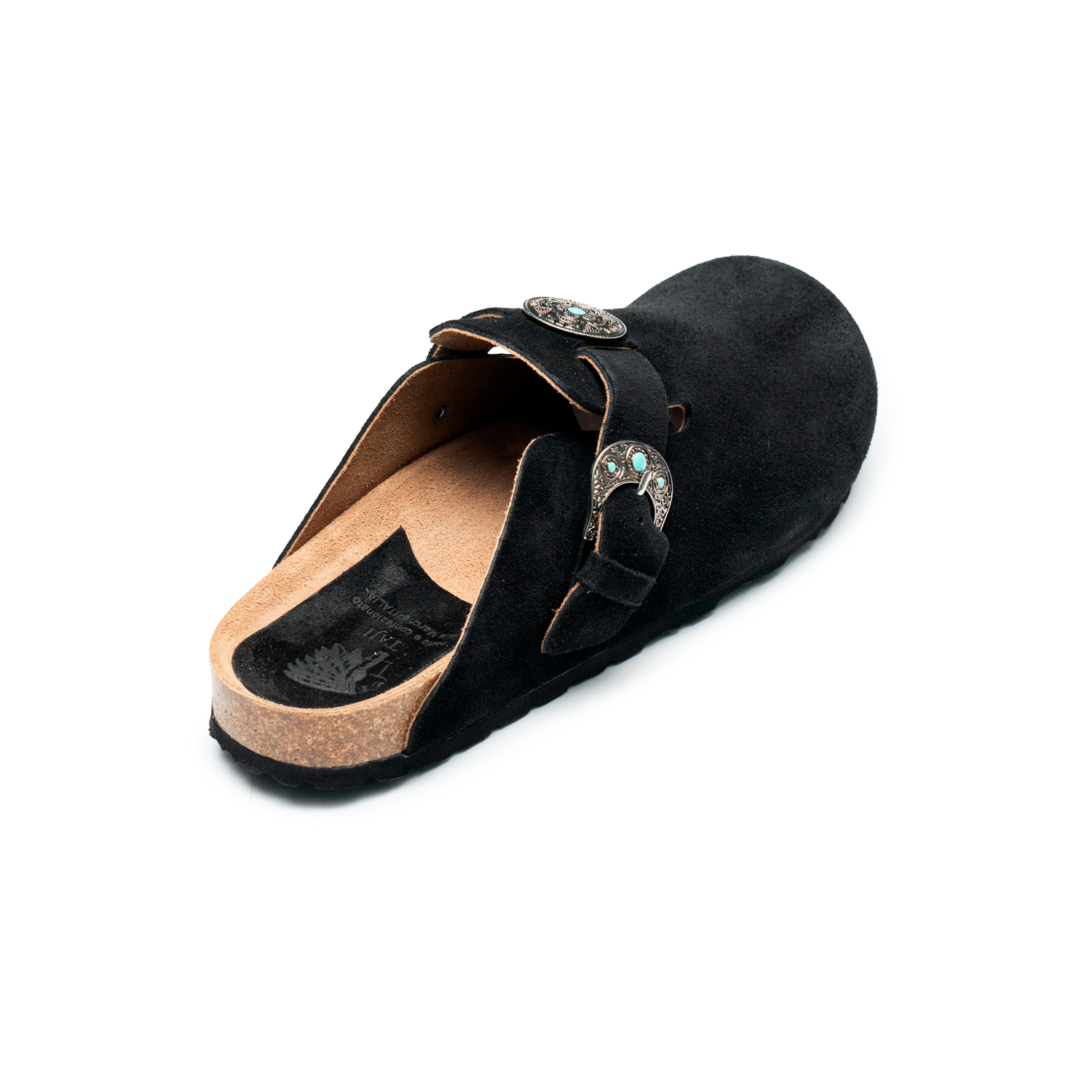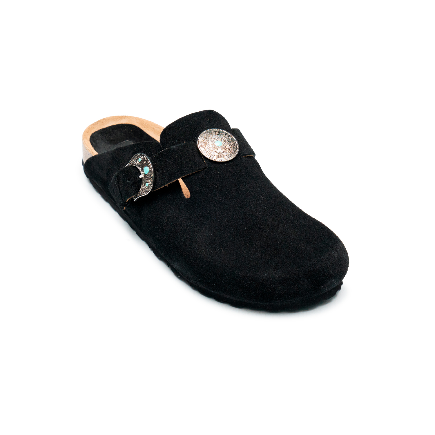 Sabot avec 1 boucle, semelle anatomique doublée de veau, doublure en cuir de veau supérieur et suède avec pierre turquoise. Il est nécessaire de prendre une (1) TAGLIE EN PLUS RÉPONSE À PROPRIA.