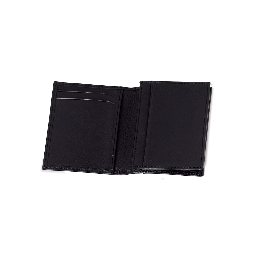 Portefeuilles en cuir de couleur noire. Cuir intérieur et couture noire. Gravure d'angle avec Rosa dei Venti.