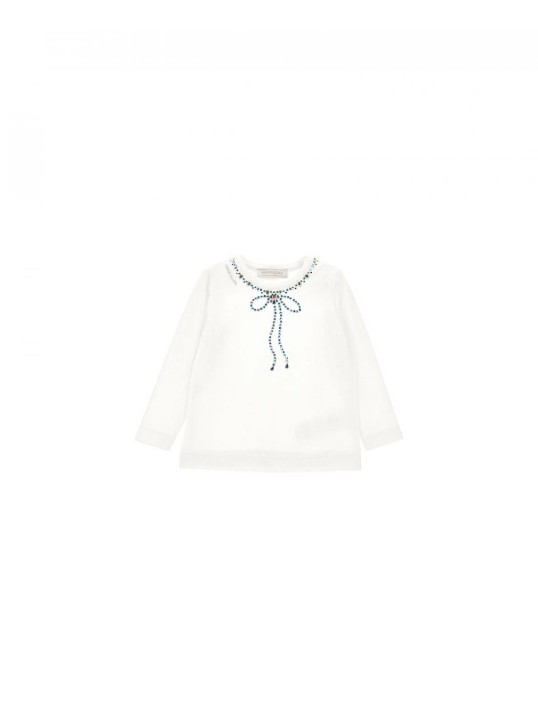 Questo T-shirt bianco con fiocco sul collo per bambine di Monnalisa è realizzato in morbido cotone che garantisce comfort per tutto il giorno. Le maniche lunghe offrono ulteriore calore, mentre il fiocco gioiello impreziosito aggiunge un tocco raffinato ed elegante, rendendolo perfetto per le occasioni speciali o per un look quotidiano alla moda. Realizzato con attenzione alla qualità, questo top unisce raffinatezza e comfort per il guardaroba della tua bambina.