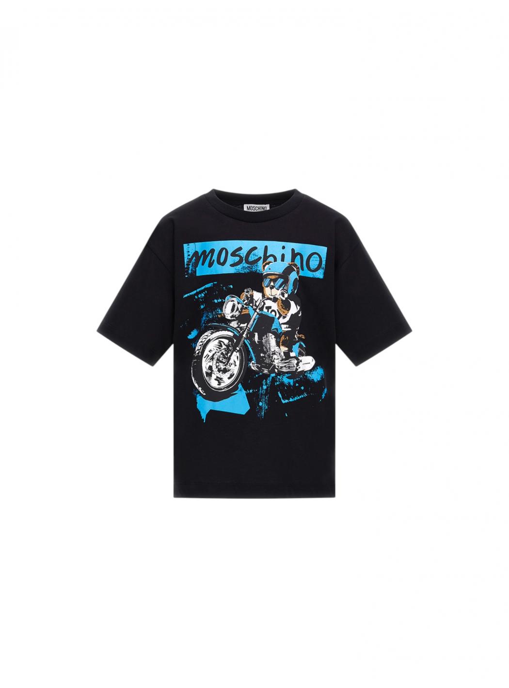 T-shirt a maniche corte, con scollo rotondo, a tinta unita, dalla vestibilità over, con logo e maxi Teddy motociclista sul davanti. Per un look trendy e cool. MOSCHINO