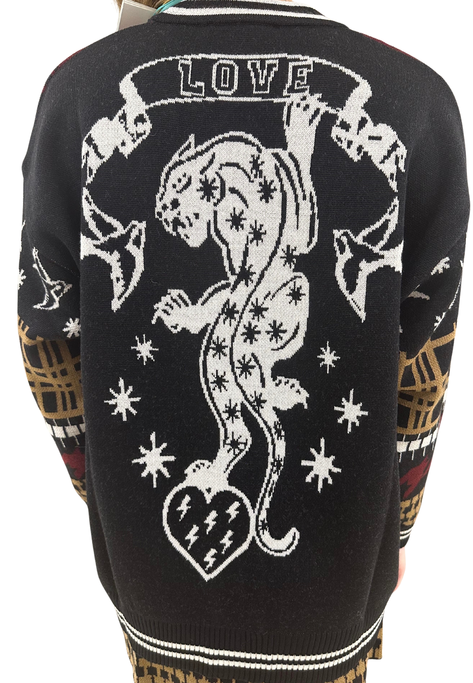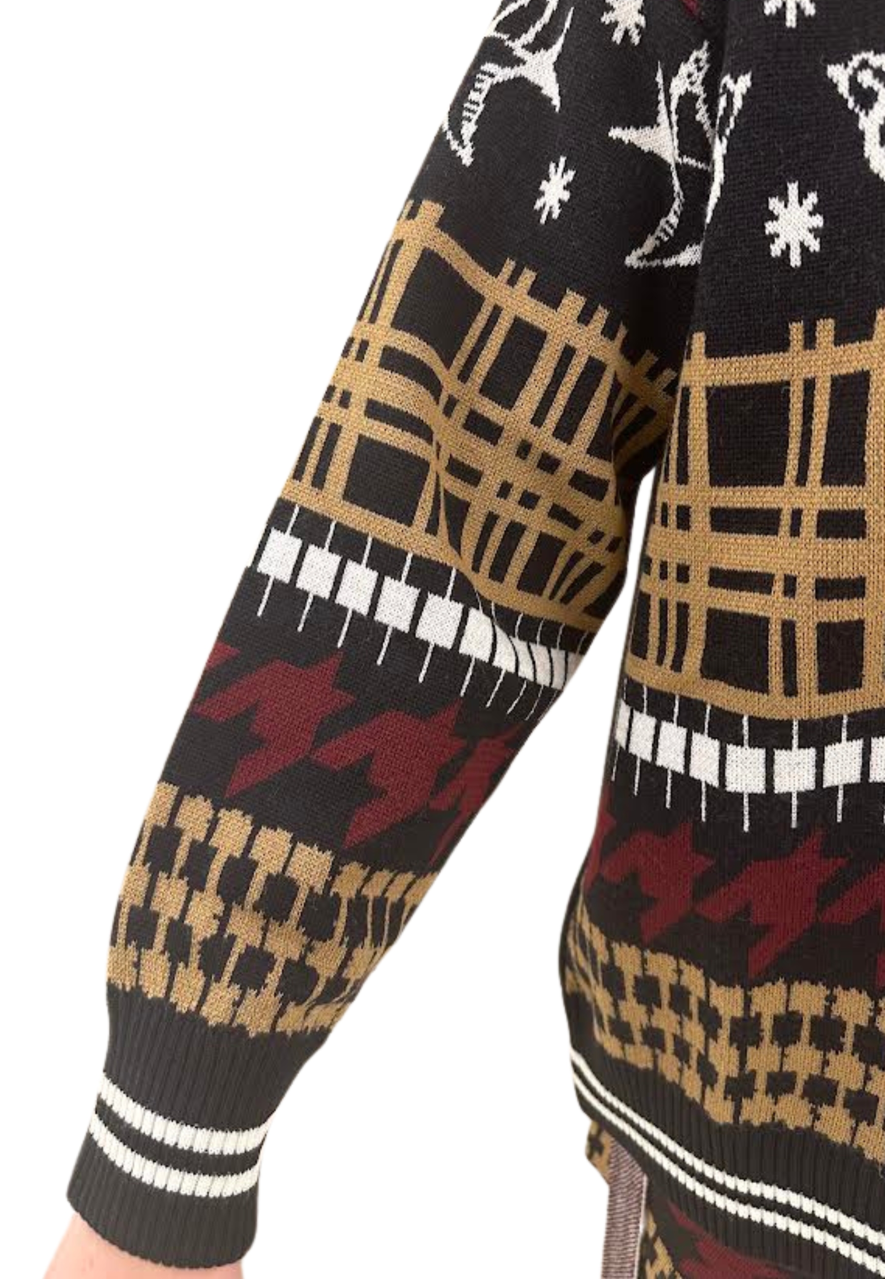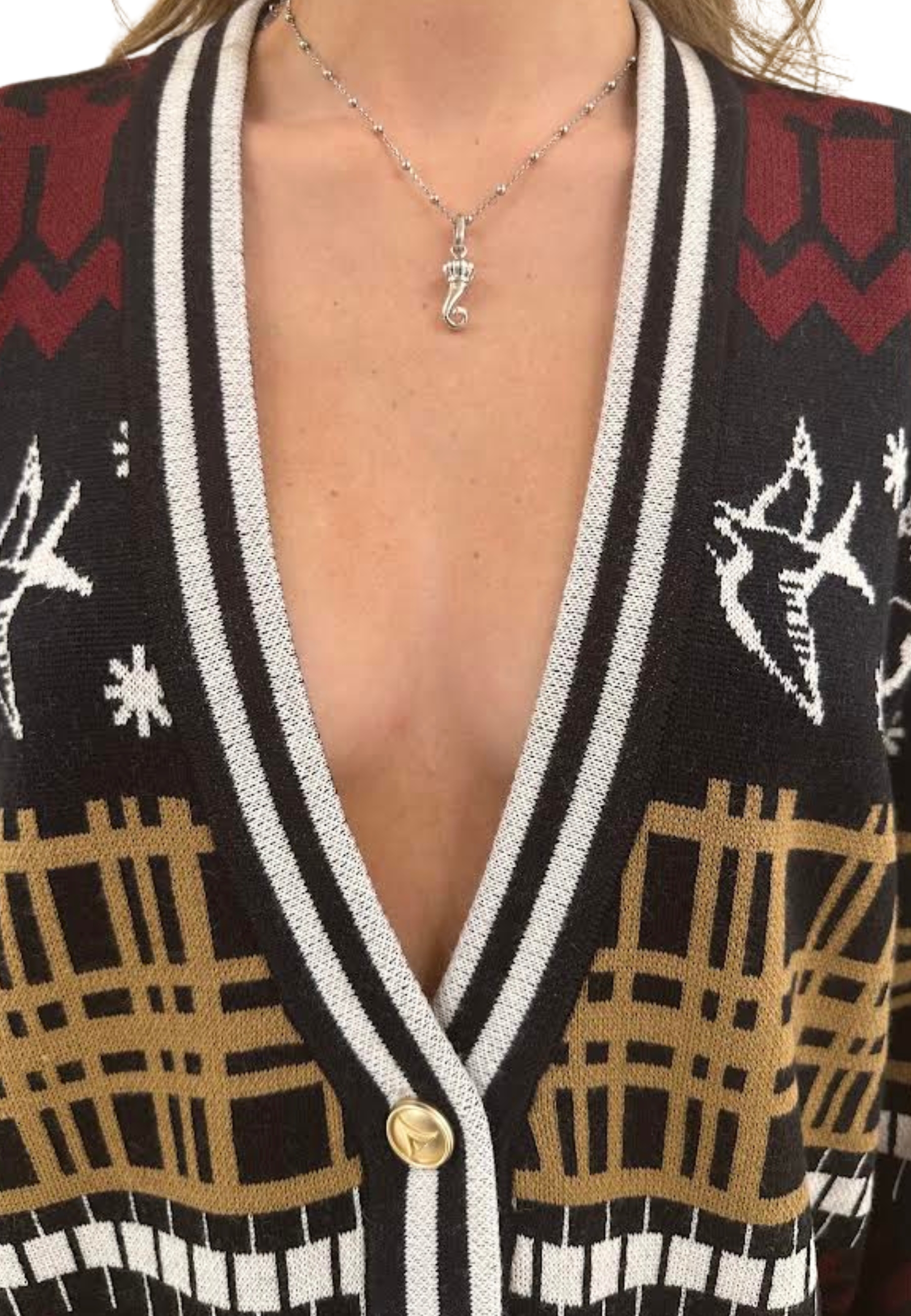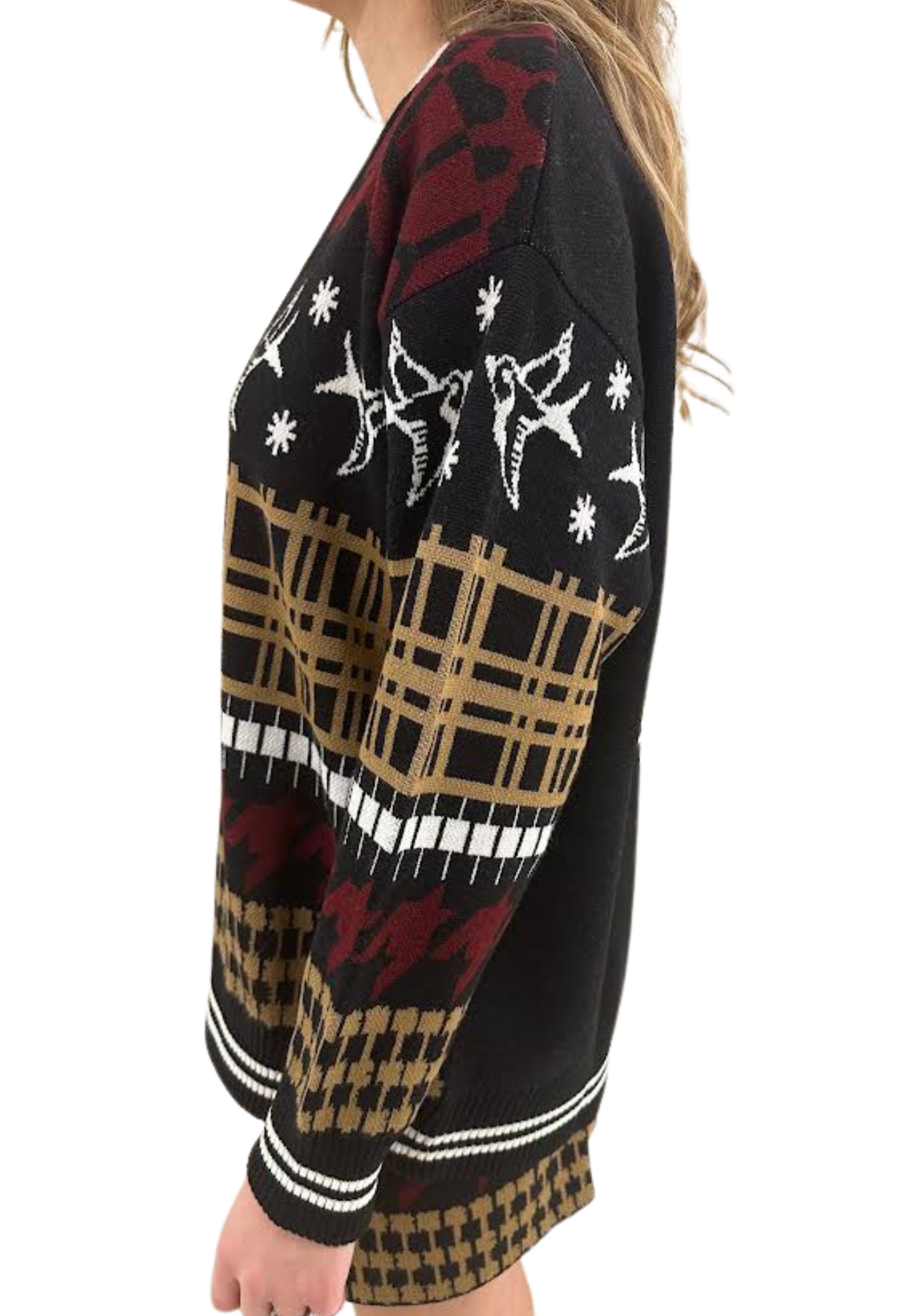 Cardigan in fantasia in lana color nero,beije,bianco e bordeaux con bottoni con asola oro.