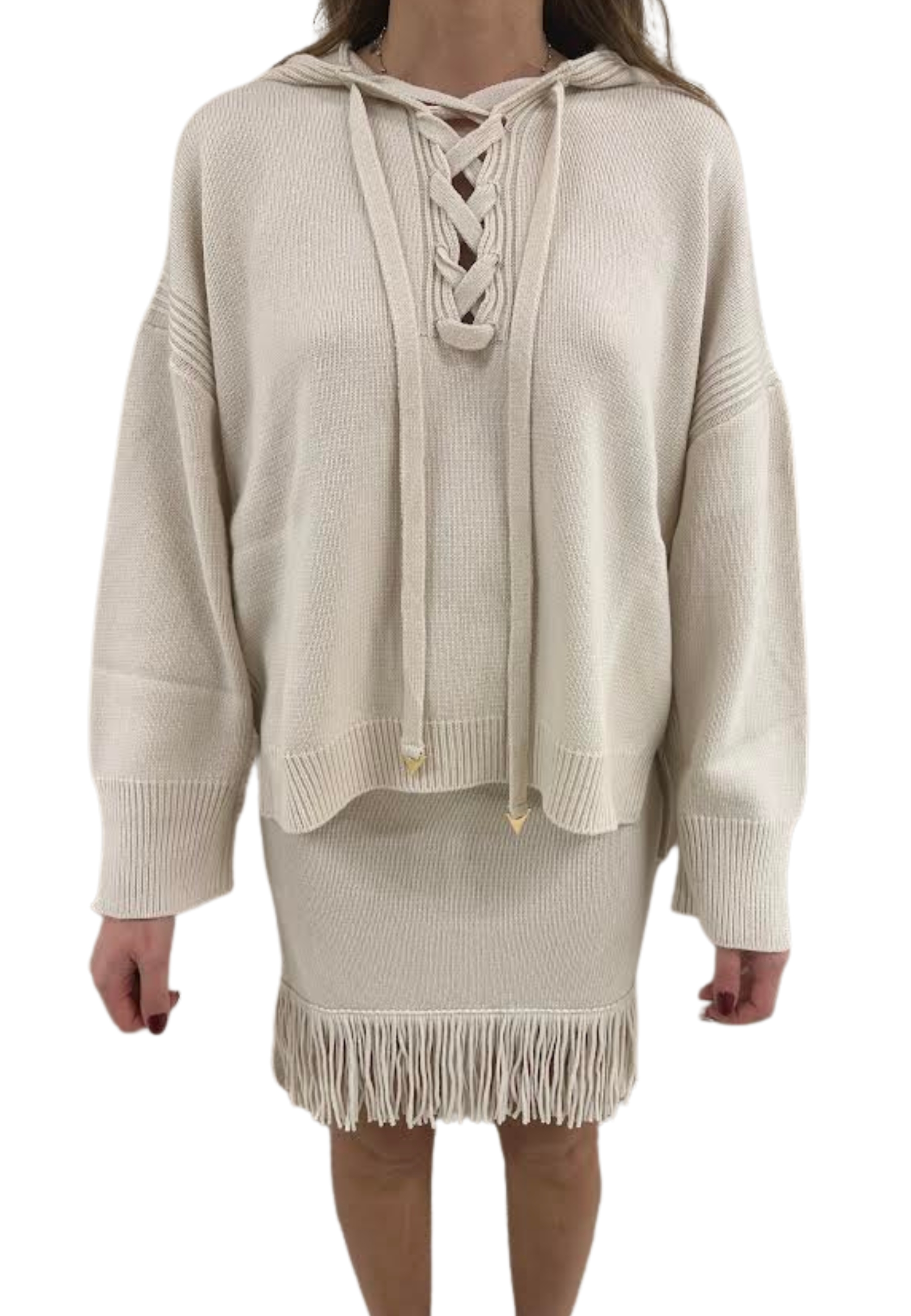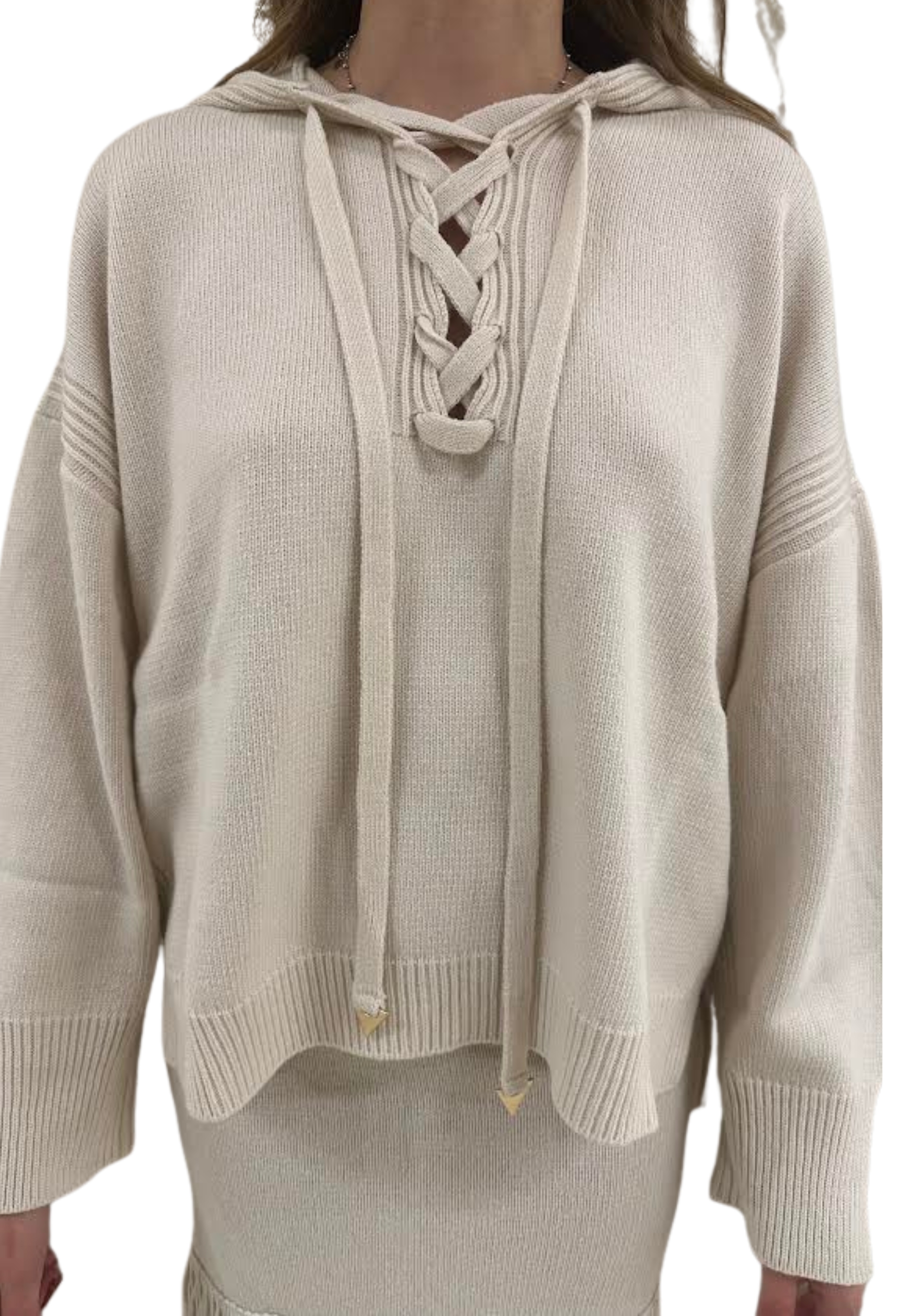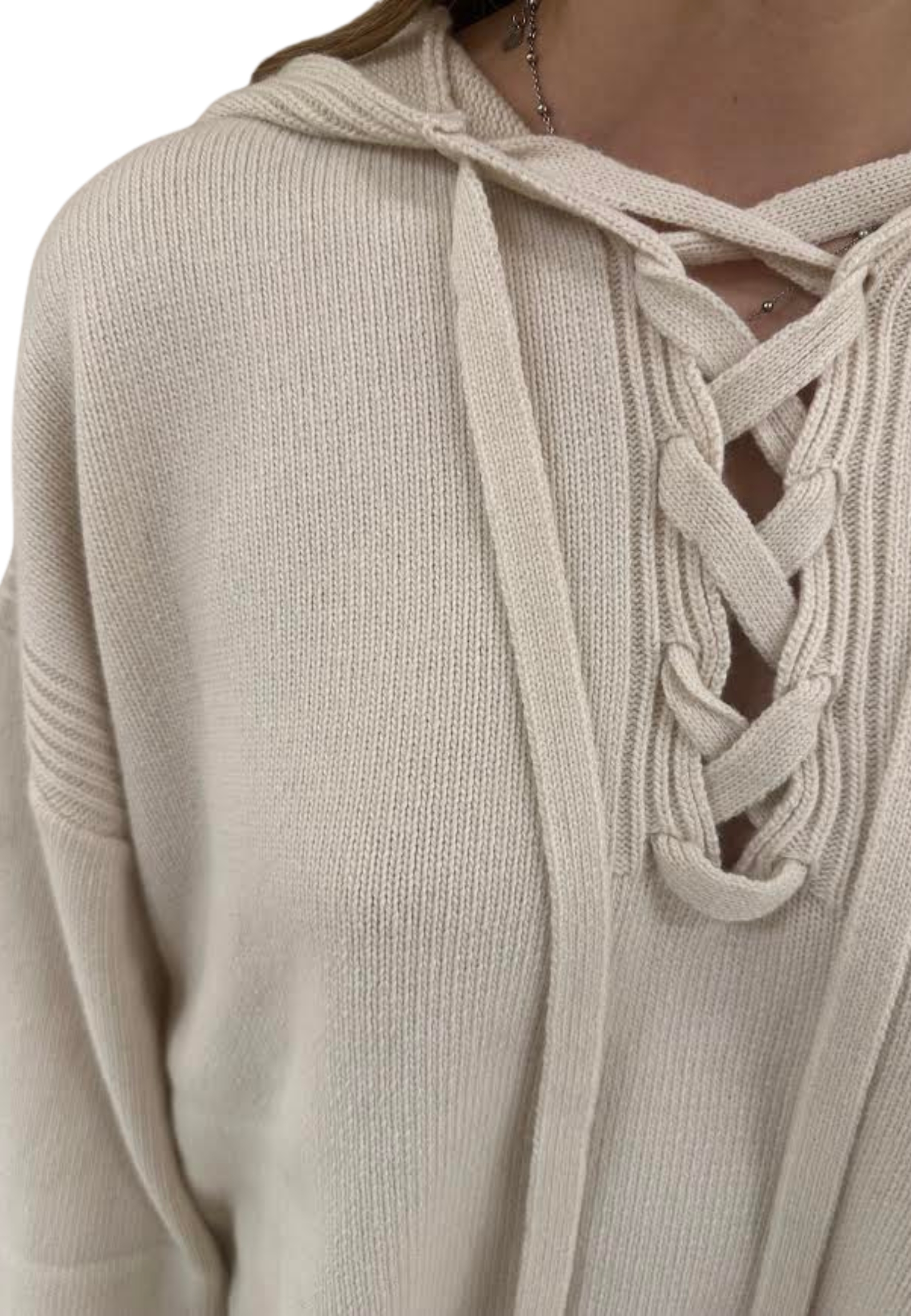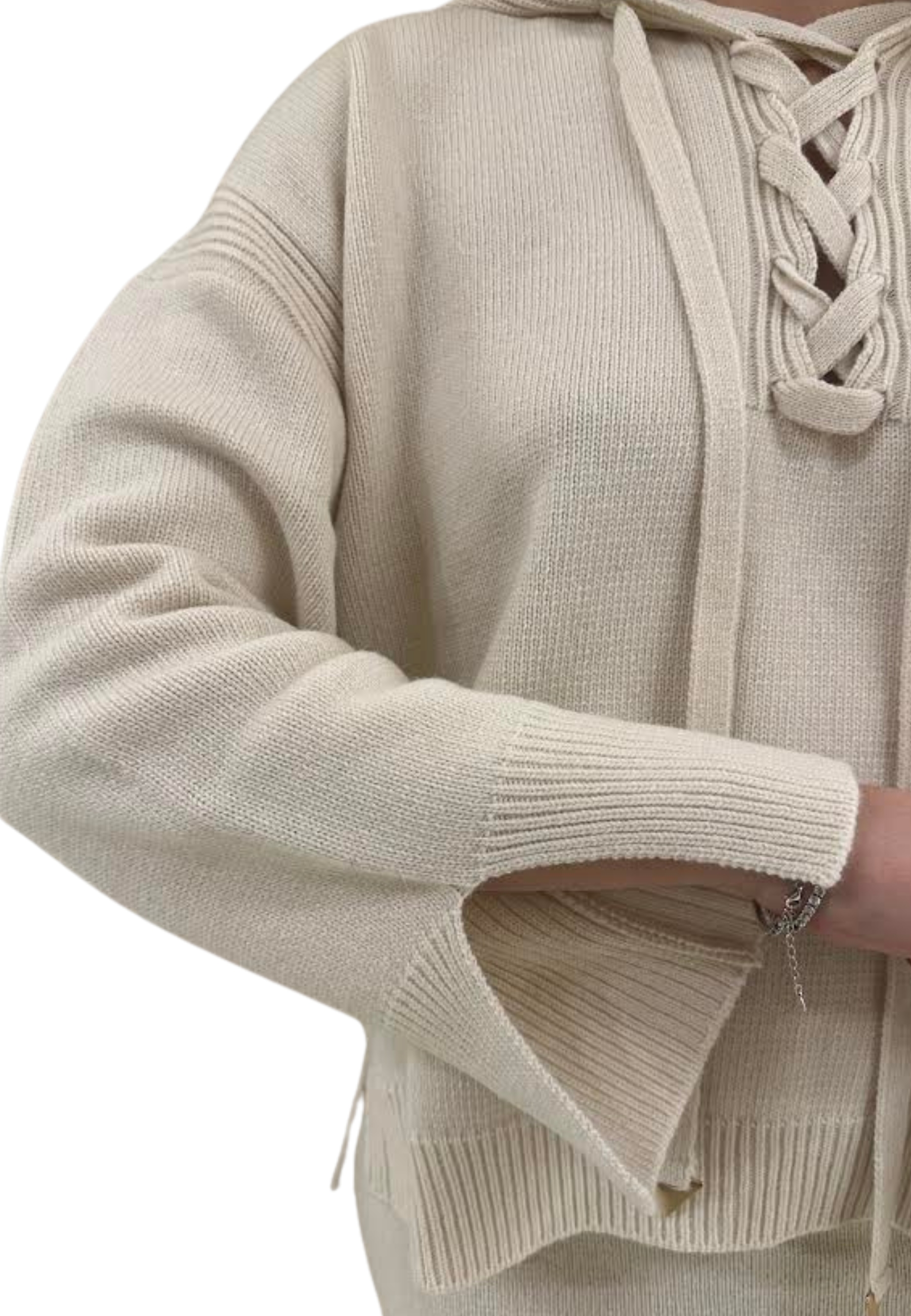 Maglione con cappuccio e manica con spacchetto e laccio ad incrocio sul davanti.