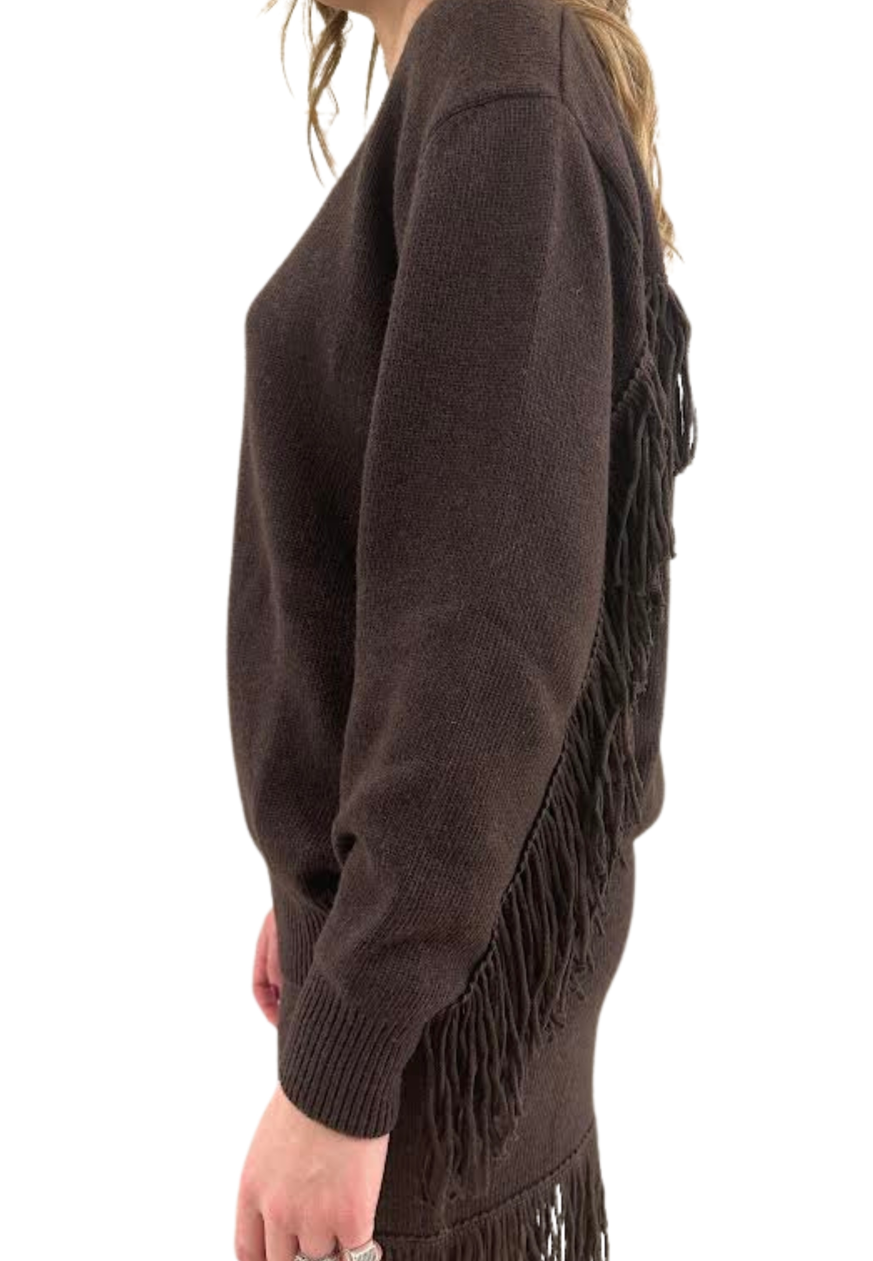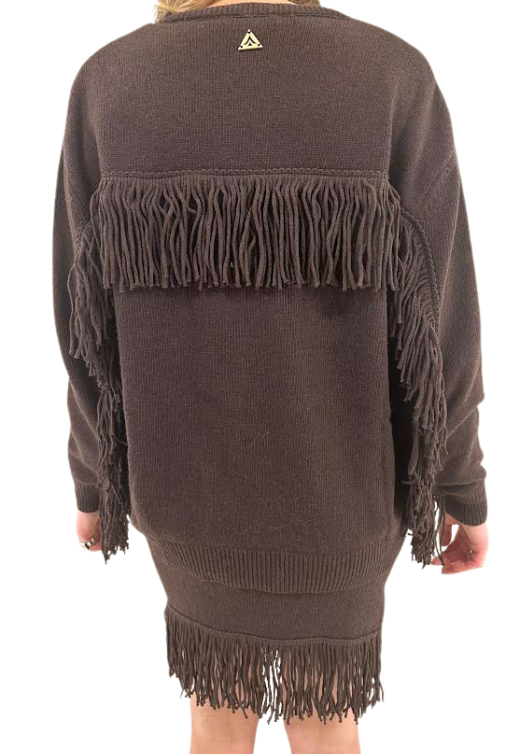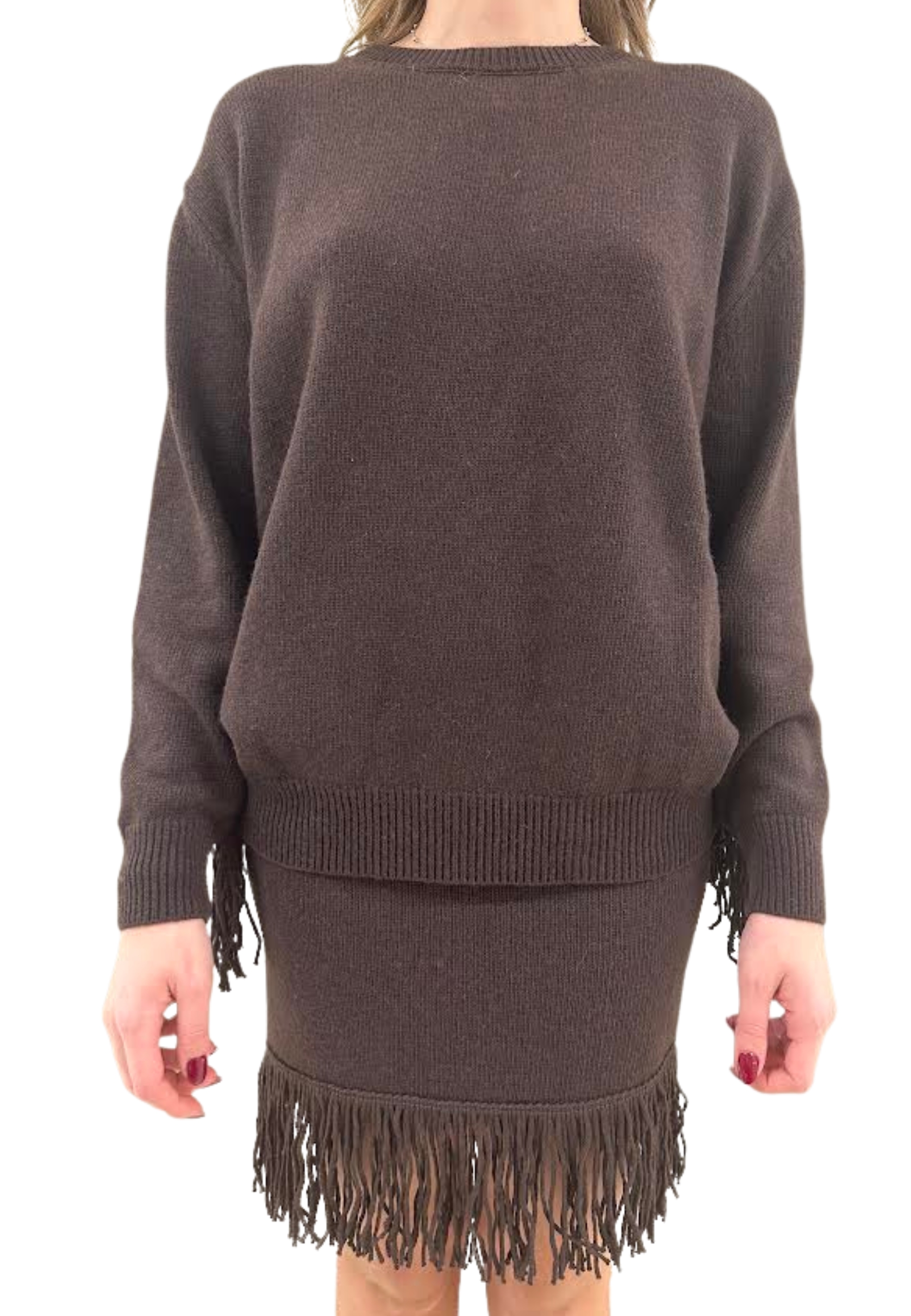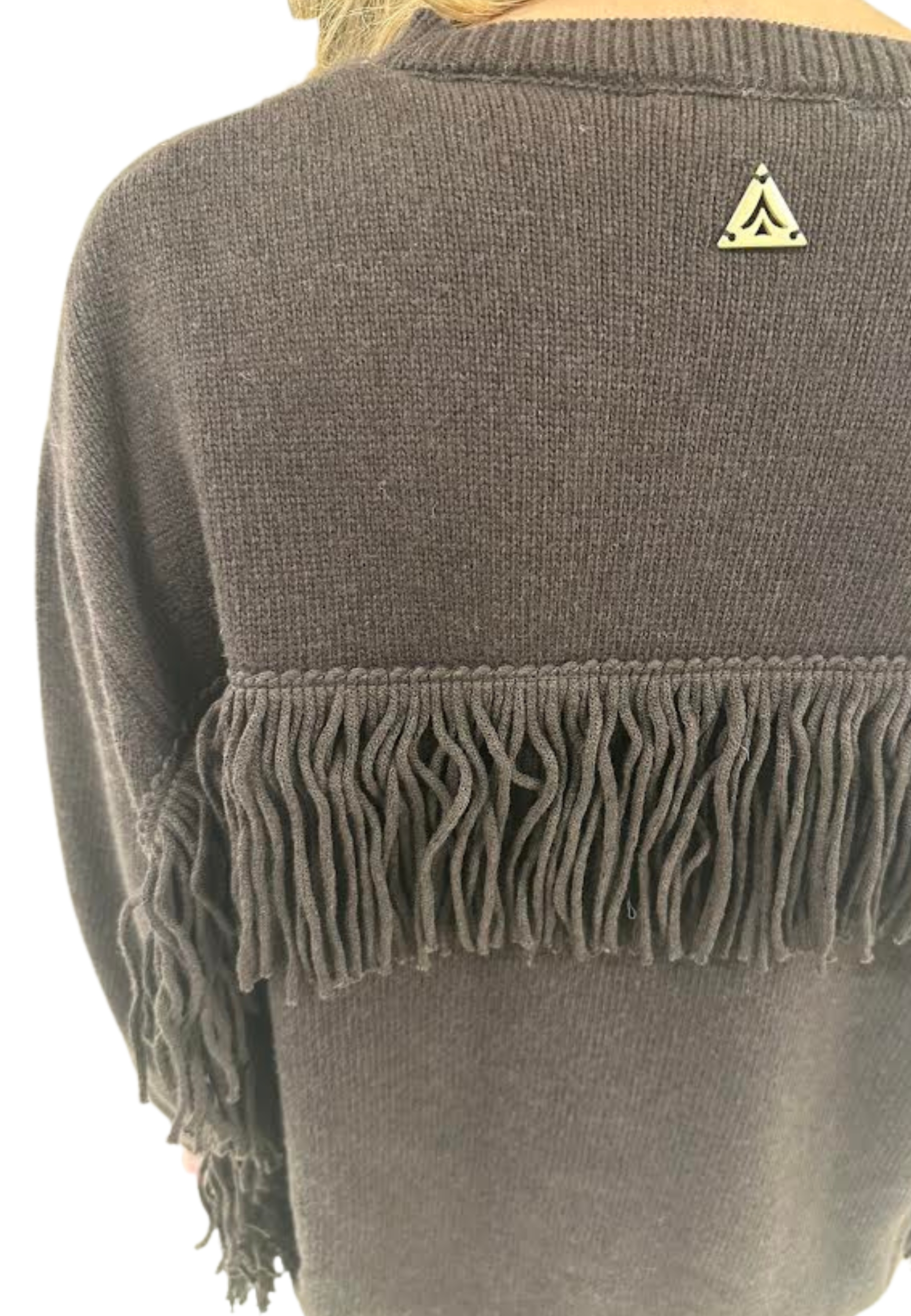 Maglia girocollo realizzata in pregiato misto cashmere, con frange applicate che aggiungono un tocco dinamico e contemporaneo. Il design essenziale del girocollo valorizza la morbidezza del filato e la cura nei dettagli. Perfetta da indossare con pantaloni sartoriali o denim, per un look sofisticato ma disinvolto, adatto a ogni momento della giornata.