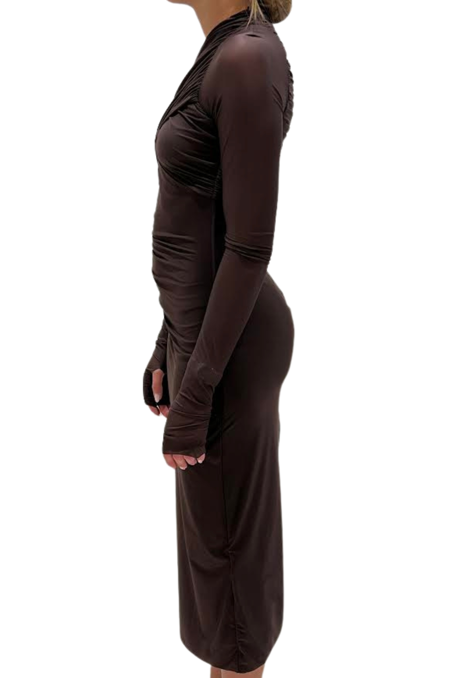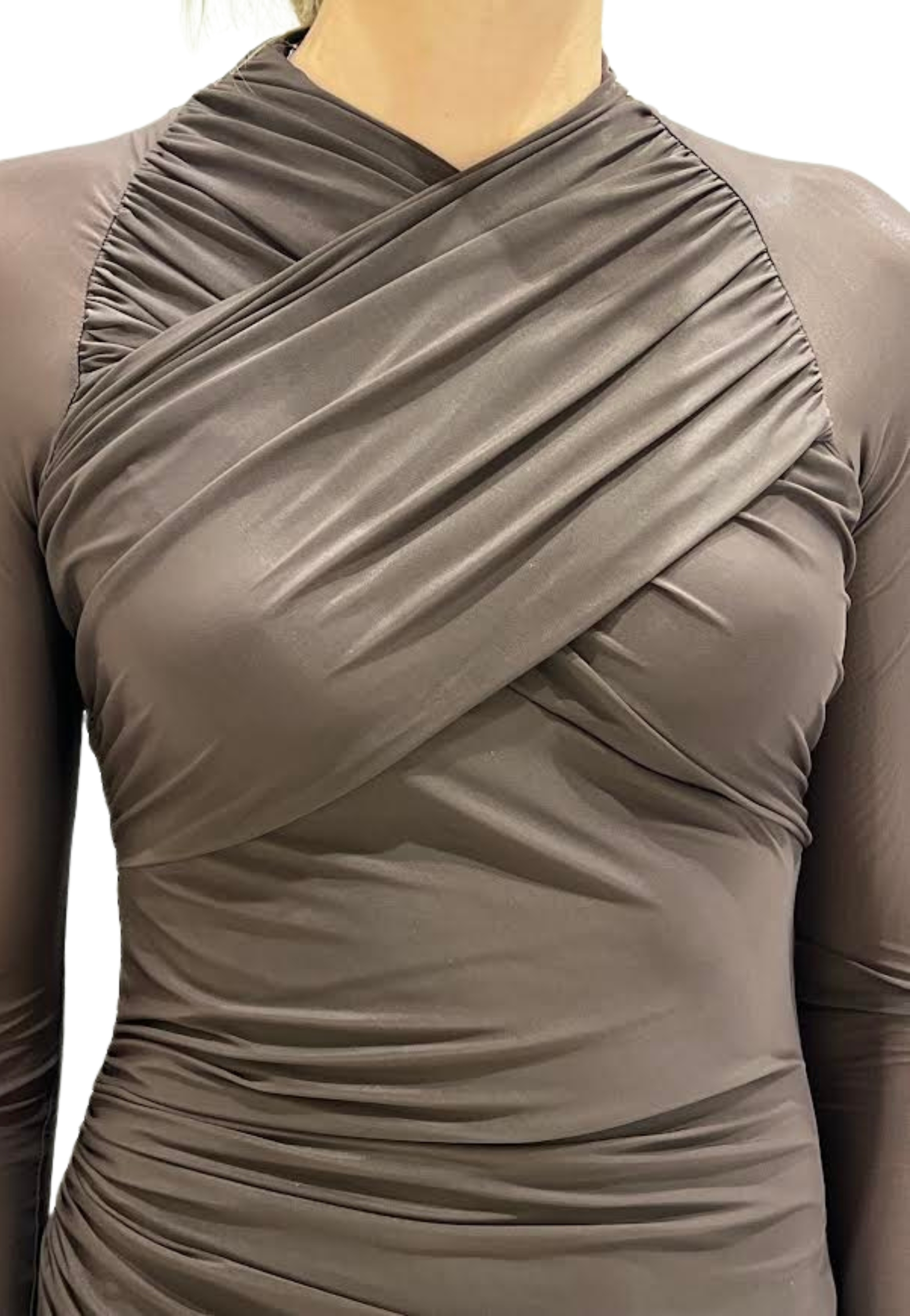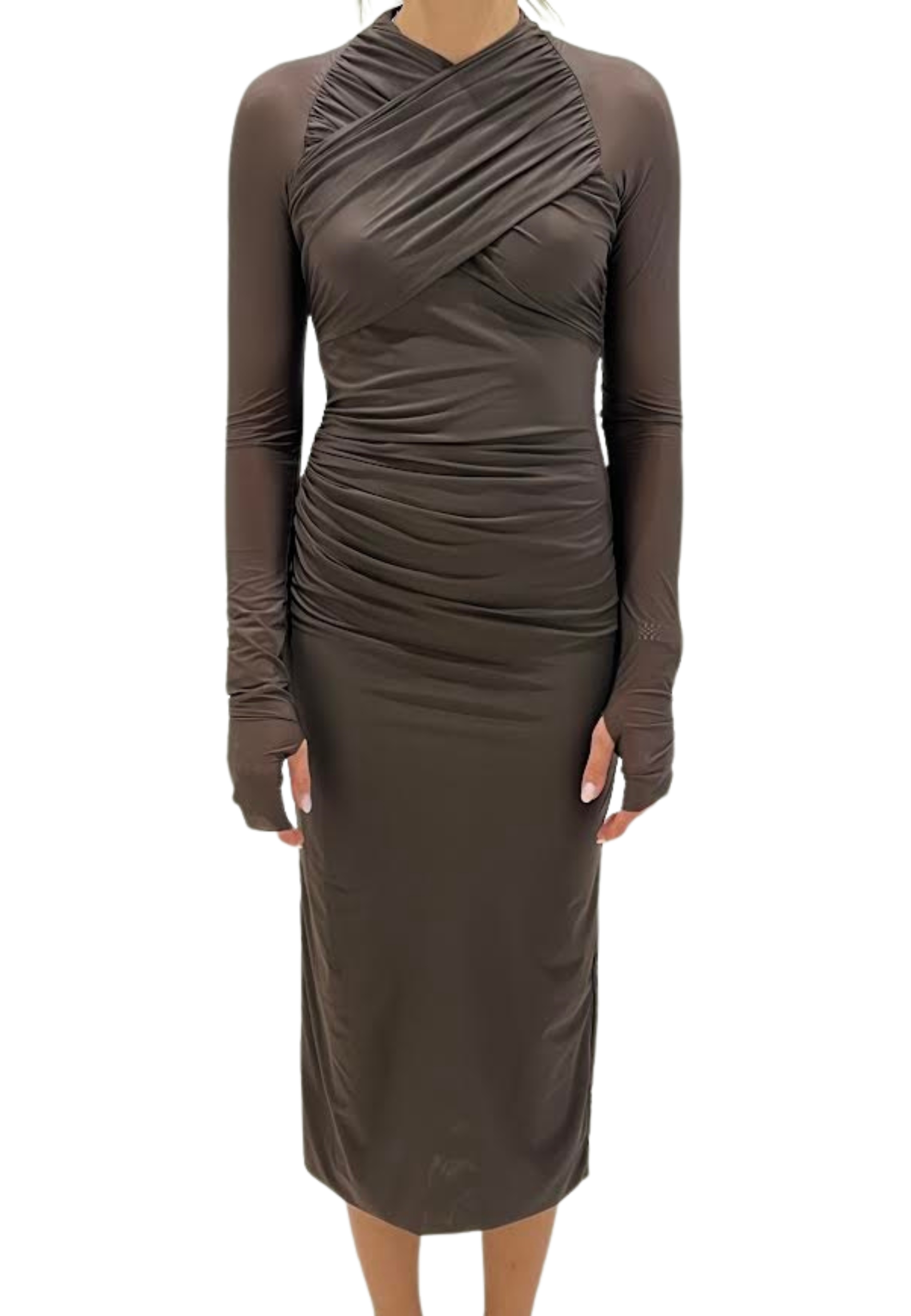 L'abito midi a maniche lunghe Scandal si distingue per lo scollo incrociato che disegna il busto con tensione scenica. Un dettaglio amplificato dal drappeggio che si muove attorno al corpo.