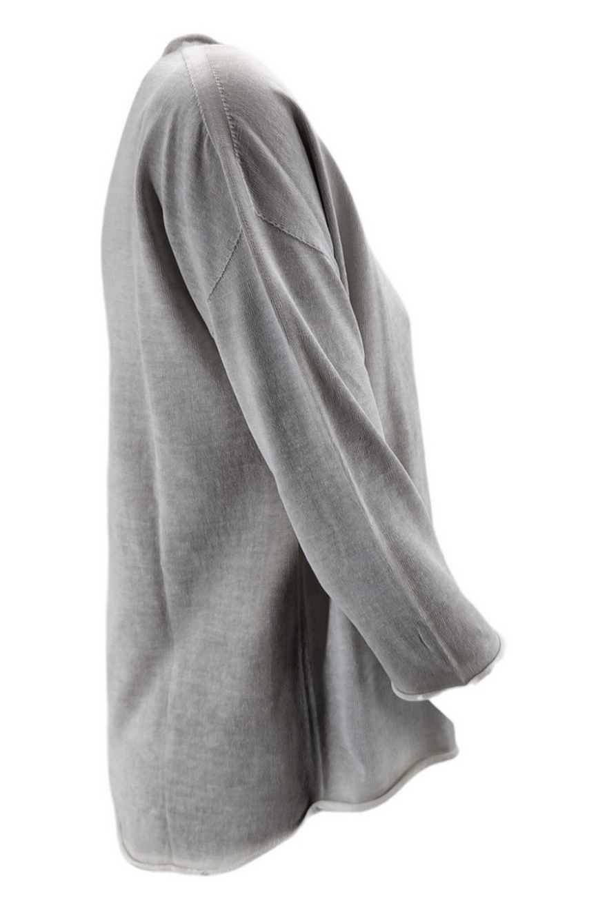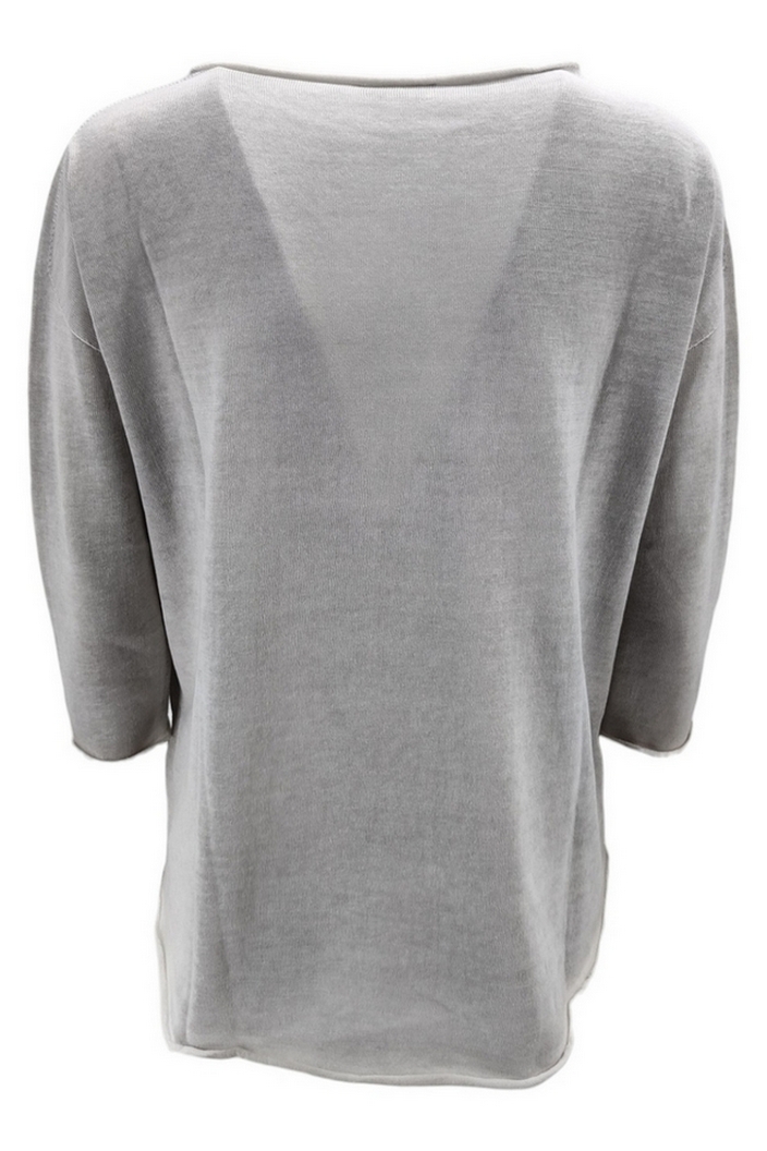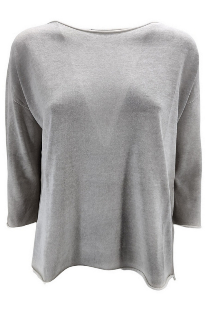 Maglia Arovescio. Modello over. Aereografata. Manica a tre quarti, scollo a barchetta. Lunghezza asimmetrica. Vestibilità morbida. Composizione: 100% cotone. Made in Italy.