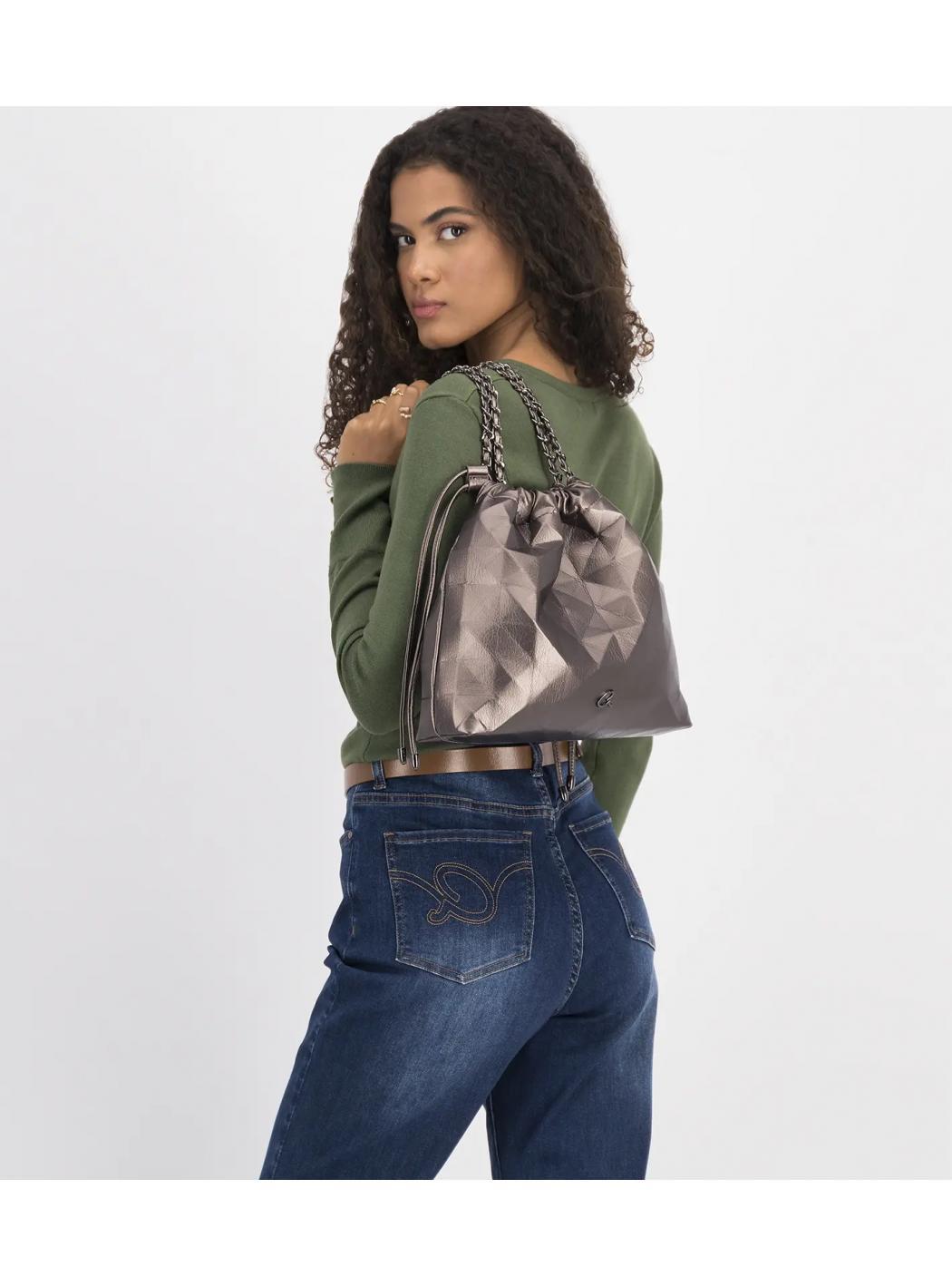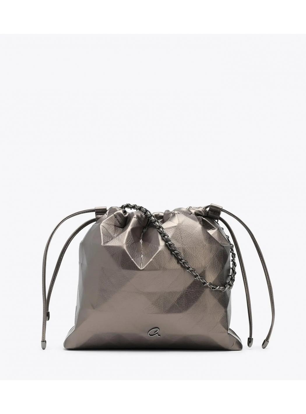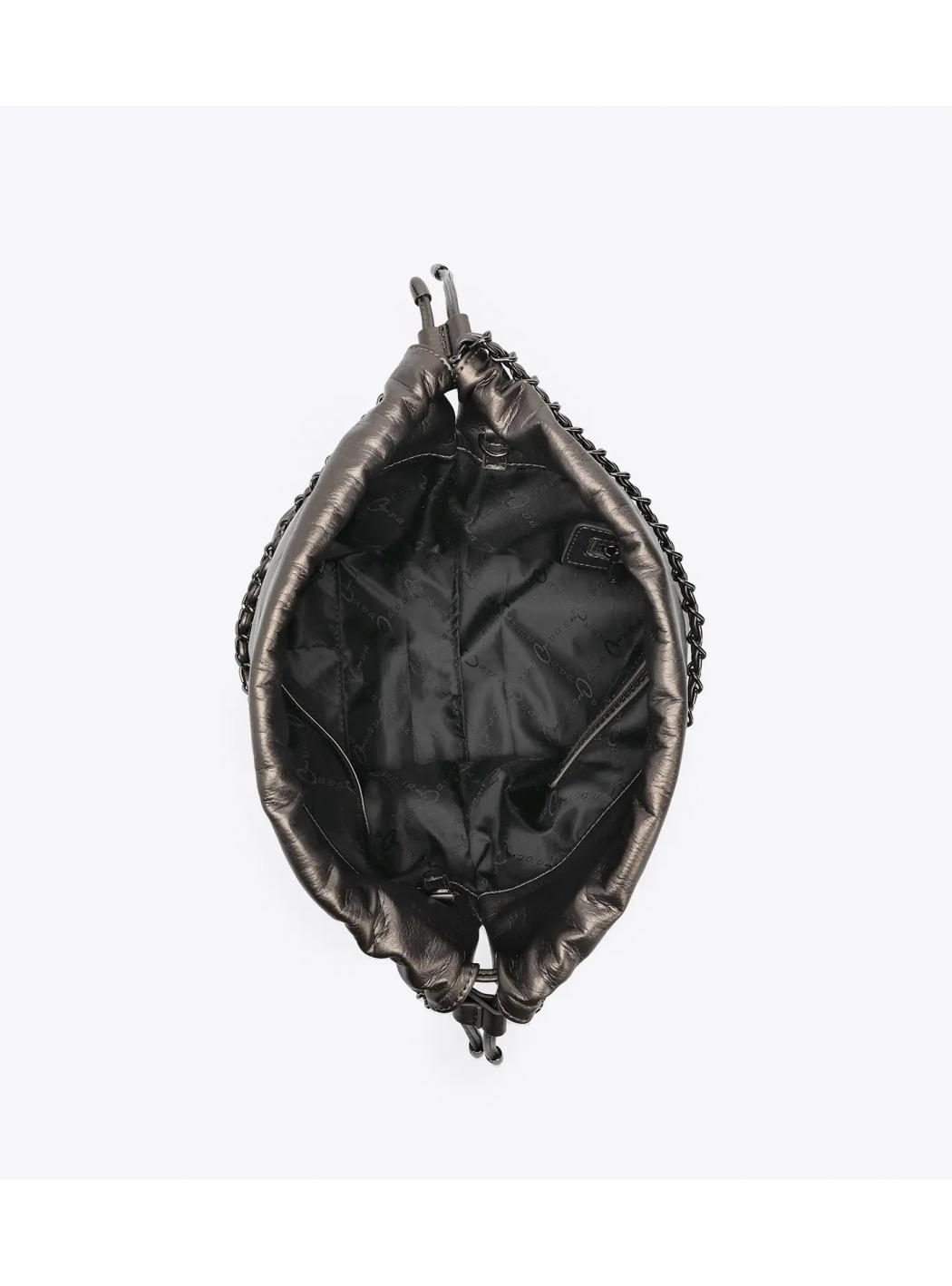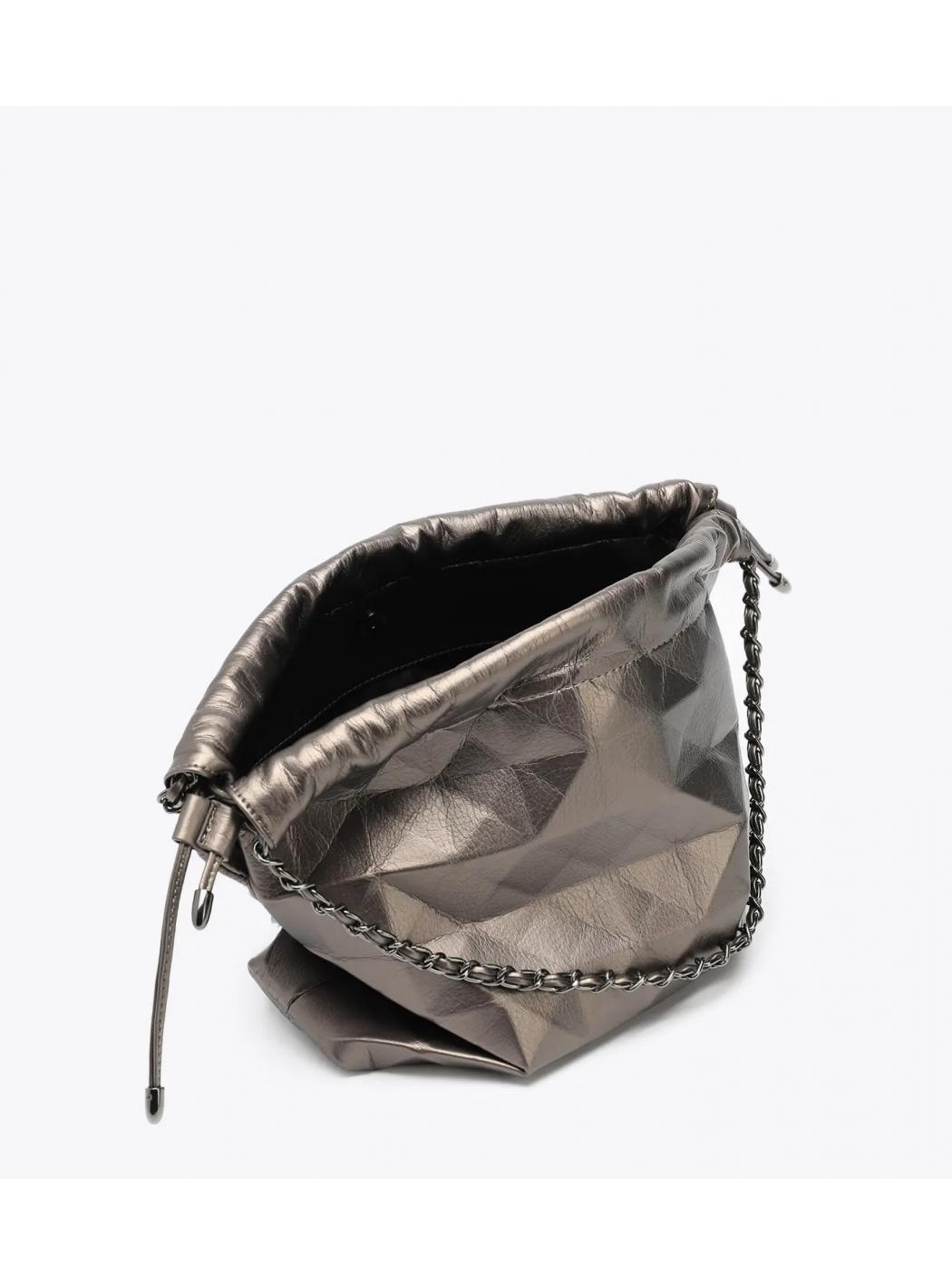 Bellissimo secchiello con catena e tracolla di colore grigio canna di fucile. Un accessorio unico e giovanile per gli outfit di tutti i giorni.