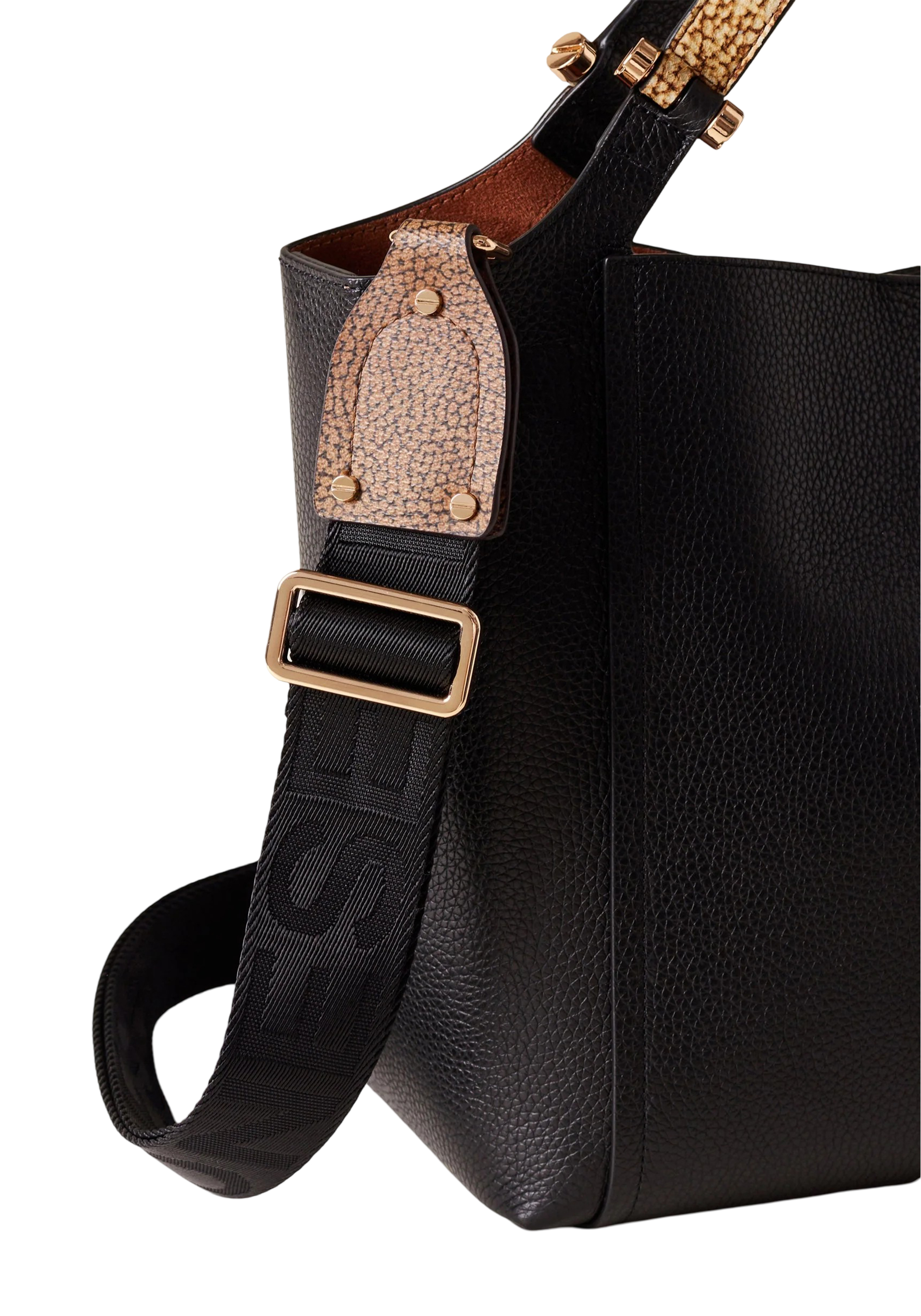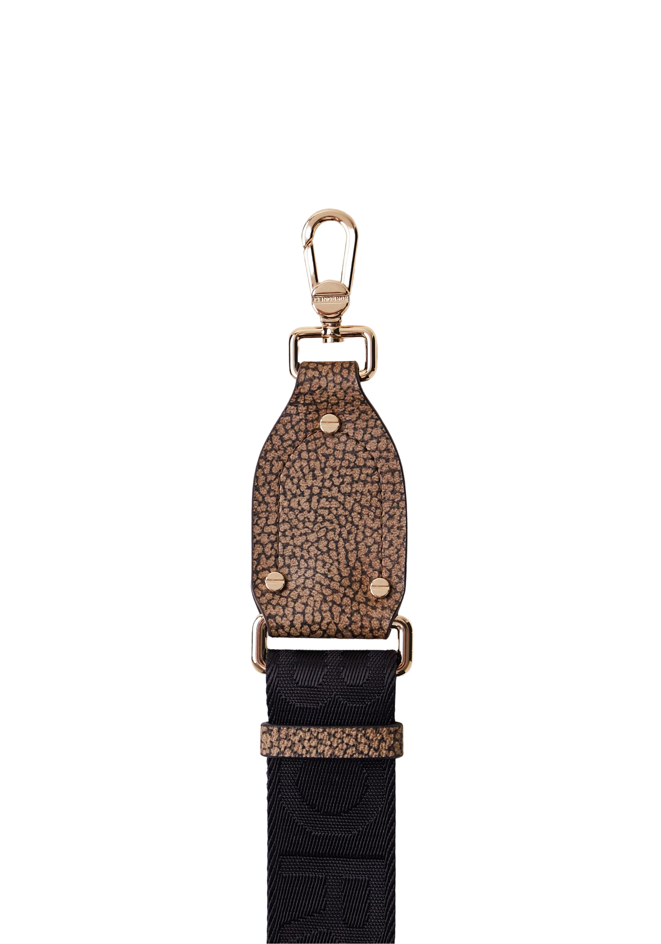 Tracolla di tessuto riciclato e tela rivestita OP. Regolabile e interscambiabile, è la tracolla che regala a ogni borsa Borbonese ancora più carattere e personalità. Lunghezza min: 80 cm lunghezza max: 127 cm.