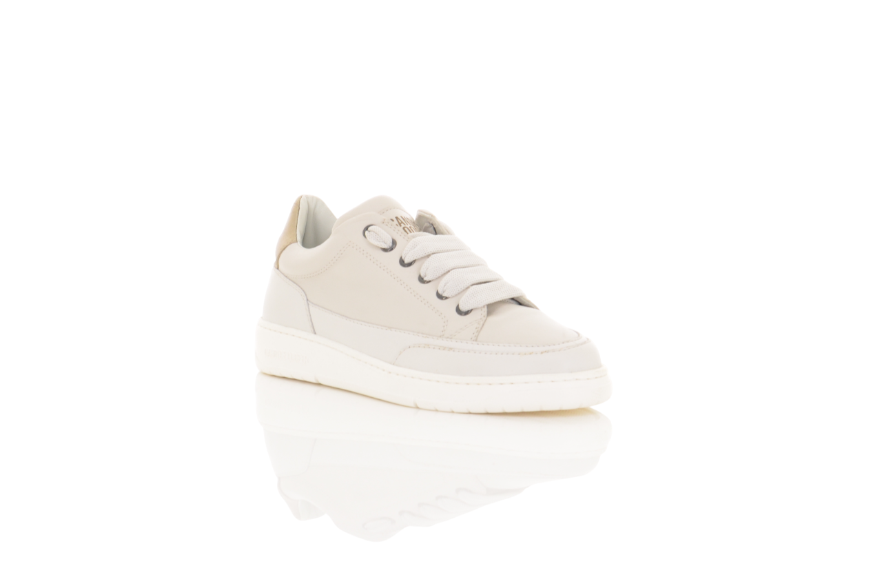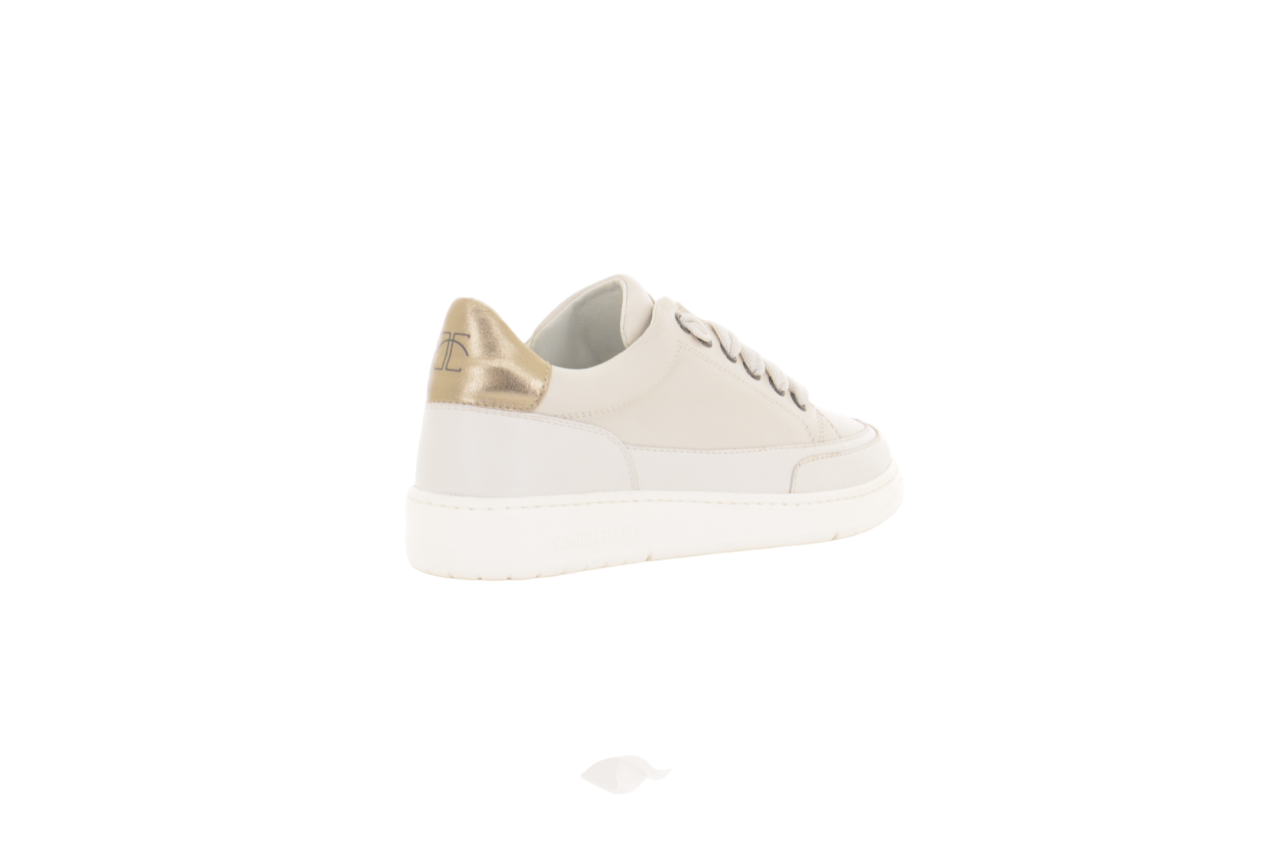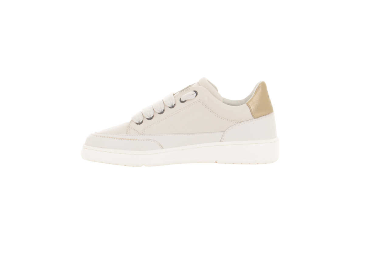 Questa sneaker minimal ed elegante è perfetta per chi ama lo stile pulito e raffinato. Realizzata in pelle liscia color crema, presenta una linea sobria e dettagli curati come i passalacci metallici e il tallone dorato a contrasto, che aggiunge un tocco di luminosità. La suola bianca spessa assicura comfort e stabilità senza rinunciare all’estetica. Versatile e discreta, è la scarpa ideale per completare look casual o smart-casual con un tocco di classe.