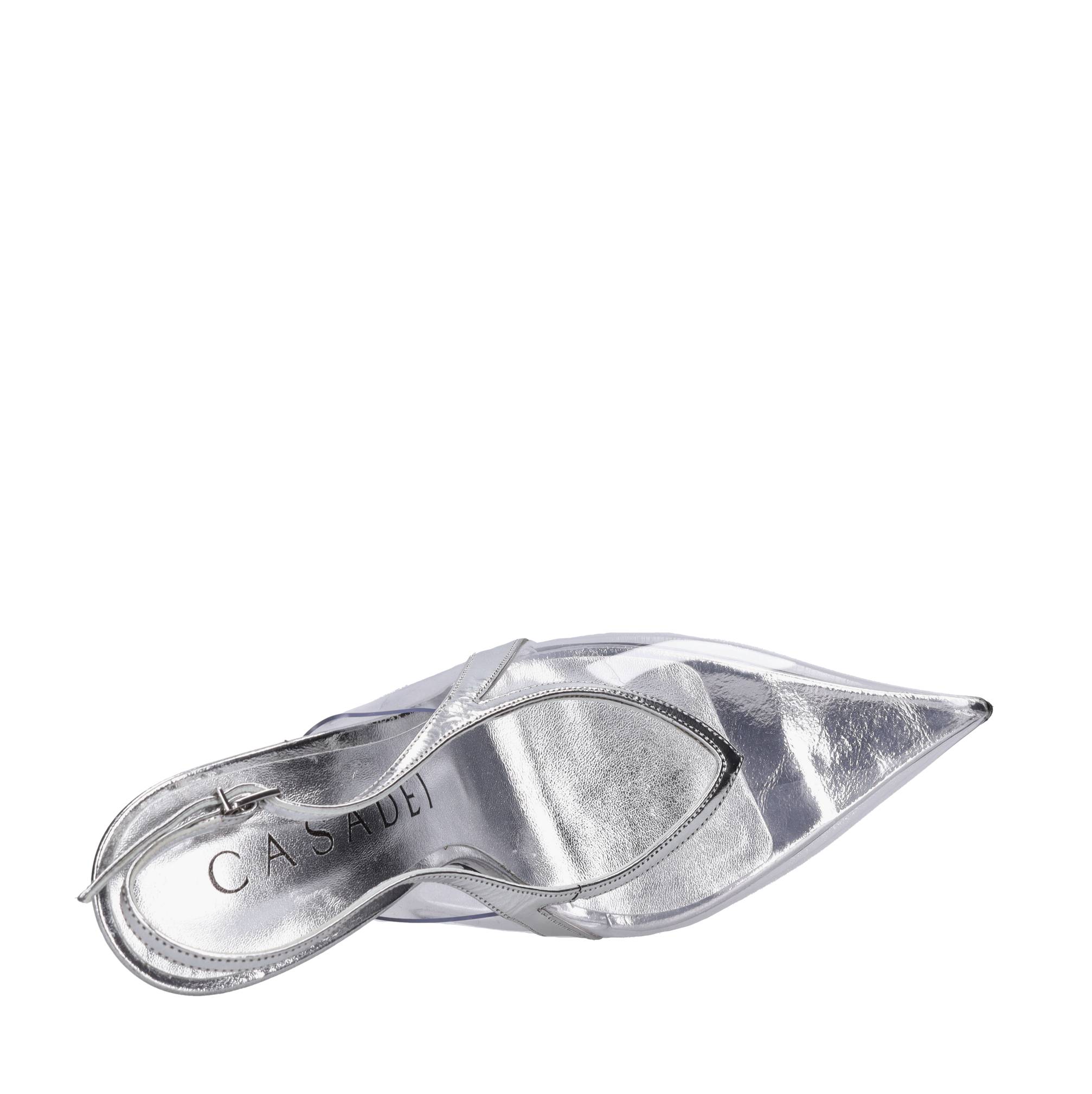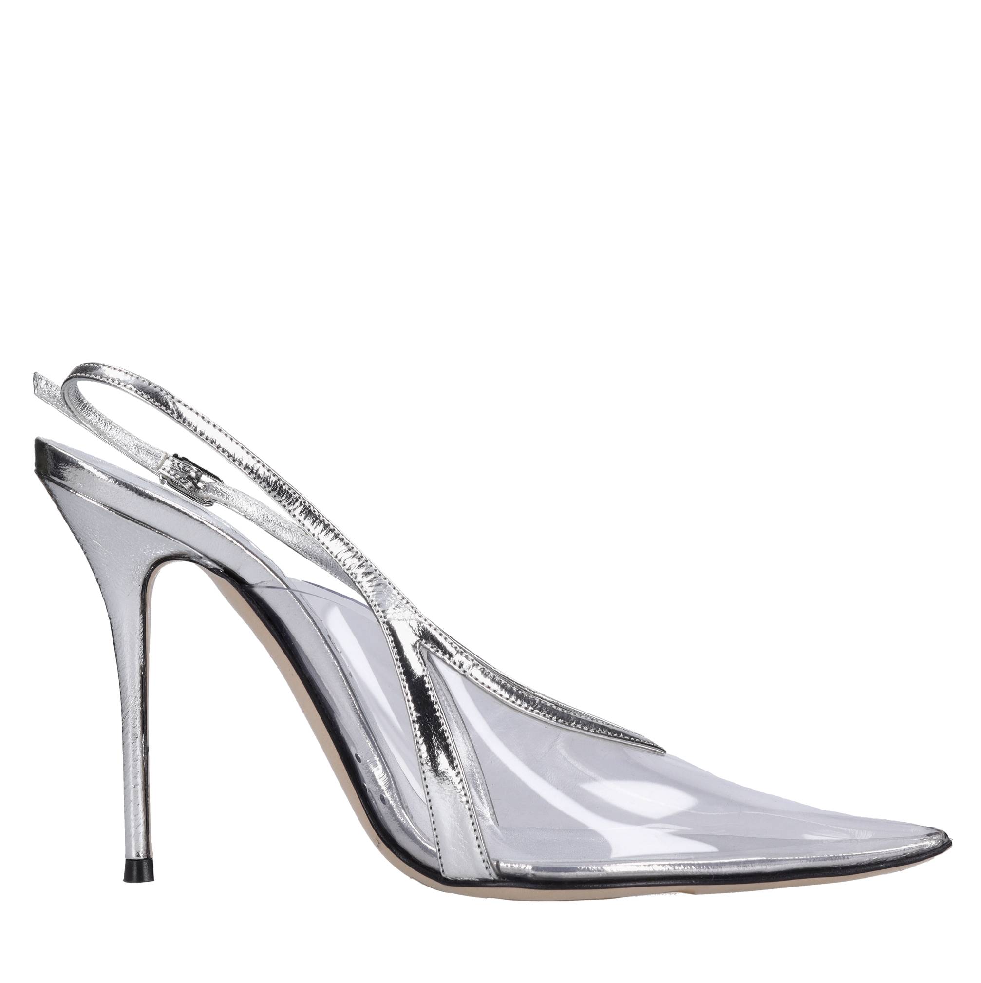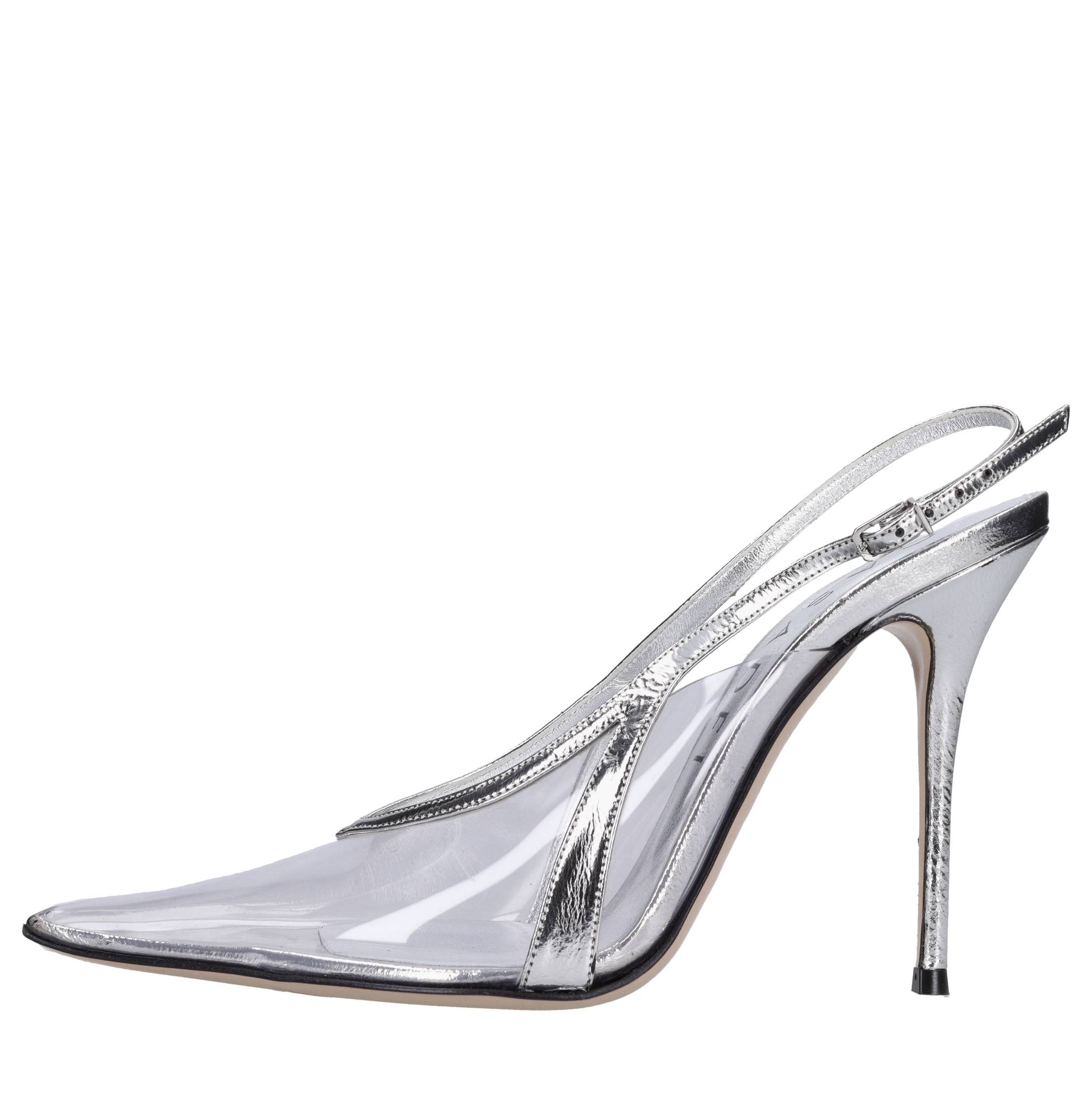 Décolleté slingback in pelle e plexi. Suola esterna in cuoio. Tomaia interna in pelle e plexi. Piccole imperfezioni sul pellame . Campionario. Spedito su scatola neutra. Sconsigliamo l'applicazione della gomma protettiva alla suola. Tale operazione altera l'equilibrio della scarpa e può causare la rottura del tacco. L'eventuale riparazione del danno a causa di tale modifica, qualora richiesta, sarà a carico del cliente.