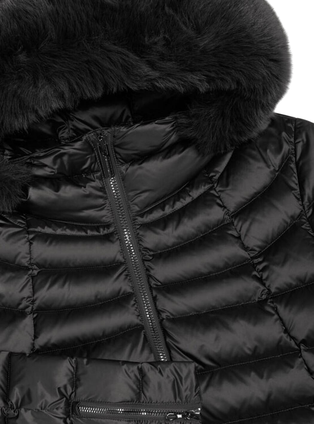 Le linee verticali slanciano la figura, mentre il cappuccio con pelliccia sintetica aggiunge un tocco romantico. Questa giacca imbottita è l'alleato perfetto per chi cerca stile e protezione, con le tasche laterali che completano il design.