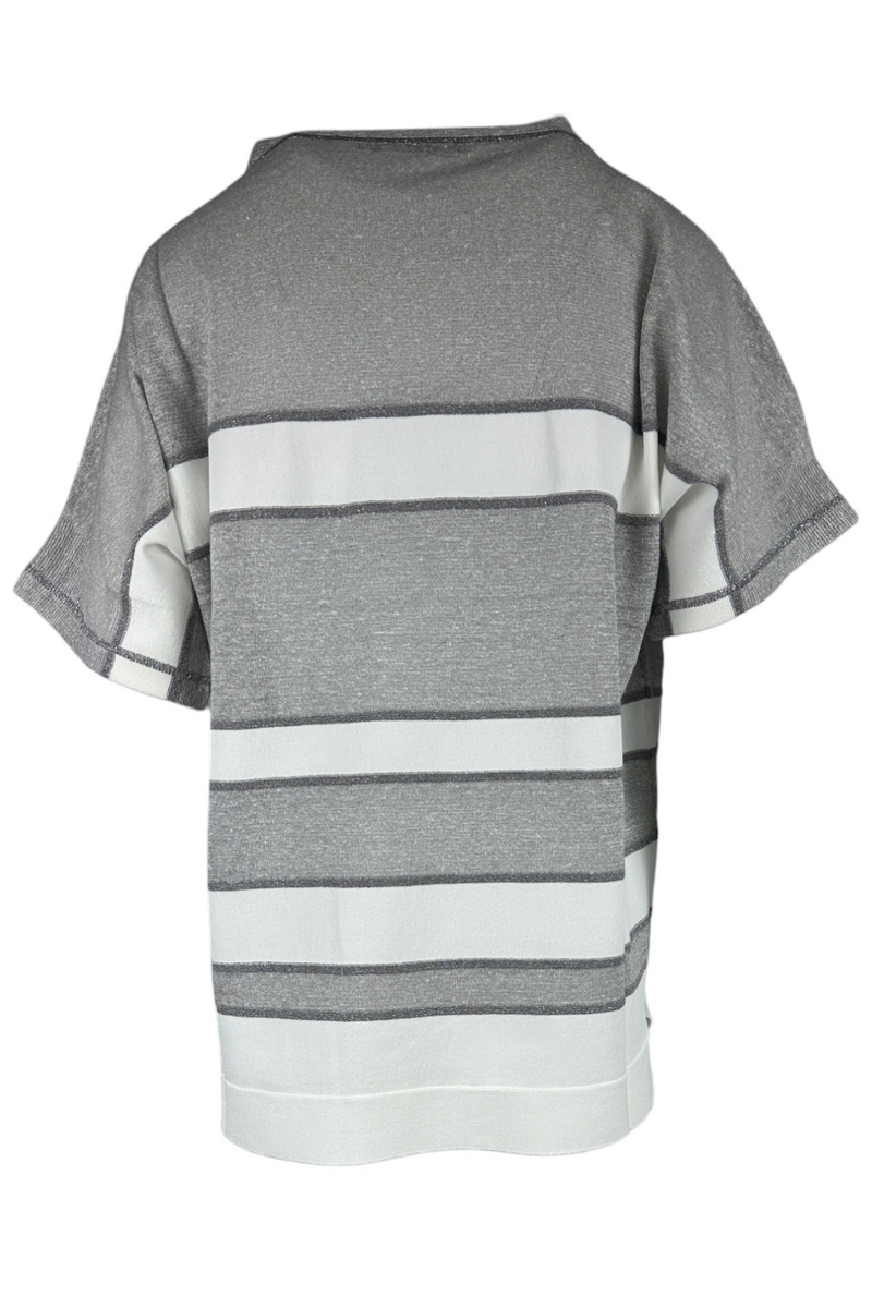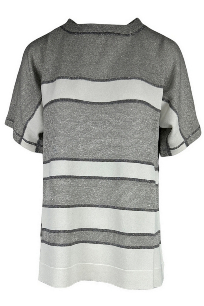 Maglia D.Exterior. Mezza manica. Fantasia a righe. Dettagli lurex.Vestibilità a scatola. Spacchetti laterali. Composizione: 40% lino, 41% viscosa, 7% poliestere, 9% poliammidica, 2% poliammidica. Made in Italy.