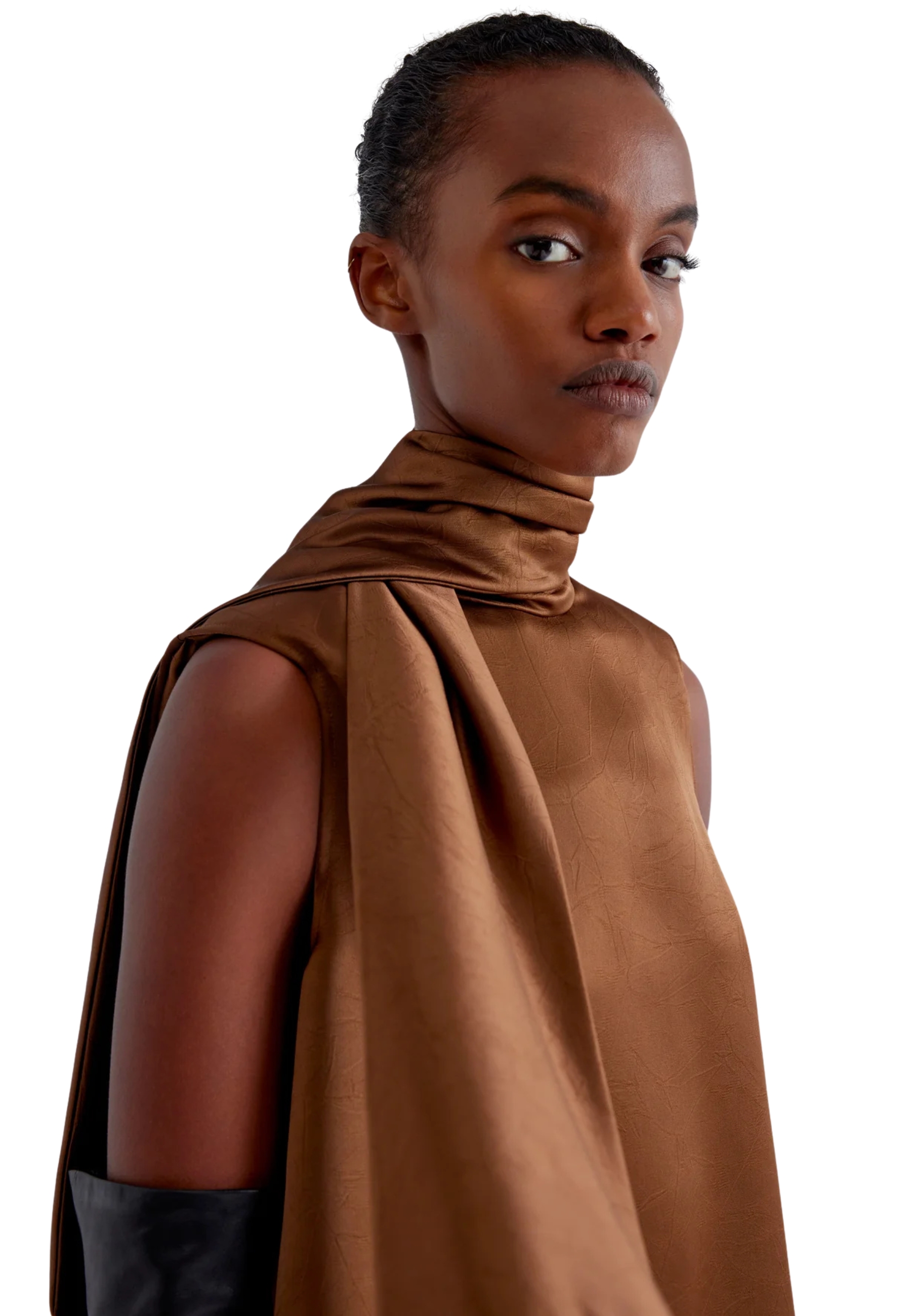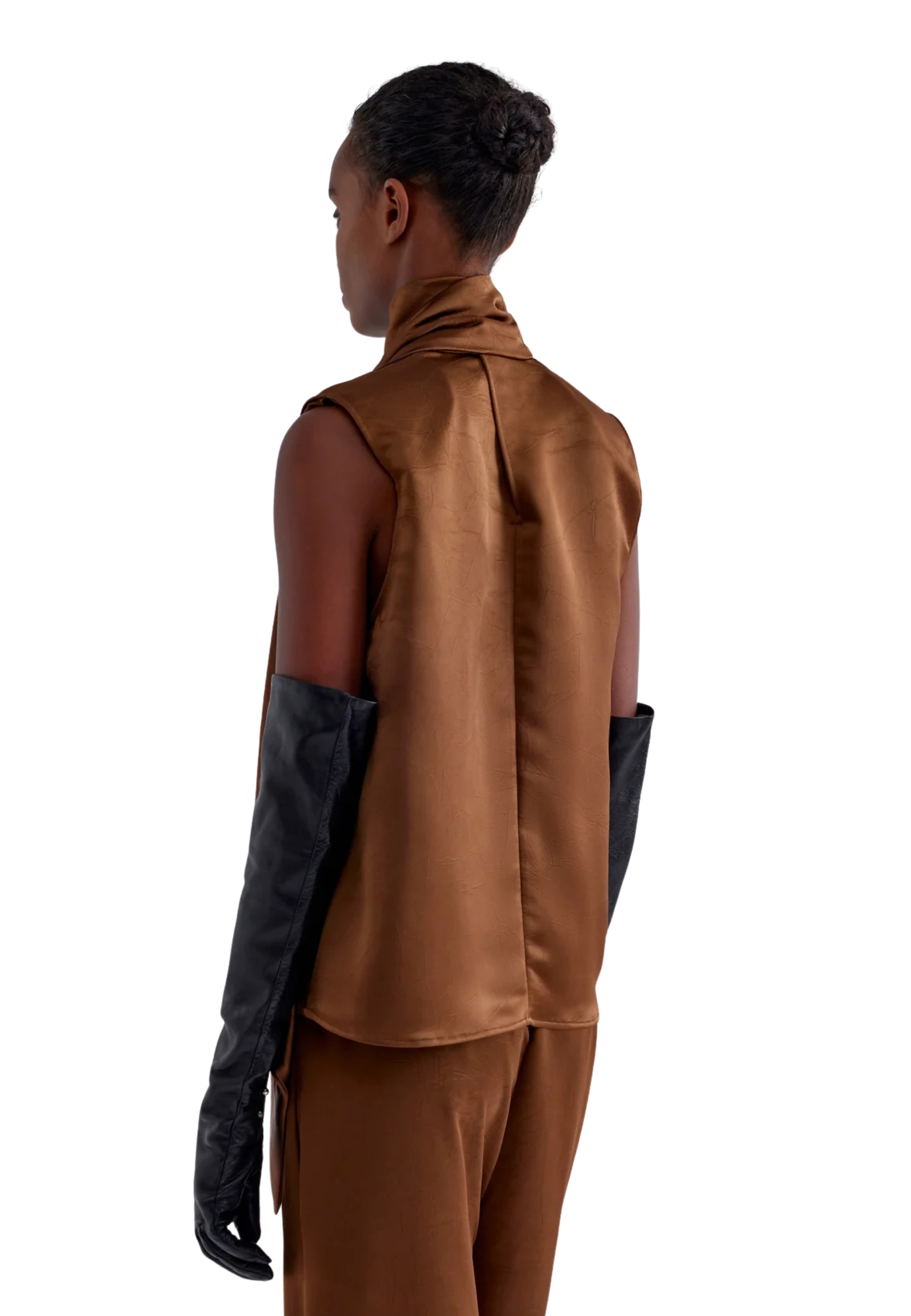BLUSA IN SATIN FRISSE', MODELLO SPALLA LARGA E COLLO ALTO APERTO SUL RETRO I CUI LEMBI PROSEGUONO IN SCIARPA.