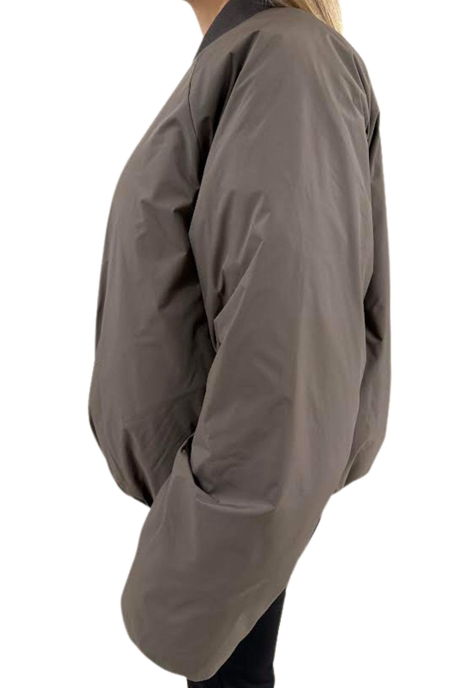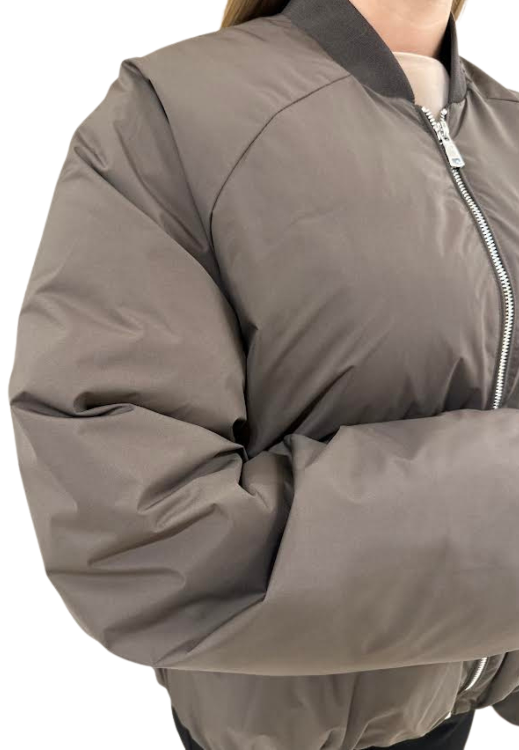 BOMBER IMBOTTITO, MODELLO CORTO AMPIO CHE SI STRINGE SUI FIANCHI E AL FONDO MANICHE, COLLETTO IN MAGLIA A COSTINA.