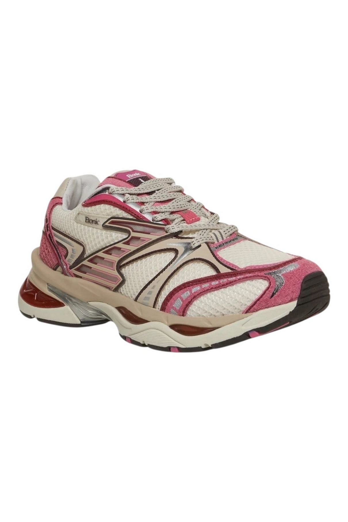Scarpe Etonic modello Kendari 3.0. Tomaia in mesh bianco traspirante. Dettagli scamosciati ed ecopelle, logo Etonic in rilievo, silhouette robusta con pannelli perforati per la ventilazione, tallone a sbalzo ammortizzato.