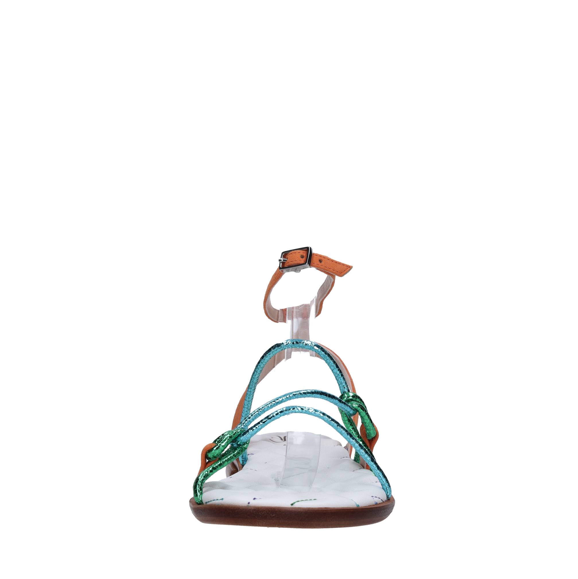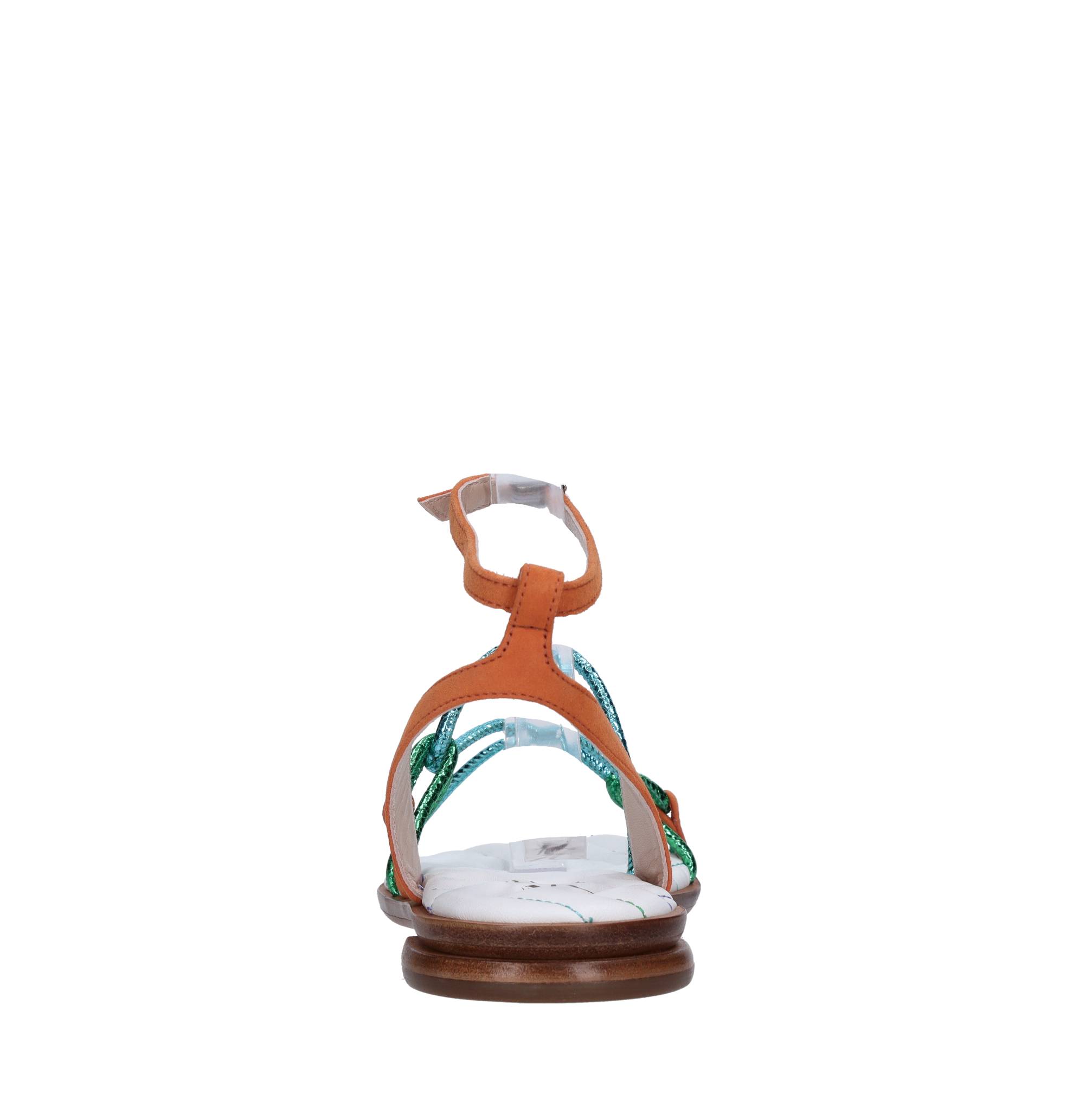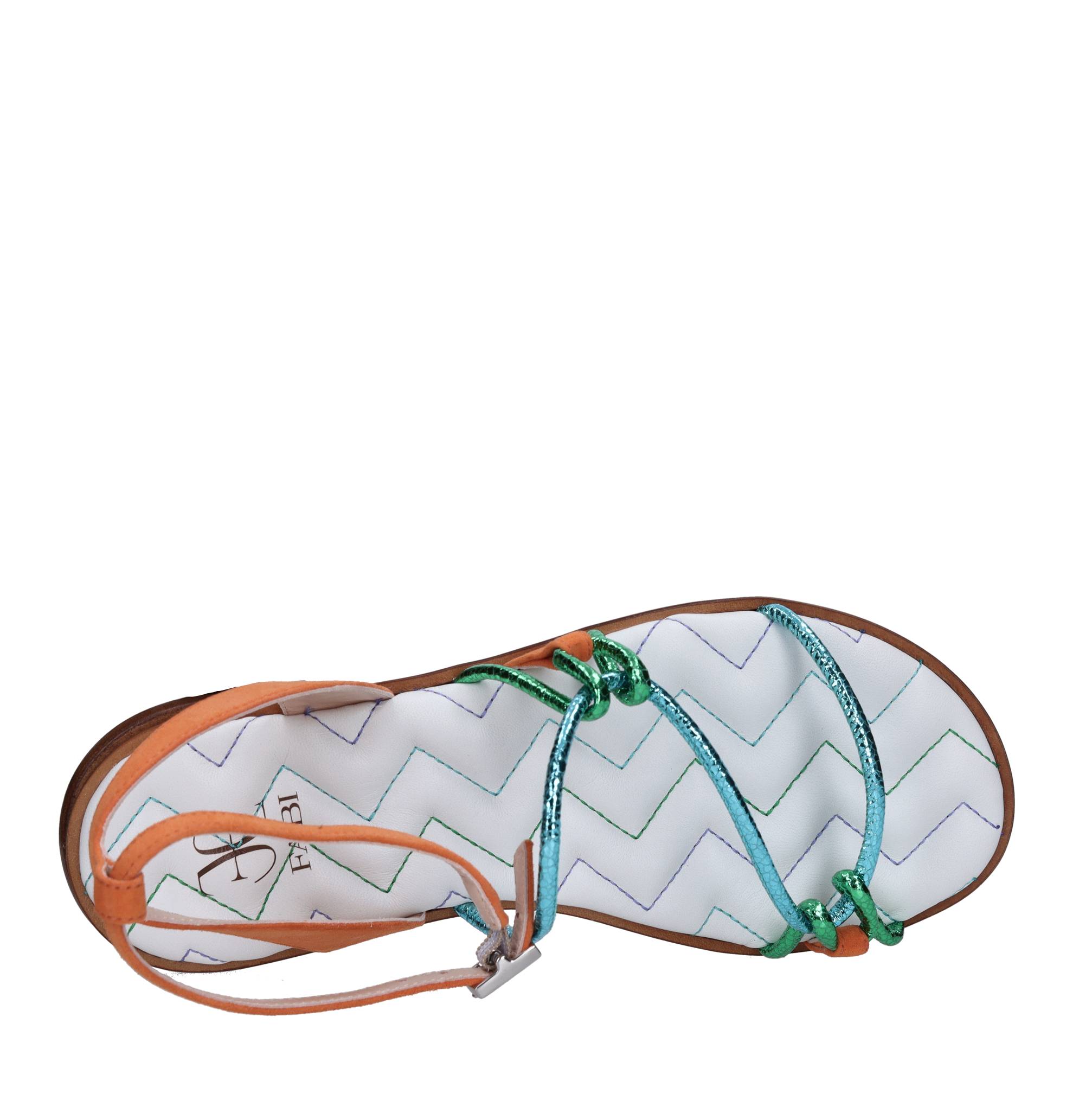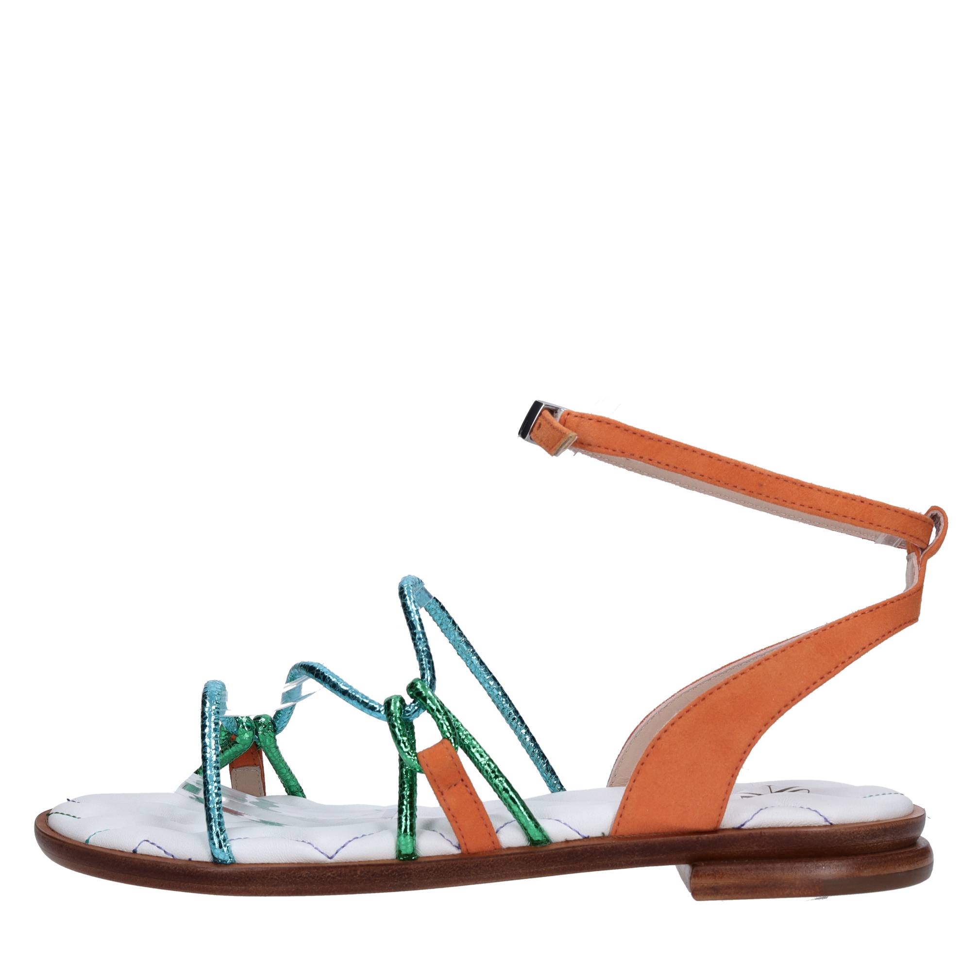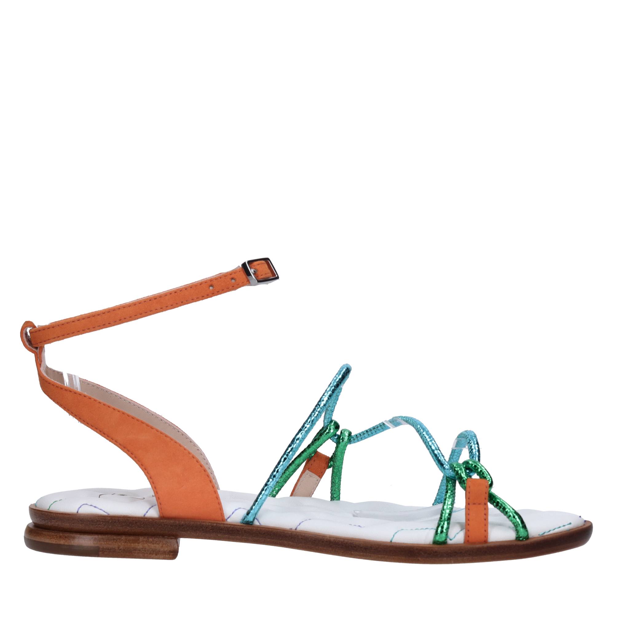 Sandali flat in pelle e camoscio. Suola esterna in cuoio. Tomaia interna in pelle. Cinturino con fibbia.