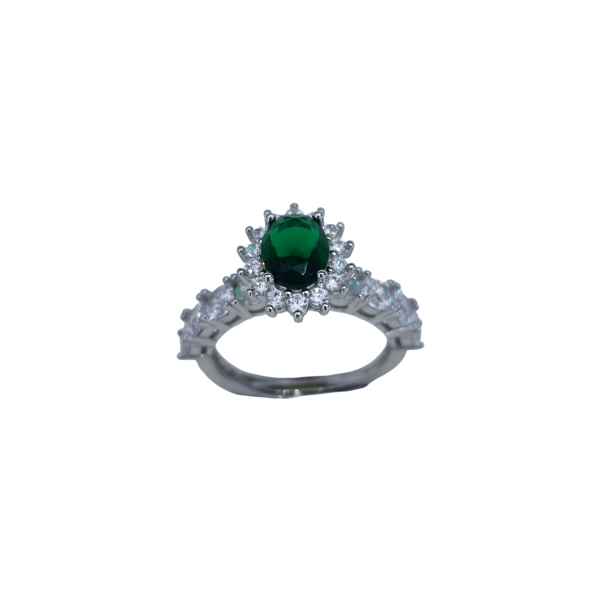 Anello In Argento Con Zircone Verde e Contorno di Zirconi Bianchi.
