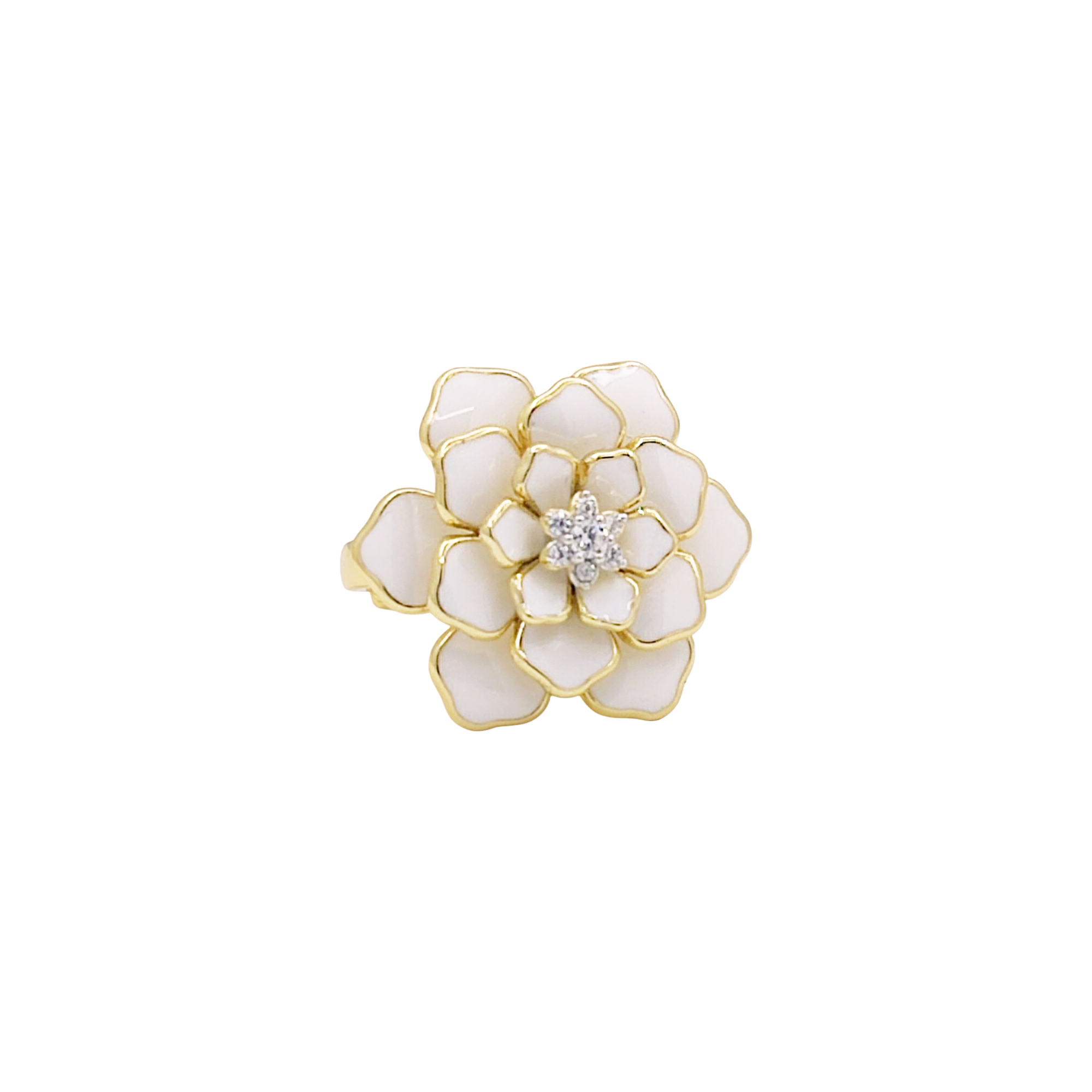 Anello In Argento 925% Dorato Modello Con Fiore E Petali Smaltati Bianchi Con Zirconi Bianchi Centrali.