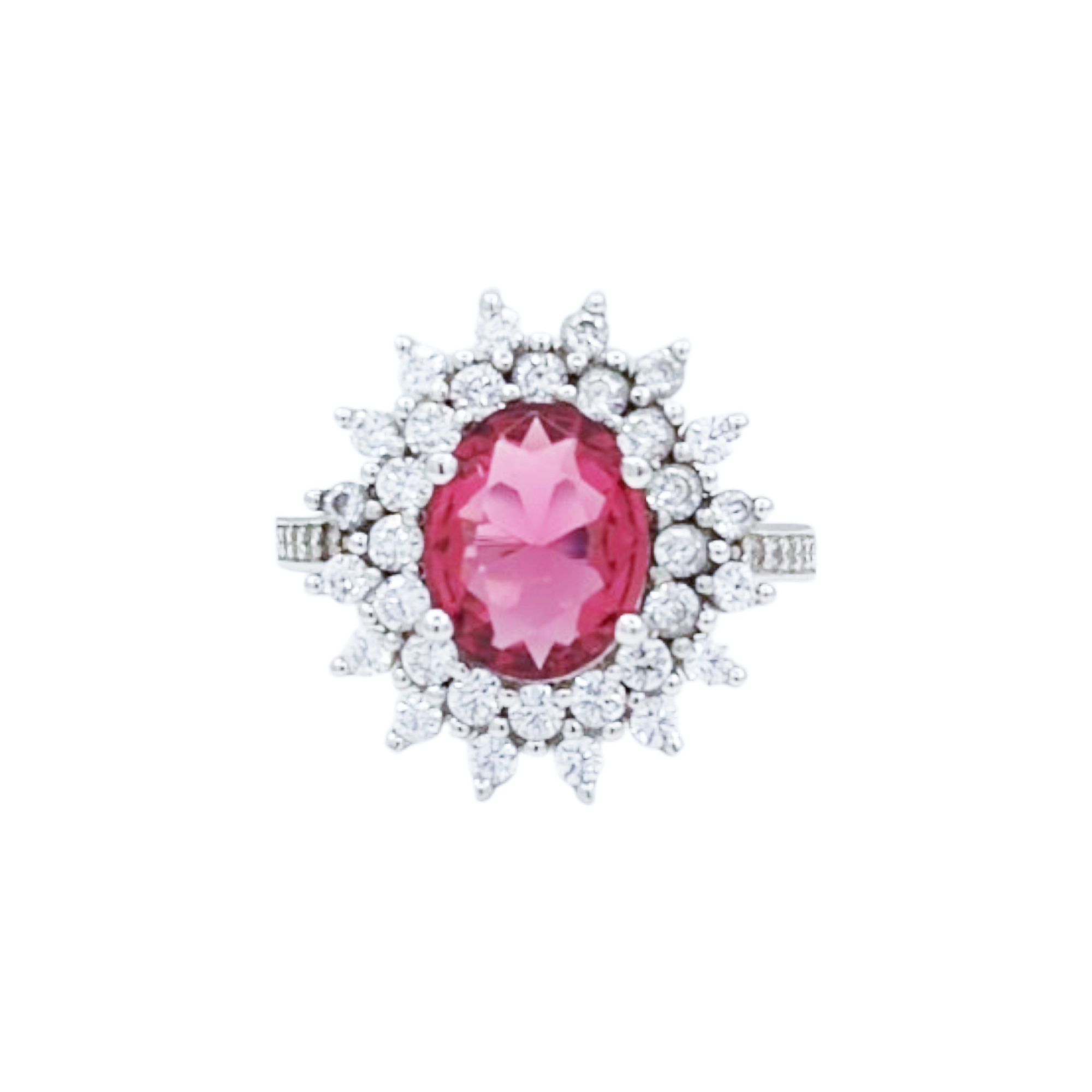 Anello In Argento 925 Modello Con Zircone Rosso Ovale Centrale Circondato Da Due File Di Zirconi Bianchi Fin Sul Gambo