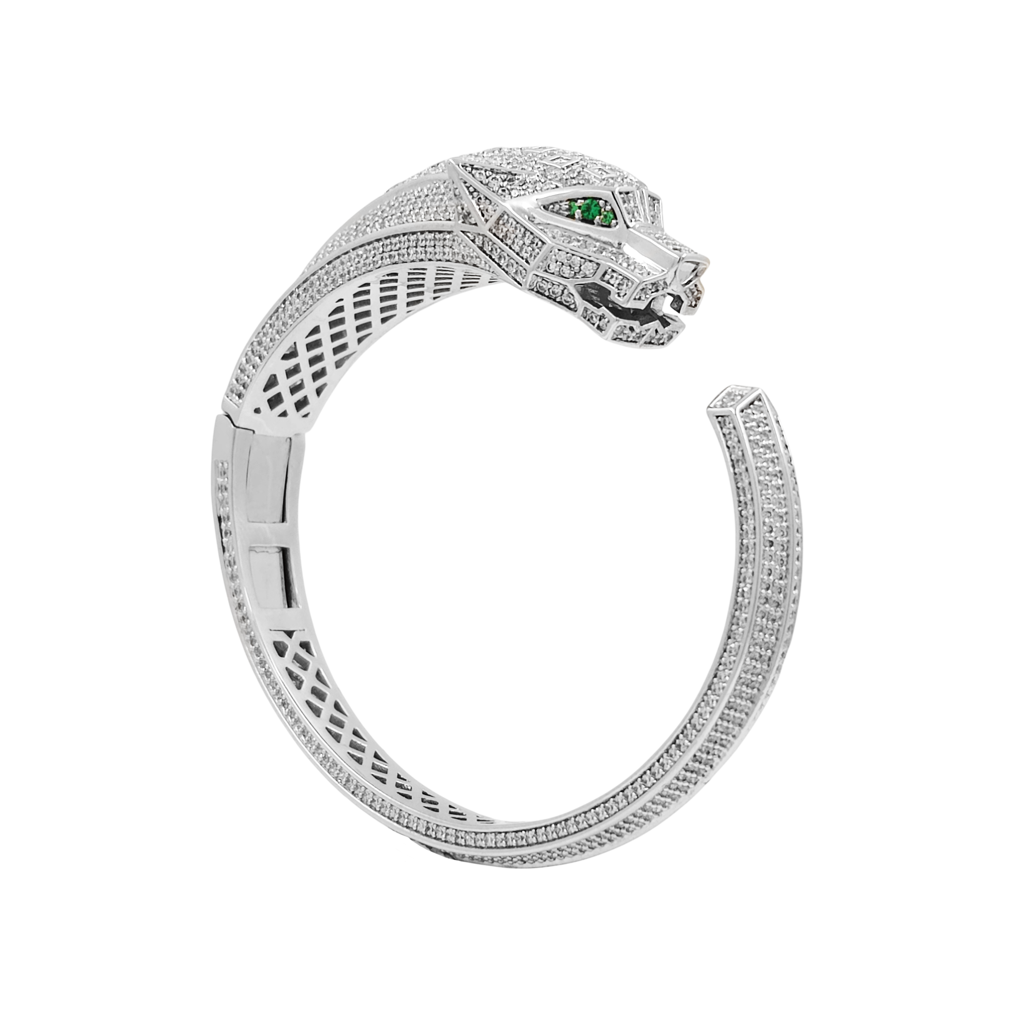 Bracciale Rigido In Argento 925%, Modello Serpente Con Occhi In Zirconi Verdi.