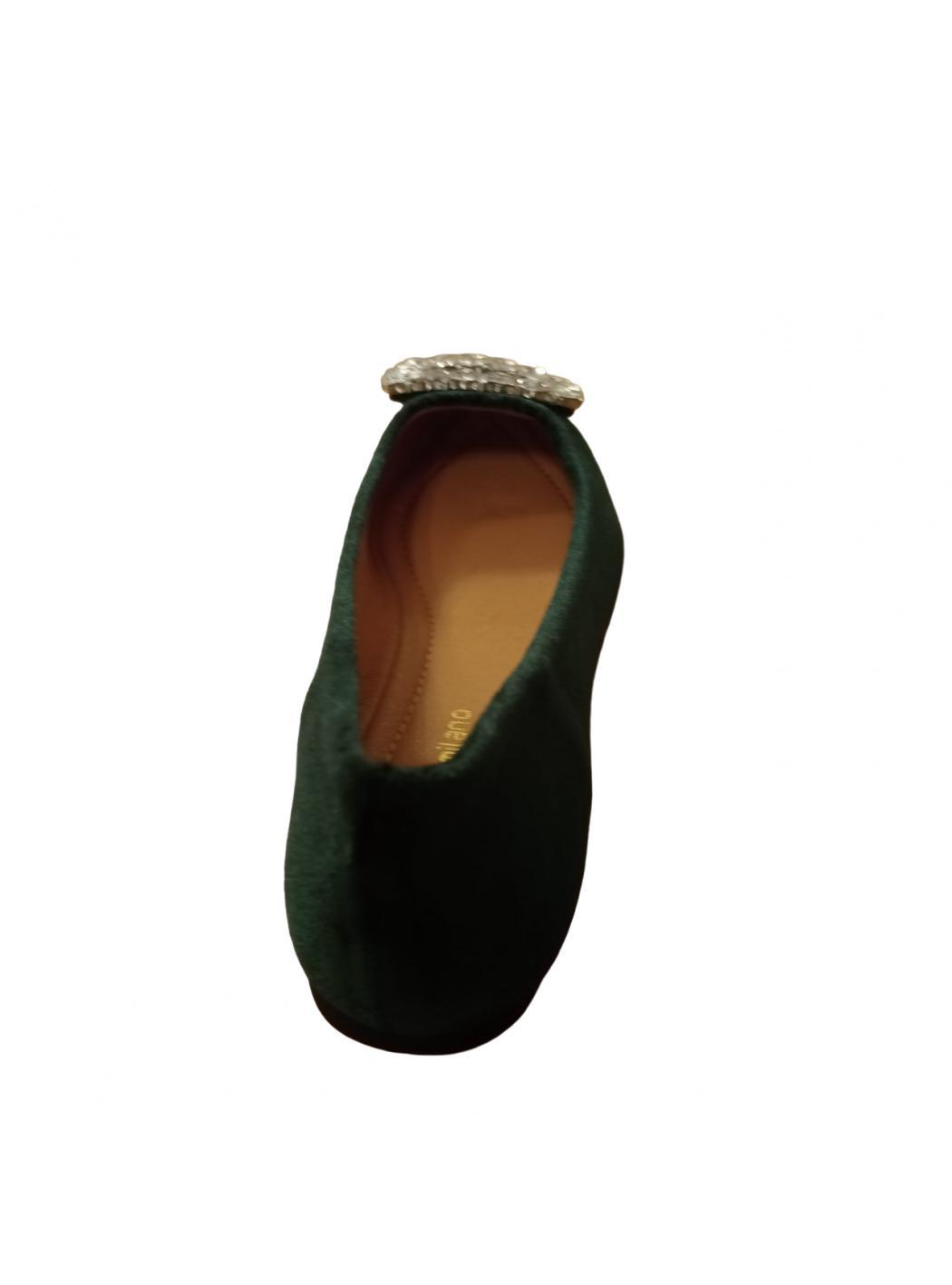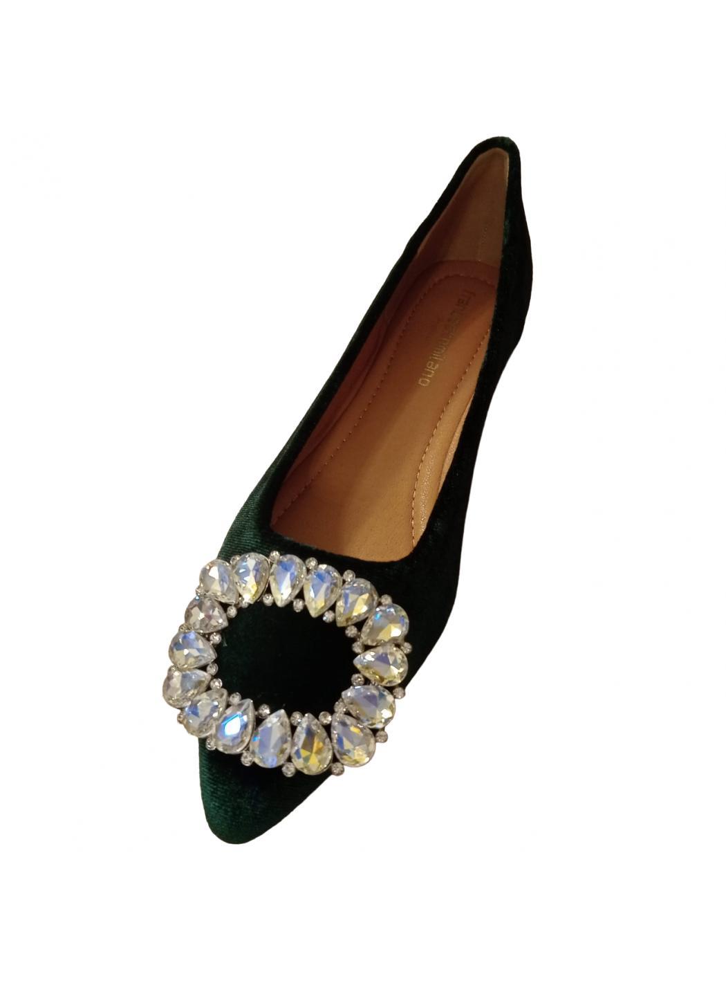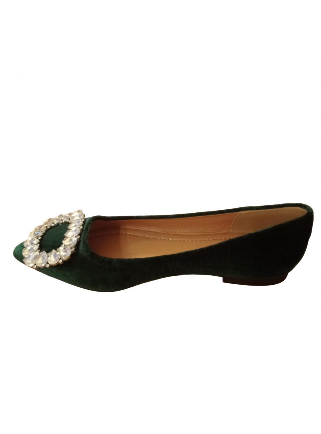Ballerine in pelle effetto cavallino verdone. Applicazione di pietre trasparenti luccicanti sulla punta.