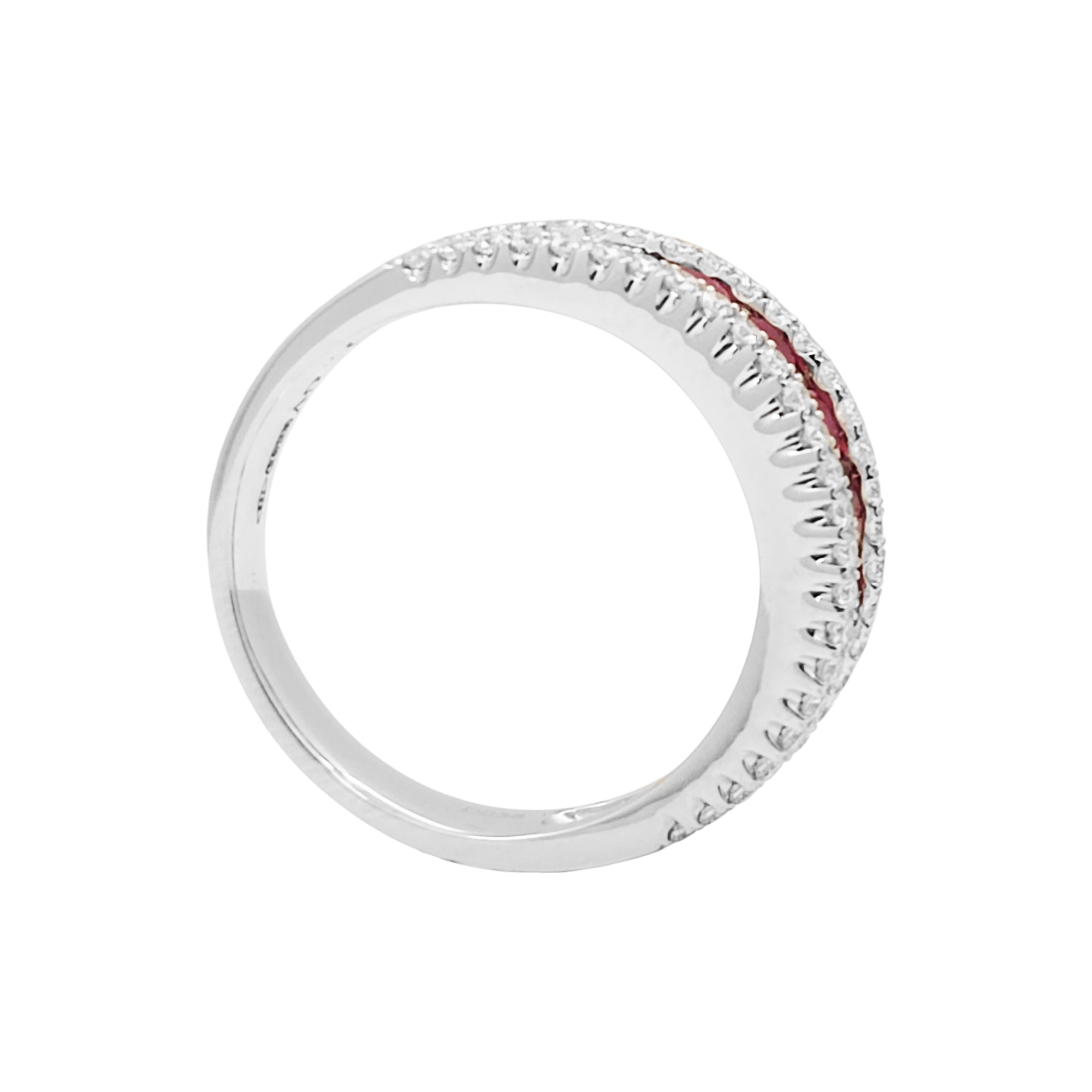 Anello in Oro Bianco 750% Modello A Fascia Con Rubini Taglio Brillante E Diamanti Taglio Brillante.