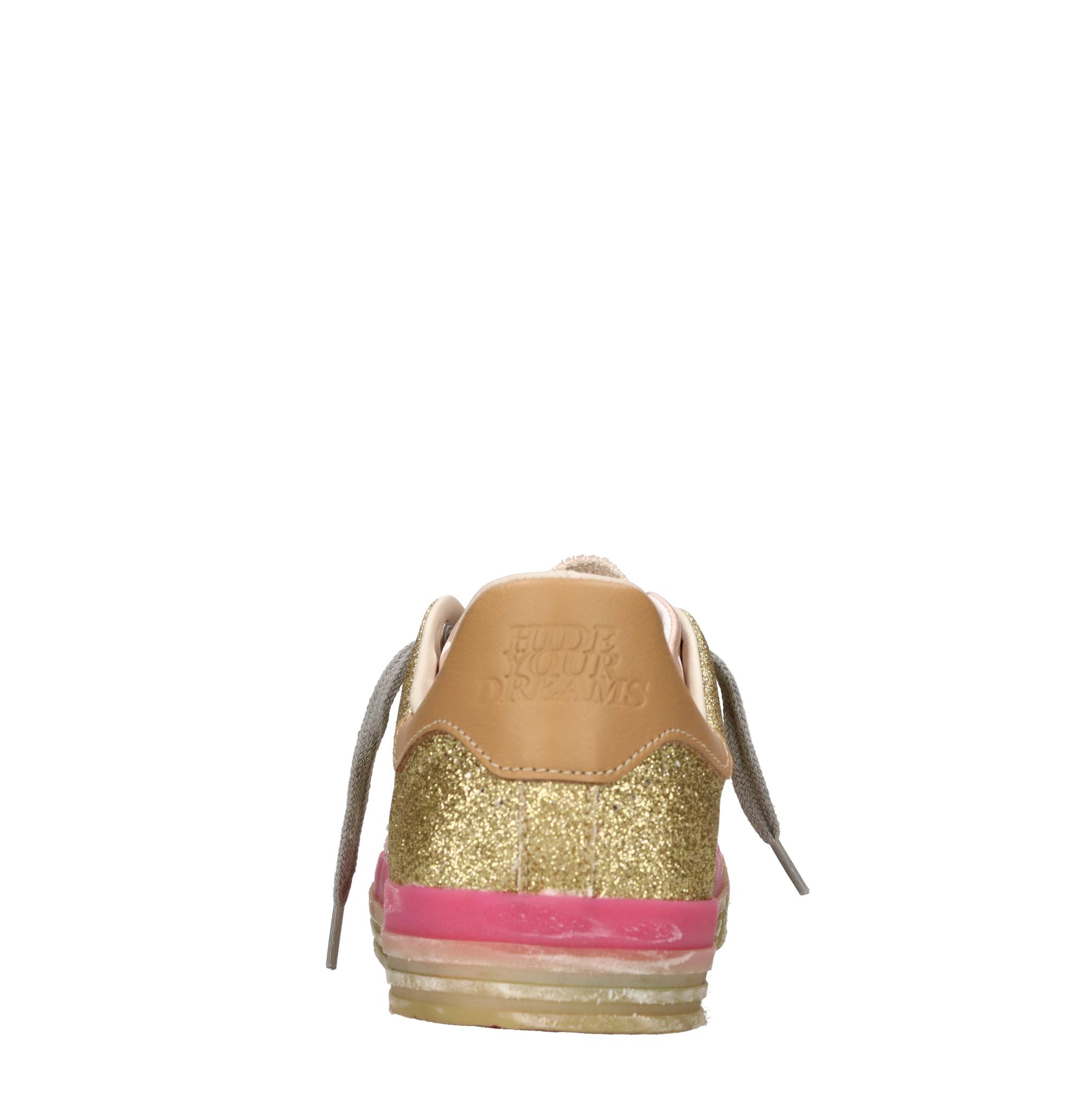 Sneakers in pelle e tessuto. Con glitter e dettagli fluo. Suola esterna in gomma. Tomaia interna in pelle e tessuto.