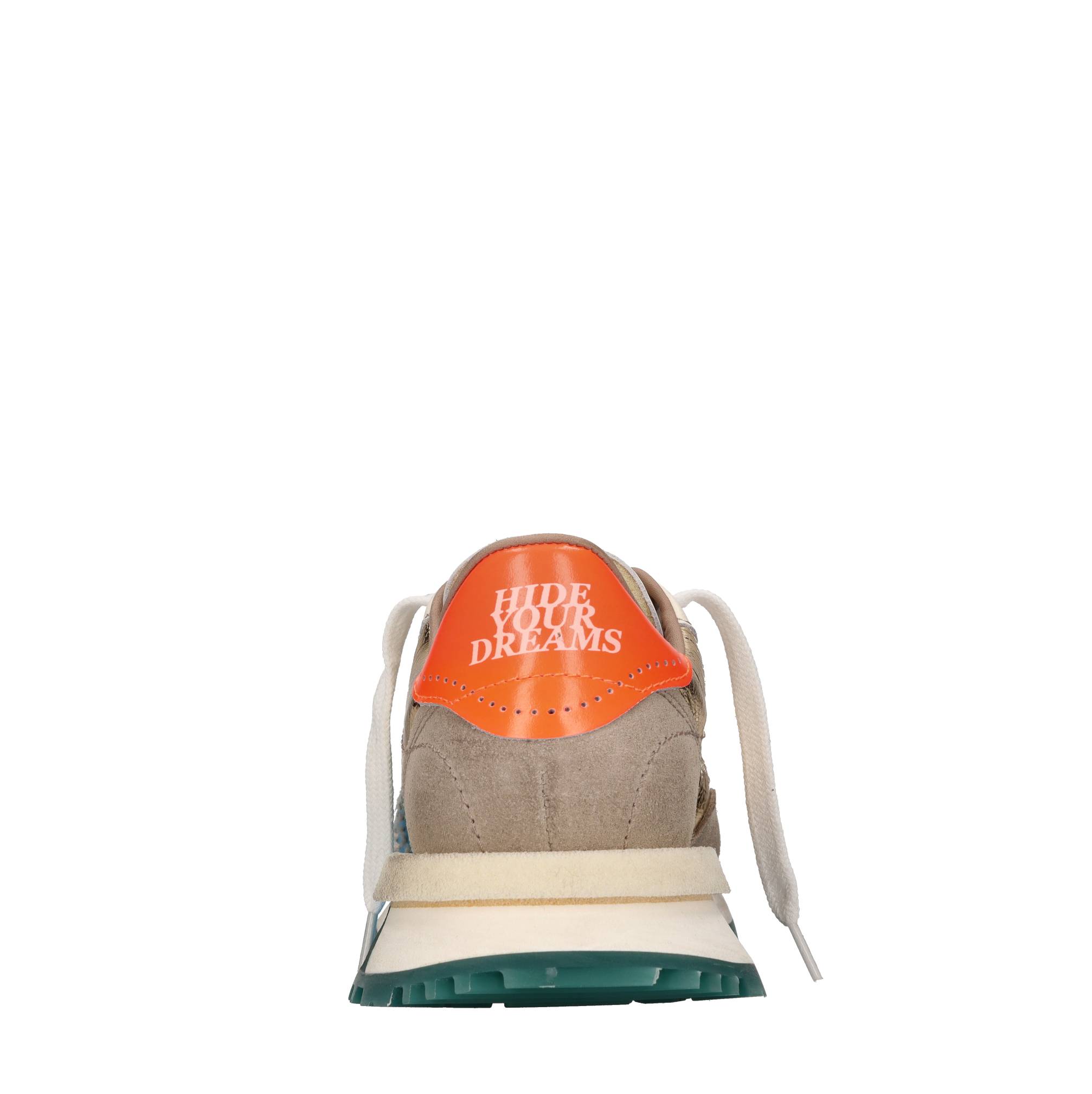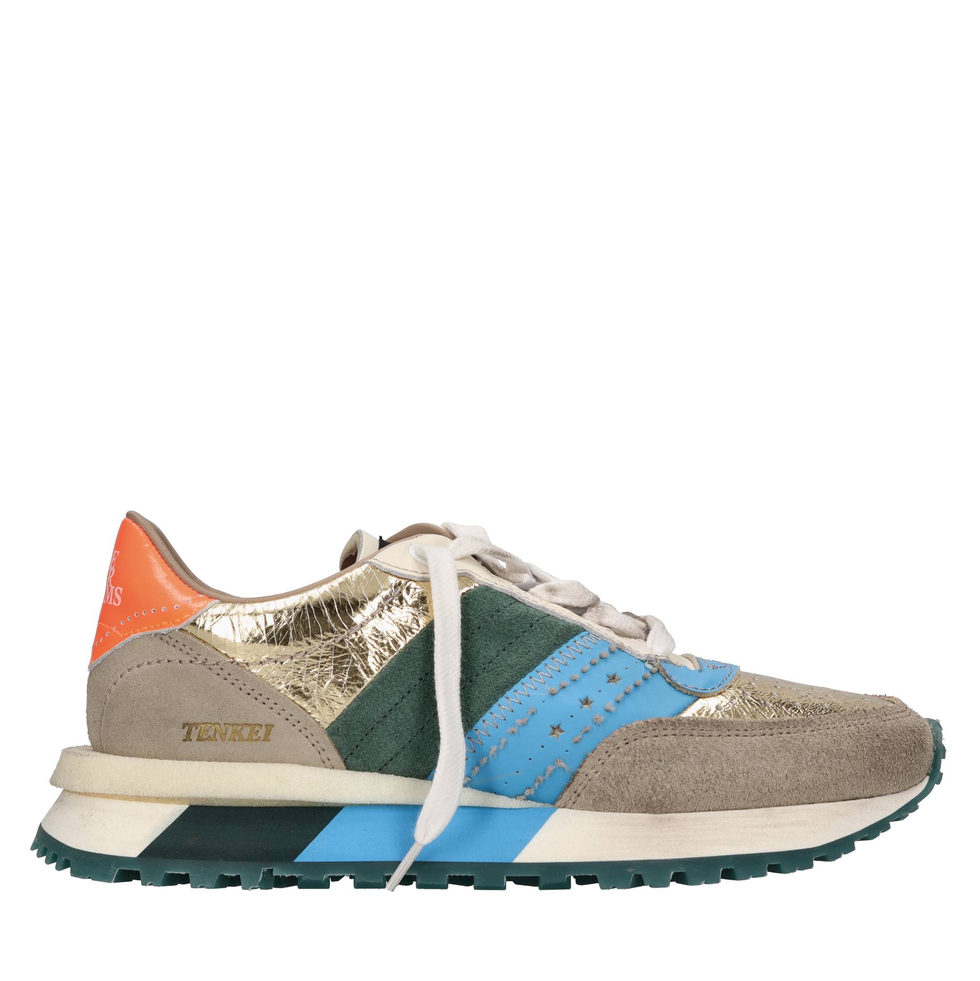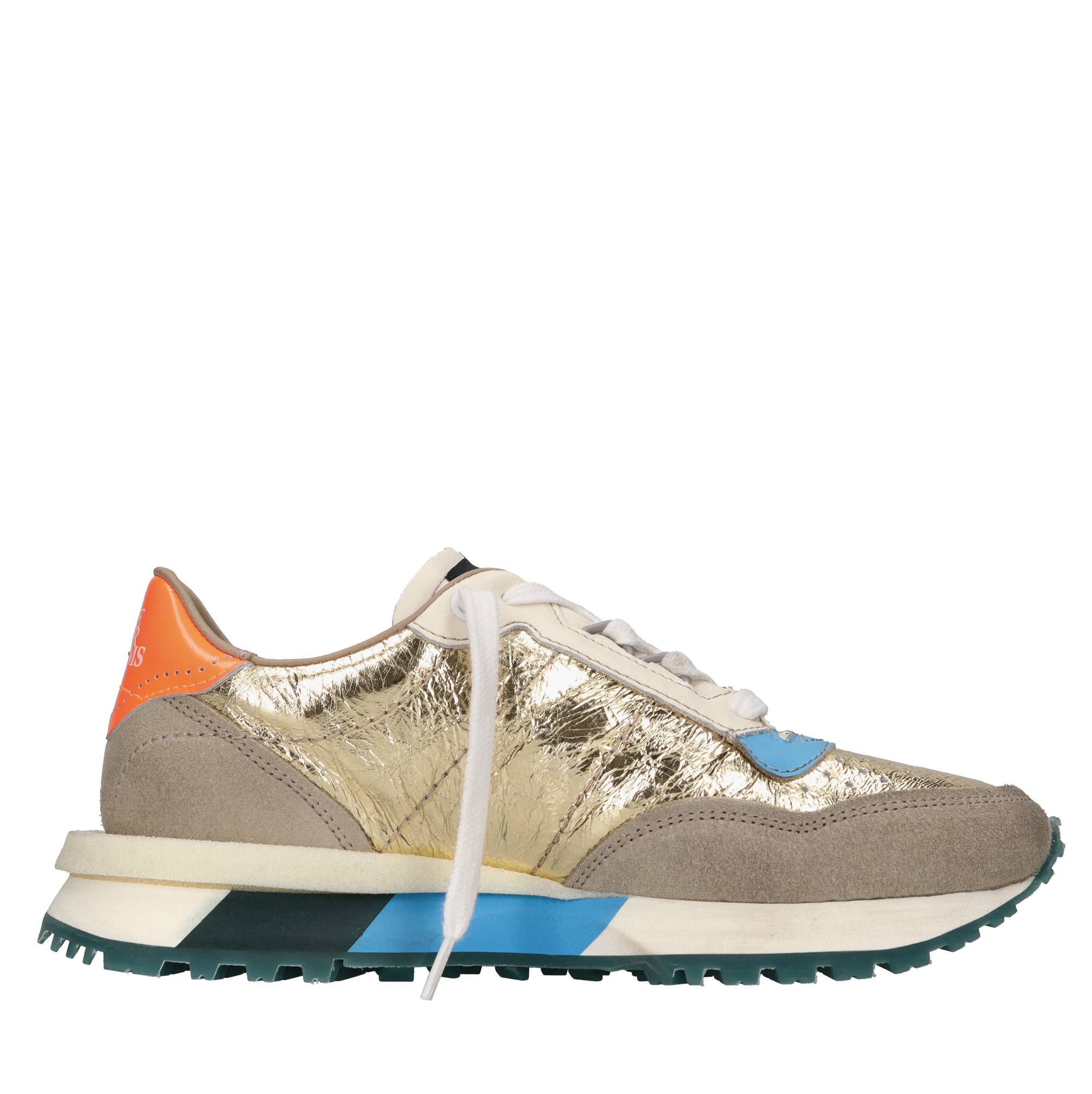 Sneakers in pelle. Suola esterna in gomma. Tomaia interna in pelle. Particolari in arancione fluo e oro.