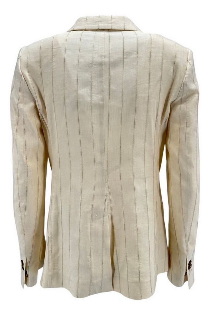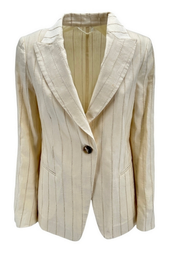 Blazer Kiltie. Modello monopetto, tasche sul davanti, tessuto riga barre', sfoderata. Vestibilità slim. Composizione: 40% viscosa, 34% lino, 26% cotone. Made in Italy.