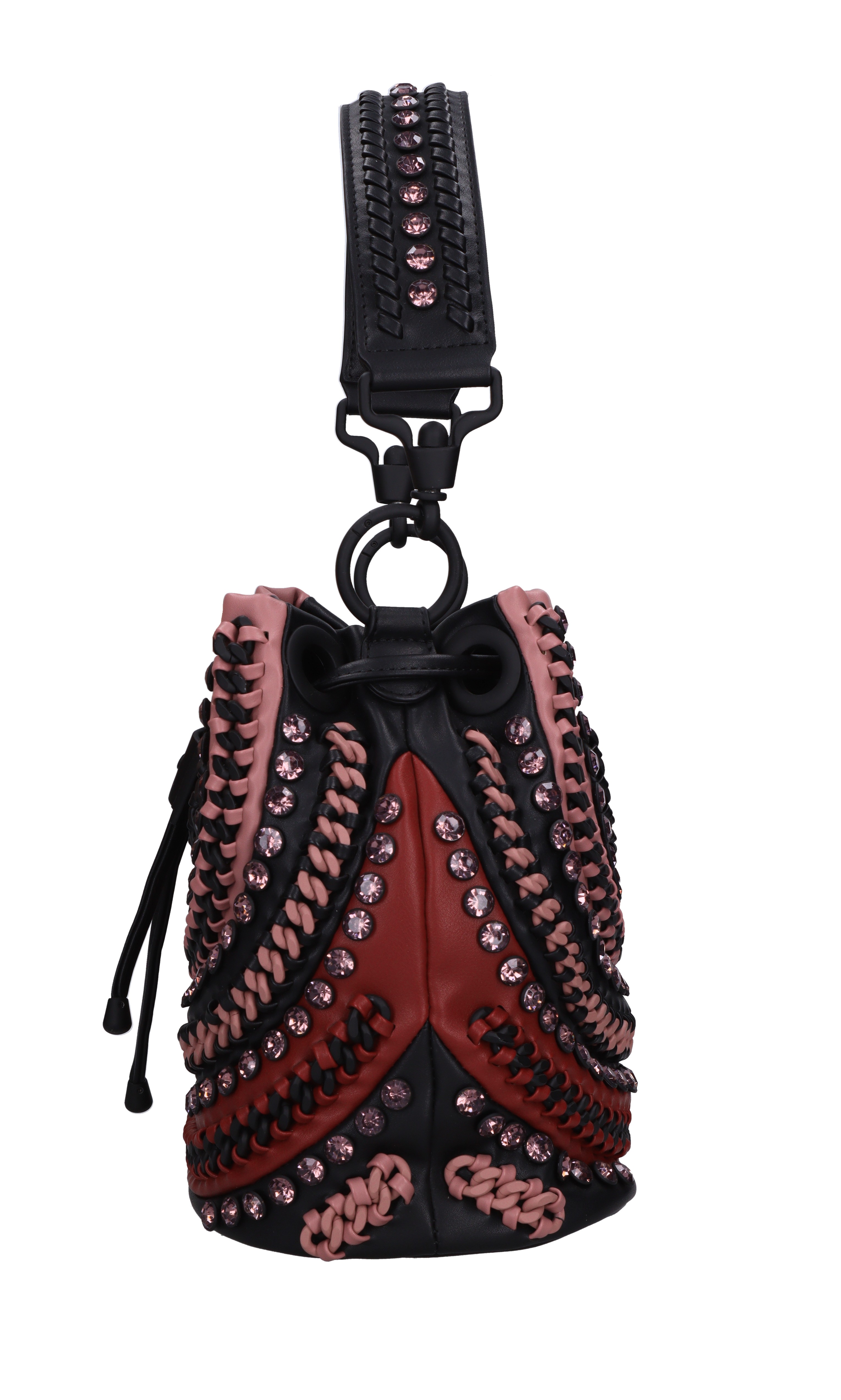 Borsa Andromeda Bucket in ecopelle. 1 comparto. Chiusura a coulisse e bottone a scatto. Tracolla in catena ed ecopelle removibile.