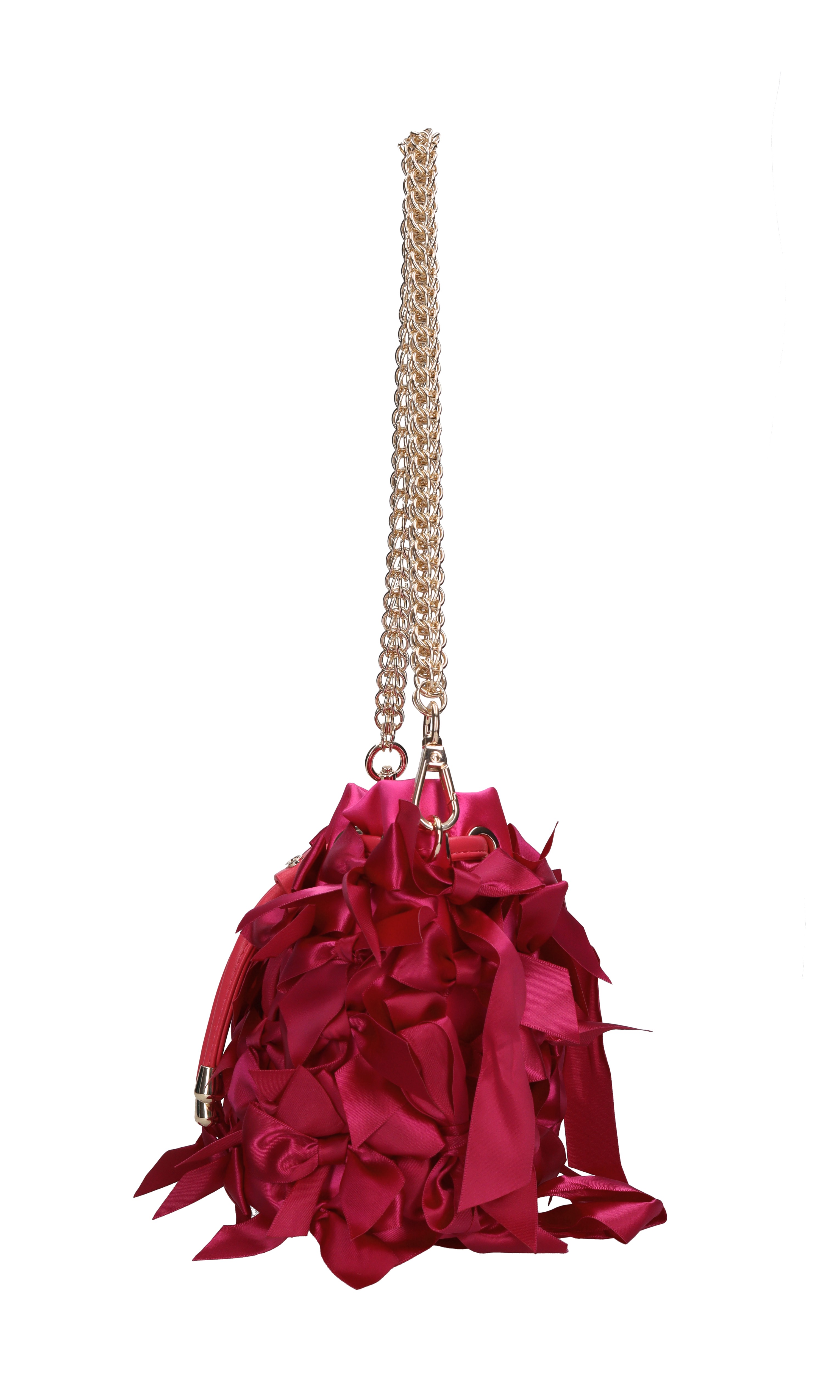 Borsa Night Edition Bows in raso. 1 Comparto. Chiusuraa coulisse. Tracolla e manico golden chain removibili.