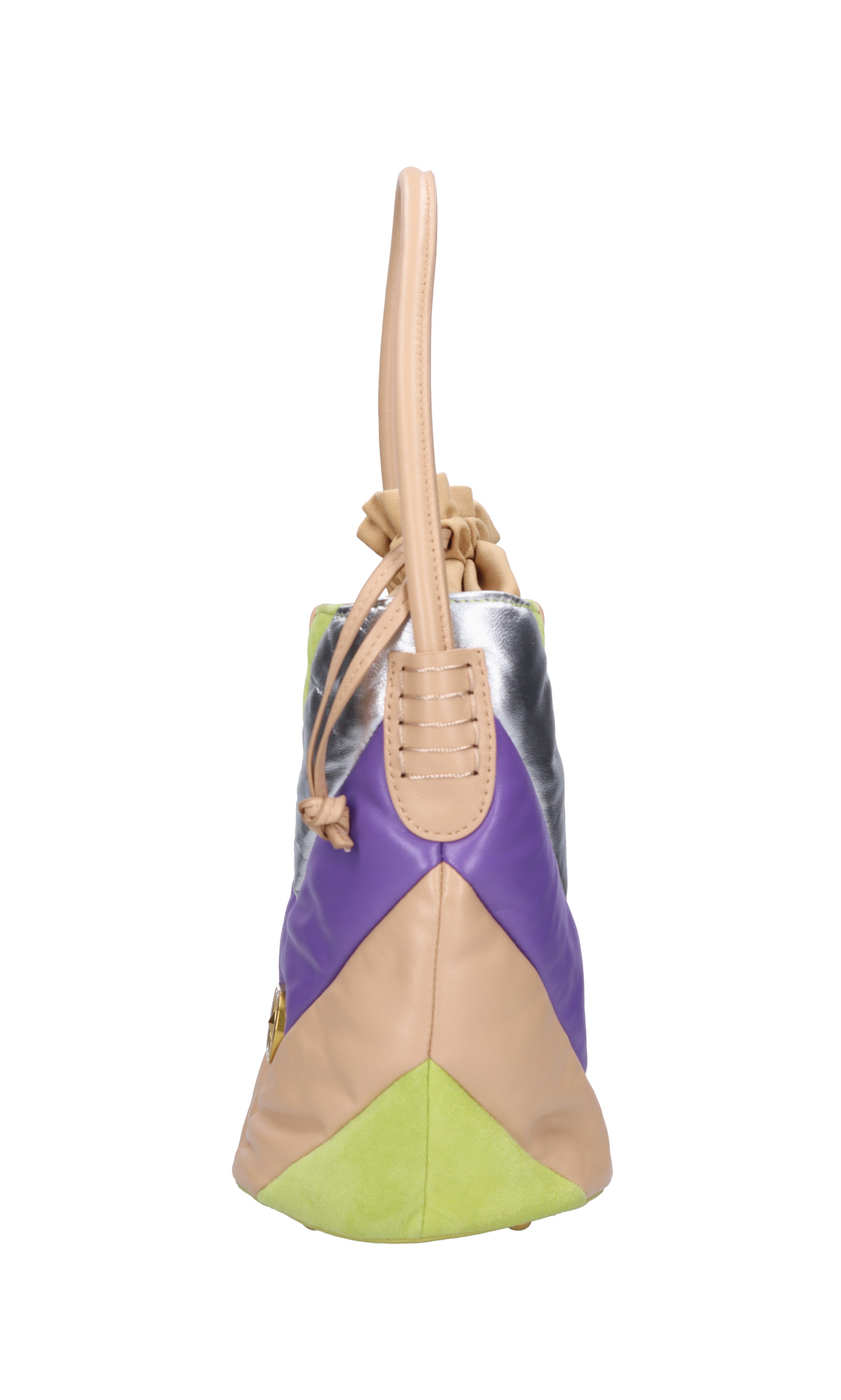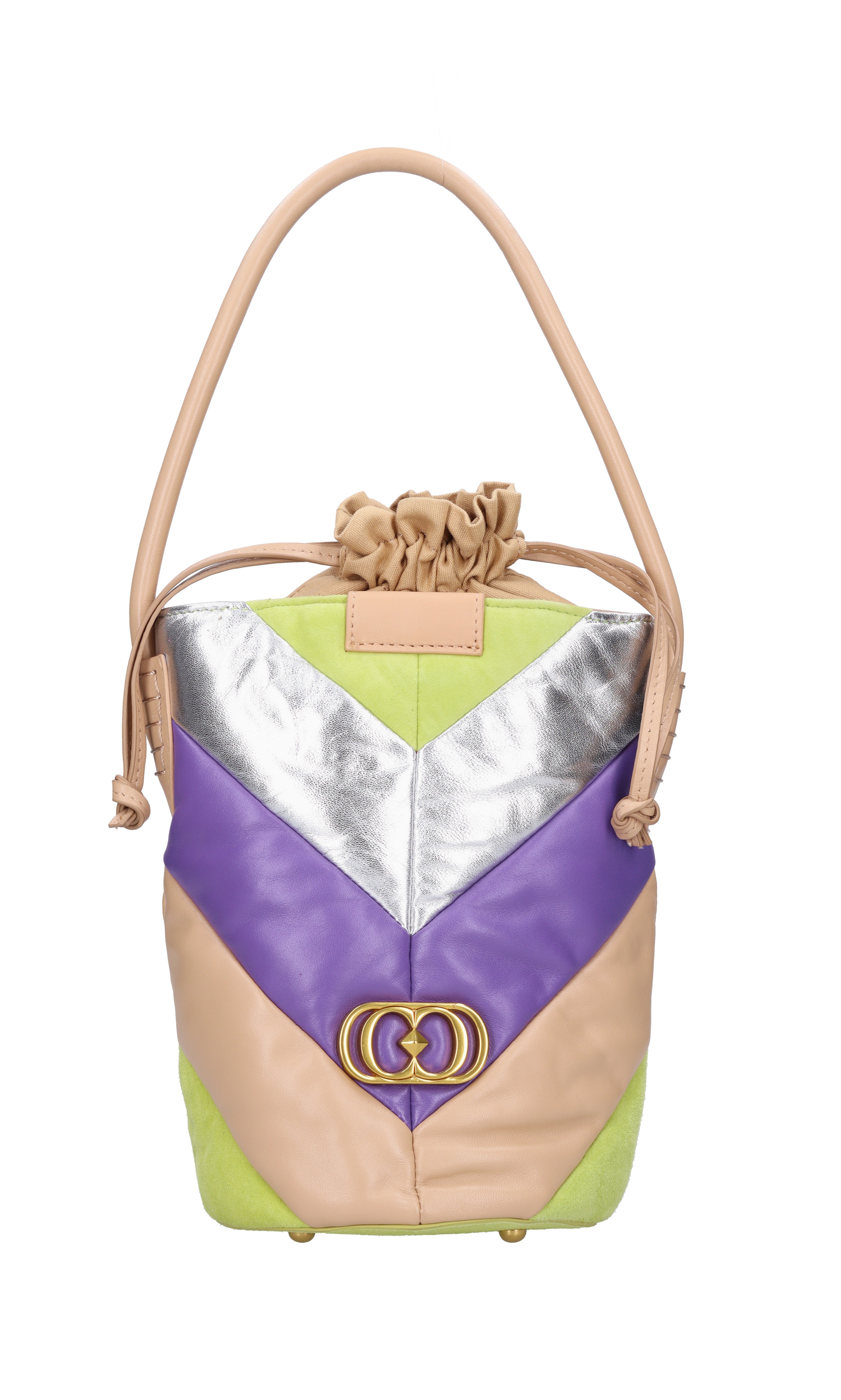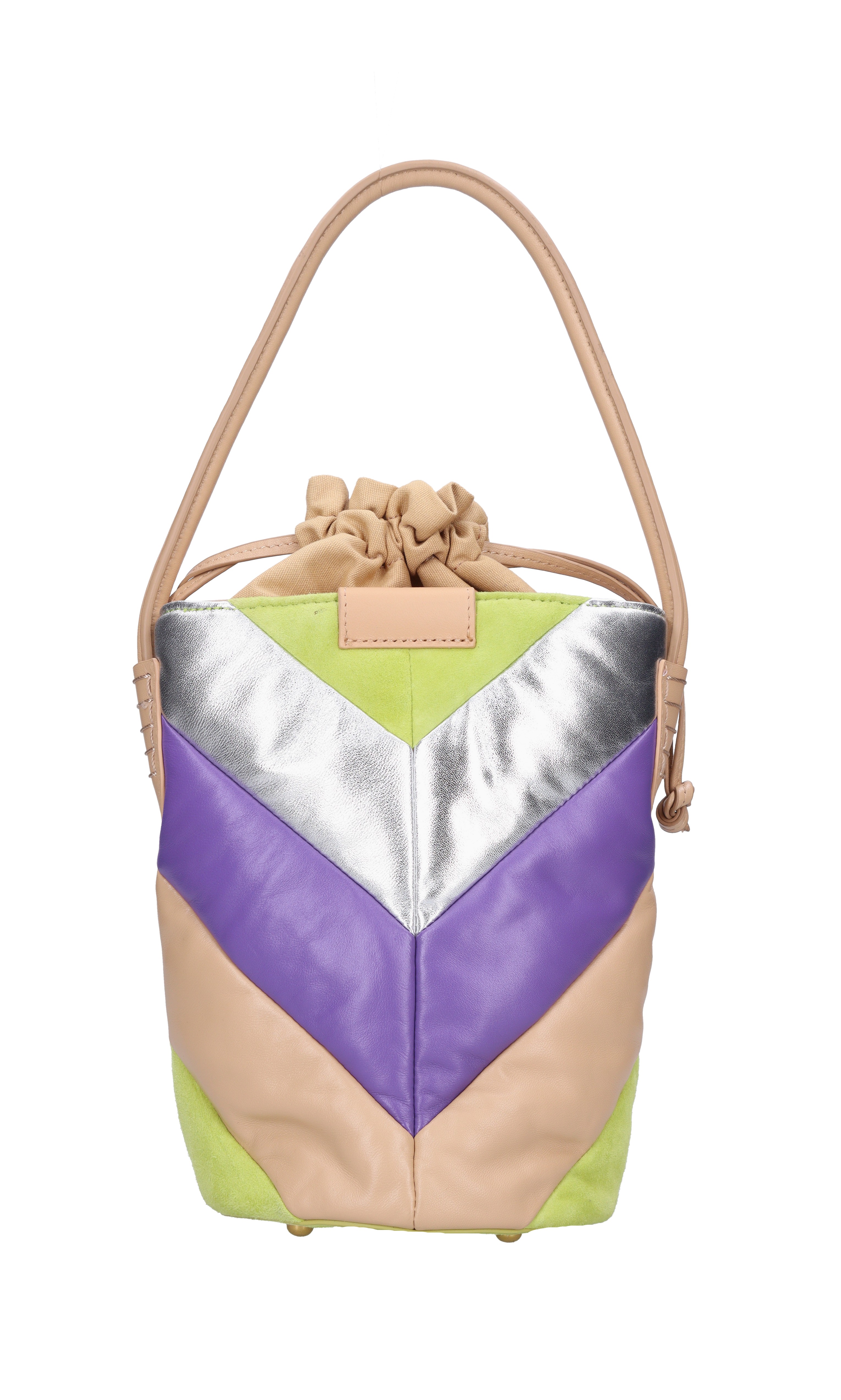Borsa in pelle camoscio e tessuto. 1 comparto. Chiusura con coulisse.