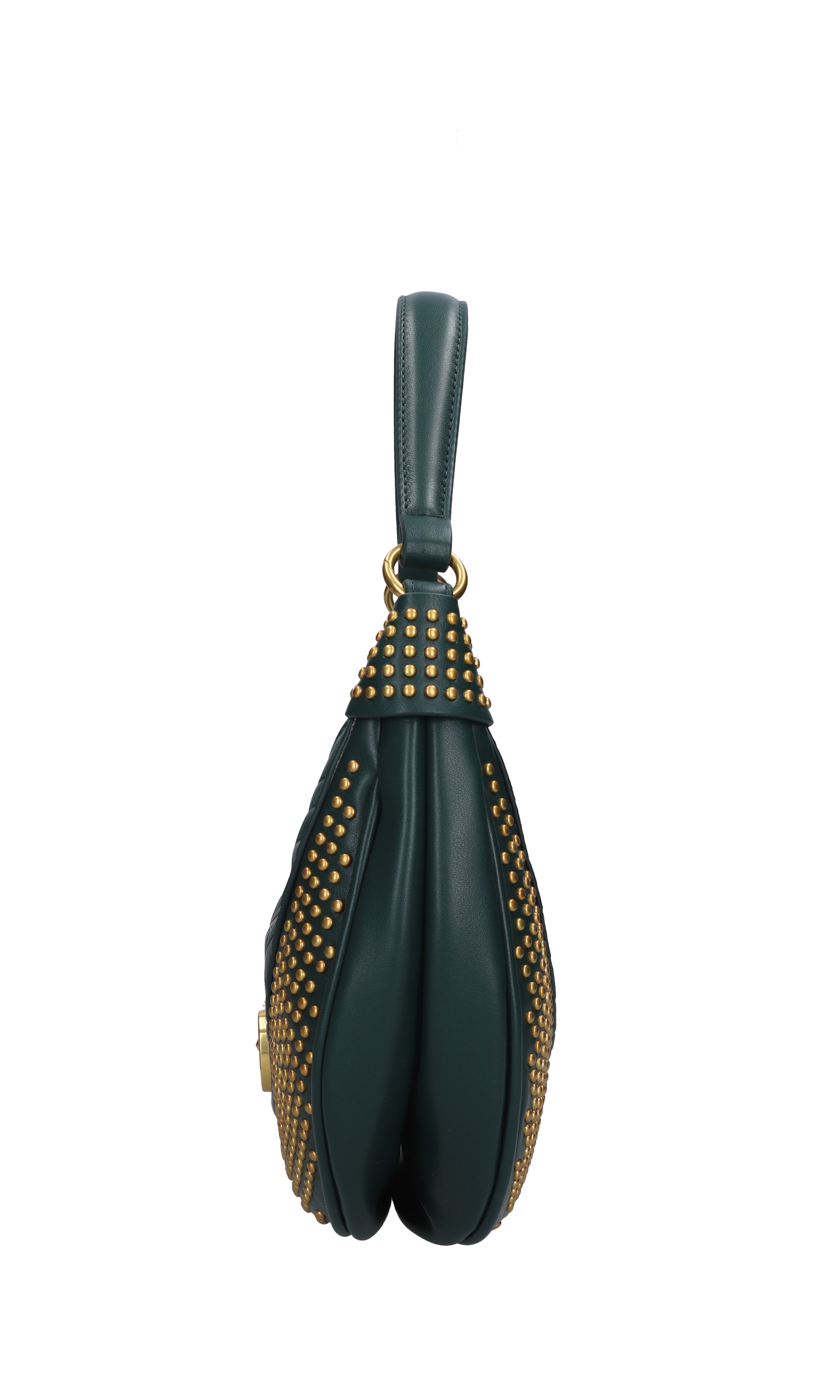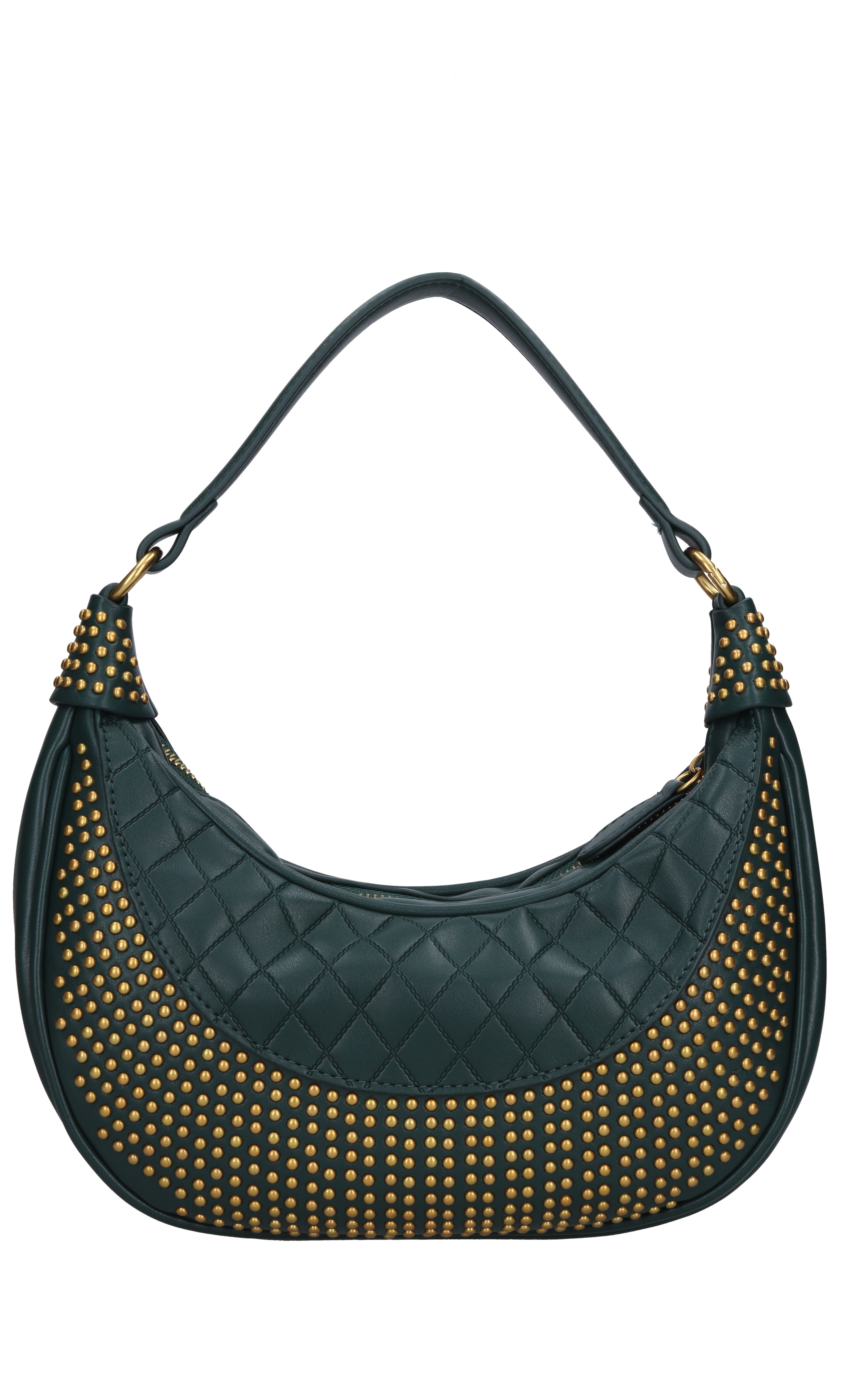 Borsa Heat Waves in ecopelle. Un comparto. Micro borchie color oro. Chiusura con zip. Tracolla golden chain removibile. Manico in ecopelle removibile.