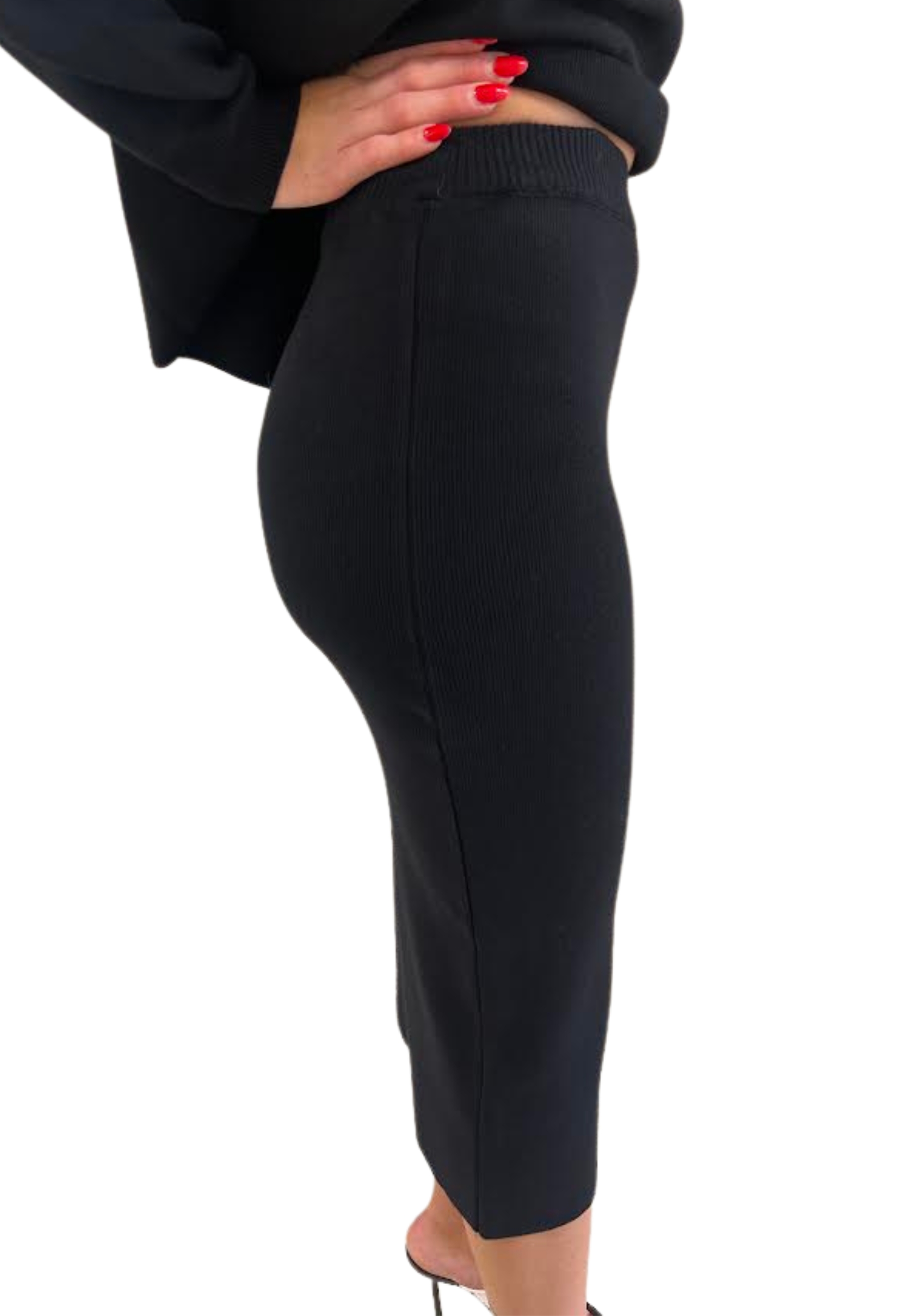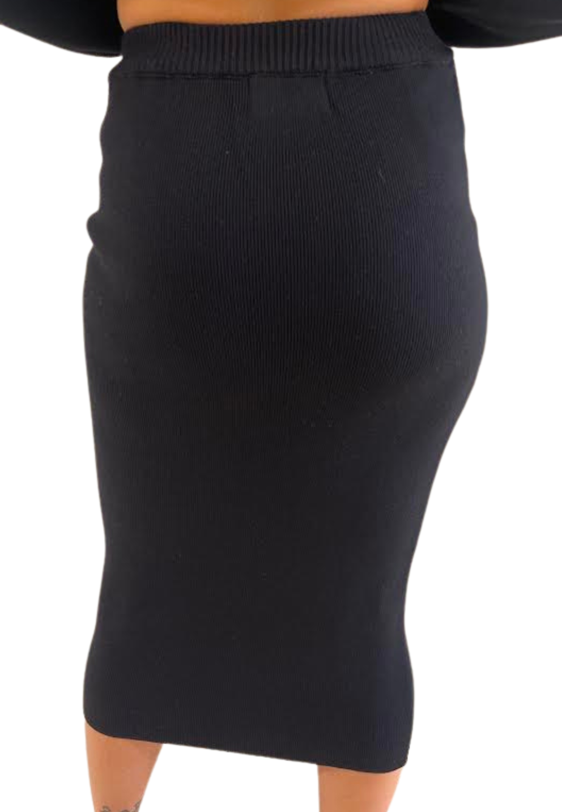 Gonna nera a tubino in maglia a costine, lunghezza sotto il ginocchio. Aderente ed elasticizzata, segue le linee del corpo con eleganza. Stile essenziale e versatile, perfetta sia per outfit casual che più raffinati.