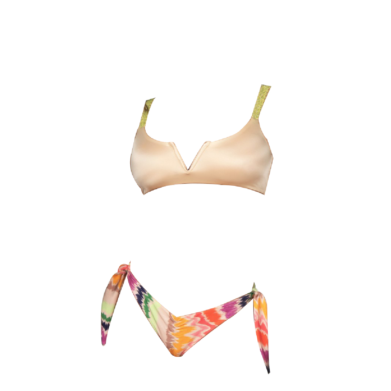 Costume da bagno, collezione SS22 del Mood Silver Lake. Bikini Donna, modello top e slip americano con nodi, in tessuto Lycra lucida a fantasia. Top con ferretto, dotato di imbottitura interna estraibile e dettaglio corallini.
