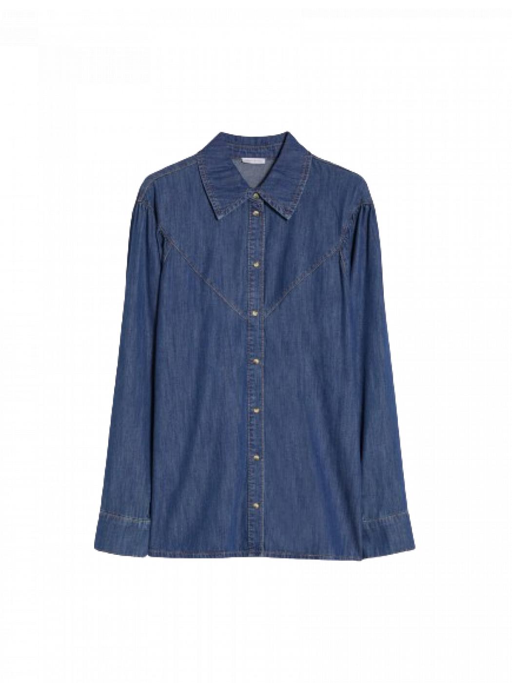 Camicia in denim leggero dal taglio diritto e morbido. Ha il carré a V sul davanti e le maniche a giro basso con arricciature. Spacchetti laterali, bottoni a pressione e impunture a contrasto. Una nuova versione di un grande classico.
