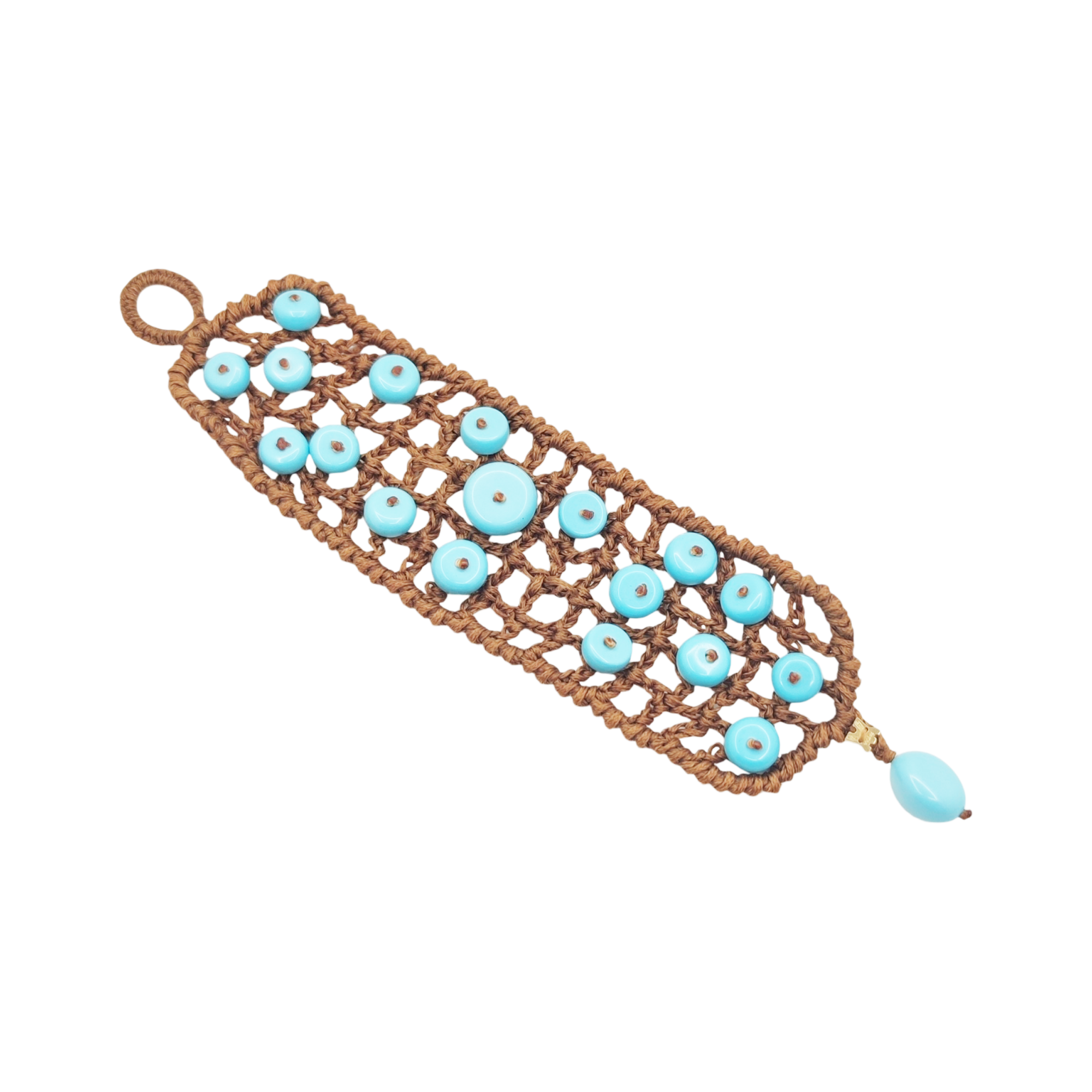 Bracciale a Fascia In Tessuto Marrone Composto Da Pepite In Pasta Di Turchese E Placca Logo Rajola In Oro.